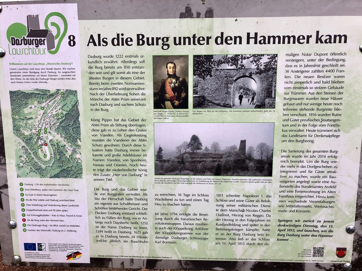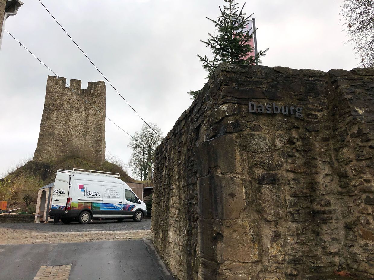 Von der mittelalterlichen Burganlage, der Dasburg, sind noch erhalten geblieben: die Fundamente der inneren Wehrmauer, Teile der äußeren Wehrmauer mit zwei Halbtürmen, Reste des Eingangstores und die Nordseite des 20 Meter hohen Wehrturmes, des Zentrums der wahrscheinlich staufischen Kernburg. Der Grundriss der Burg weist auf den Typus Höhenburg hin. Sehenswert ist ein Gang entlang der Umfassungsmauer, die an ihrer nördlichen Schmalseite ursprünglich eine Brücke hatte und von einem Torzugang und einigen Halbtürmen unterbrochen war.