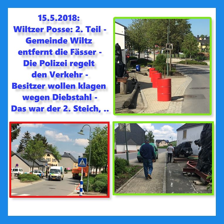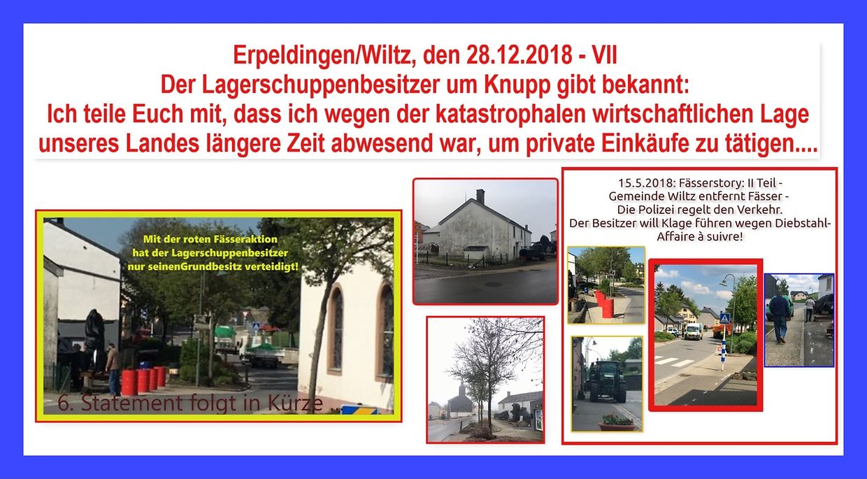 Der Zwist über den Grenzverlauf des Grundstückes eines Privatbesitzers in Erpeldingen bei Wiltz, mit den zuständigen Administrationen ist noch nicht vom Tisch, auch wenn die roten Fässer des Grundstückseigentümers, welcher dieser als Grenzmarkierung aufgestellt hatte, von der Gemeinde entfernt wurden.