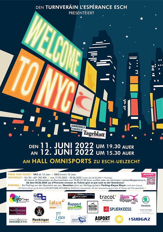 D'Thema vum Gala ass dëst Joer Welcome to NYCity. Fir Tickete weg eng - Email maachen un contact@esperance.lu bis den 2.6. Dono ginn et Tickete nëmmen nach an der Oweskees.