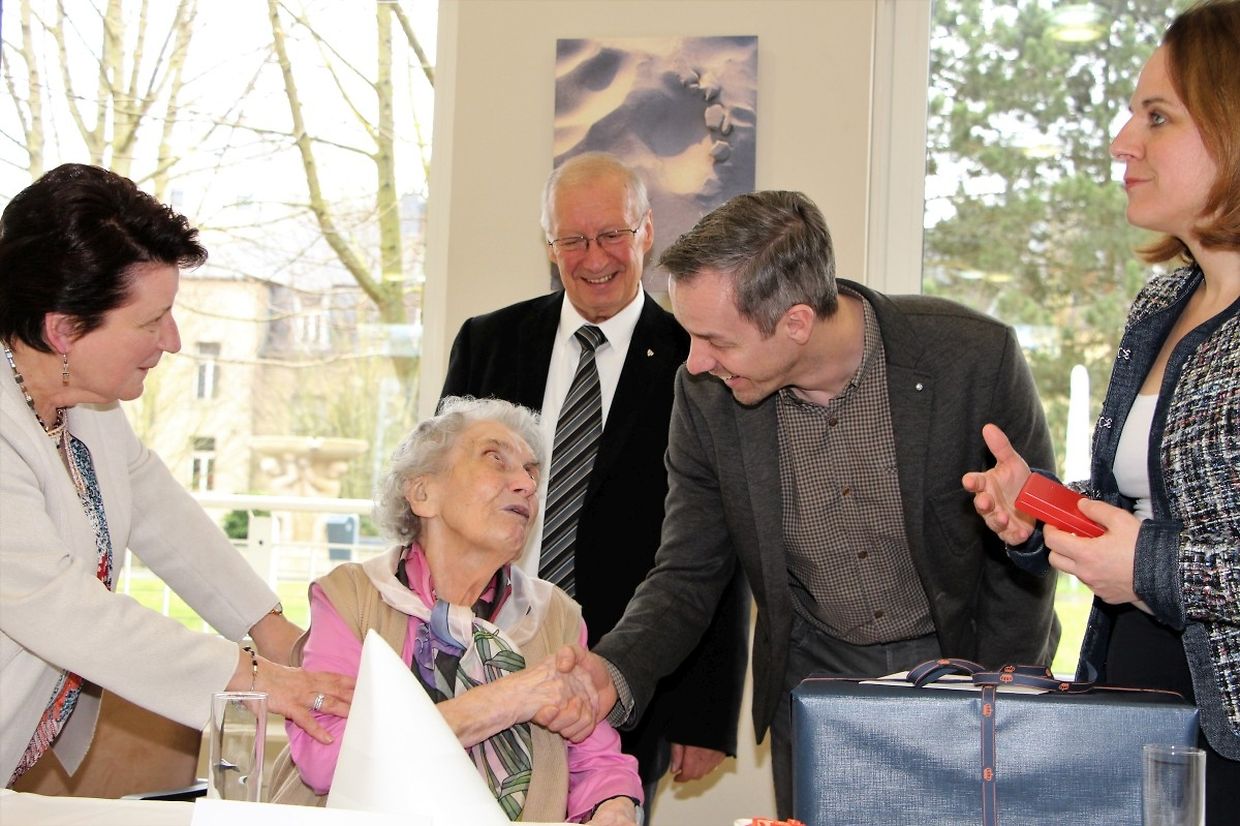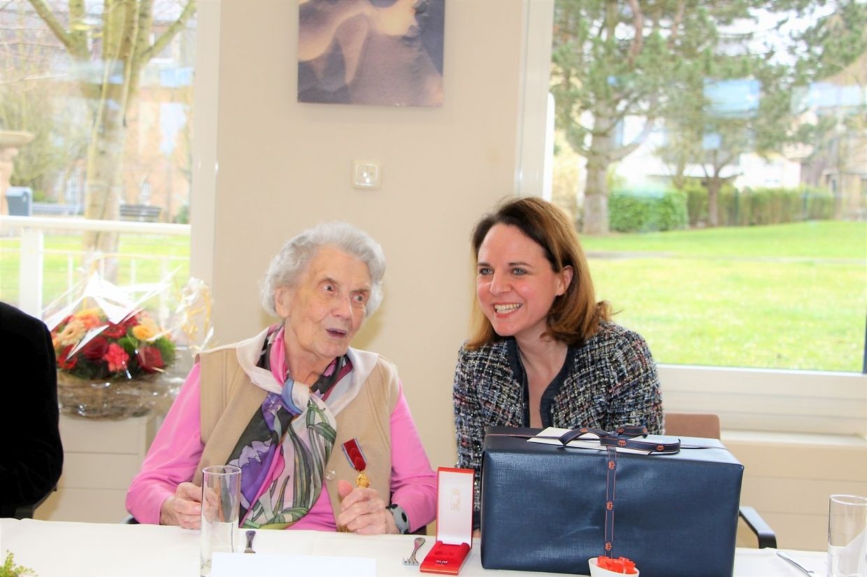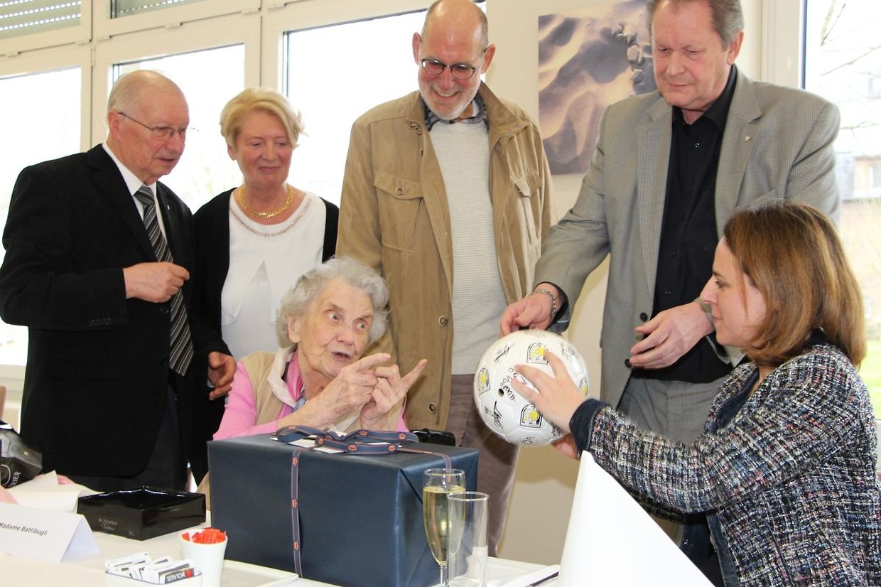 Während der Feier am 30. März 2018 zeichnete Familienministerin Corinne Cahen die Jubilarin mit dem Ordre du mérite aus. Ein weiterer emotionaler Moment war ohne Zweifel, als der Jeunesse-Präsident Jean Cazzaro der hundertjährigen Dame einen Fußball ihres Lieblingsvereins überreichte. Unterstützung bekam er von Vizepräsident Marcel Detaille.