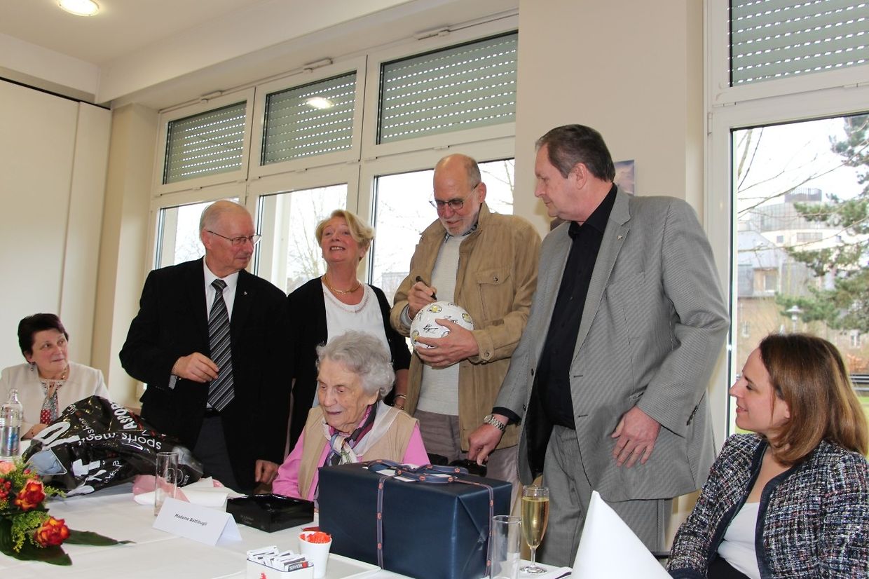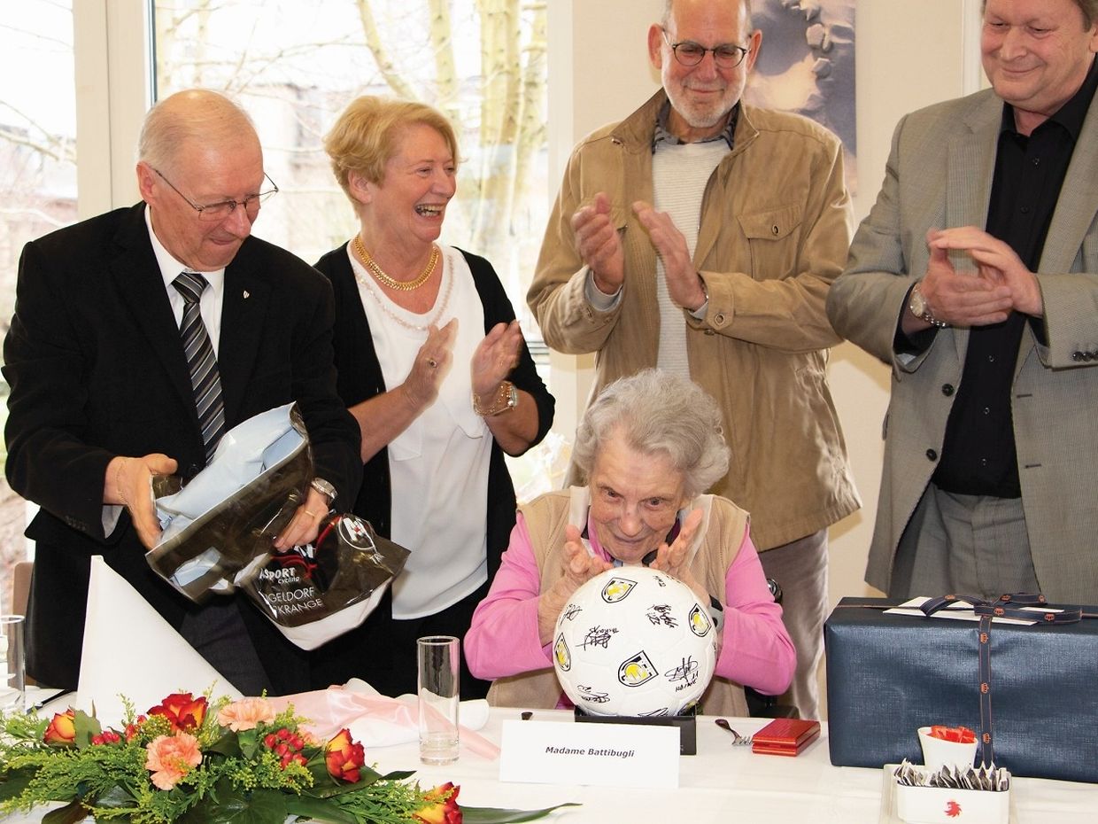 Für Angèle Battibugli, am 30. März 1918 in Esch geboren, war ihr 100. Geburtstag ein wahres Heimspiel. Eine Feier mit Familie, Freunden und Ehrengästen aus Politik und Sport. Austragungsort war das Escher Seniorenheim Op der Léier. Auf der offiziellen Gästeliste standen neben Familienministerin Corinne Cahen und Bürgermeister Georges Mischo auch Mitglieder der SERVIOR-Direktion und der Amicale des Hauses. Als ganz besondere Ehrengäste waren Vertreter der Jeunesse vor Ort. Denn das Herz von Angèle Battibugli schlägt seit jeher für den luxemburgischen Rekordmeister. Und wer mit 100 Jahren noch immer Vereinsmitglied ist, der bekommt auch vom Vereinspräsidenten zum Ehrentag gratuliert.