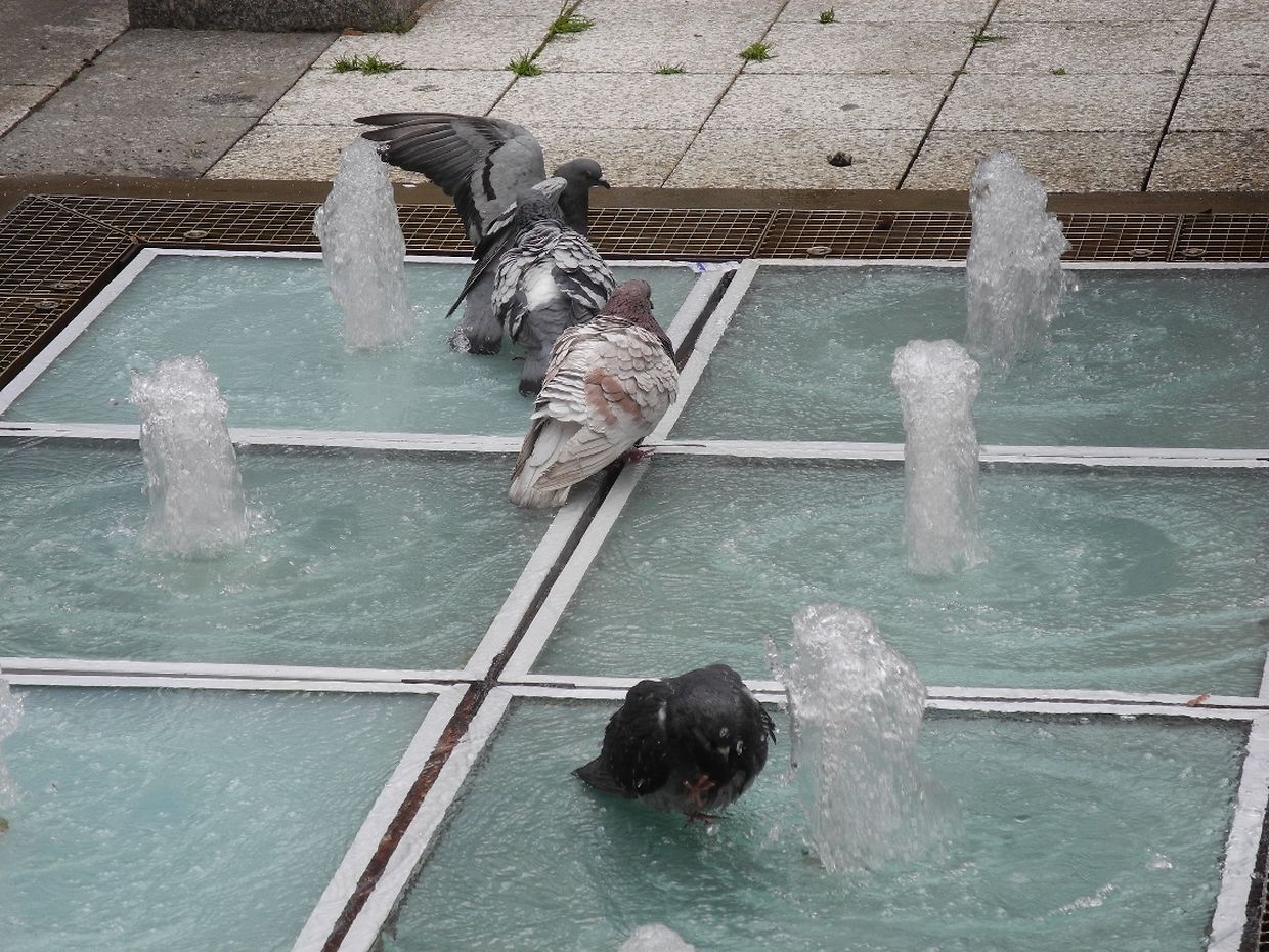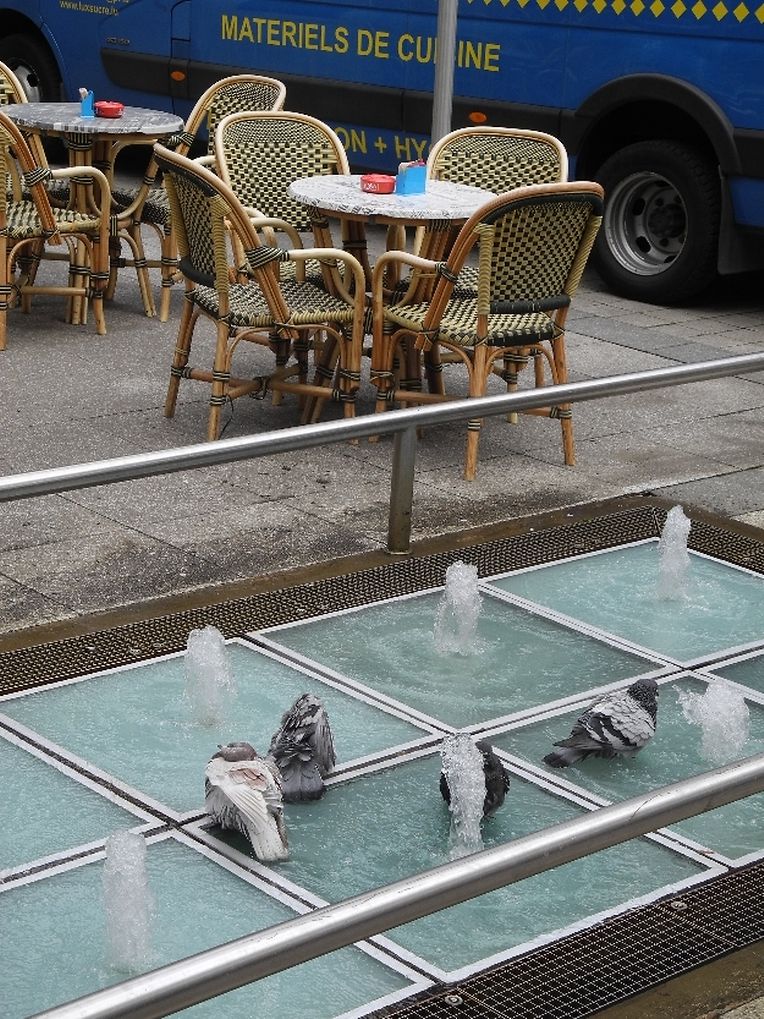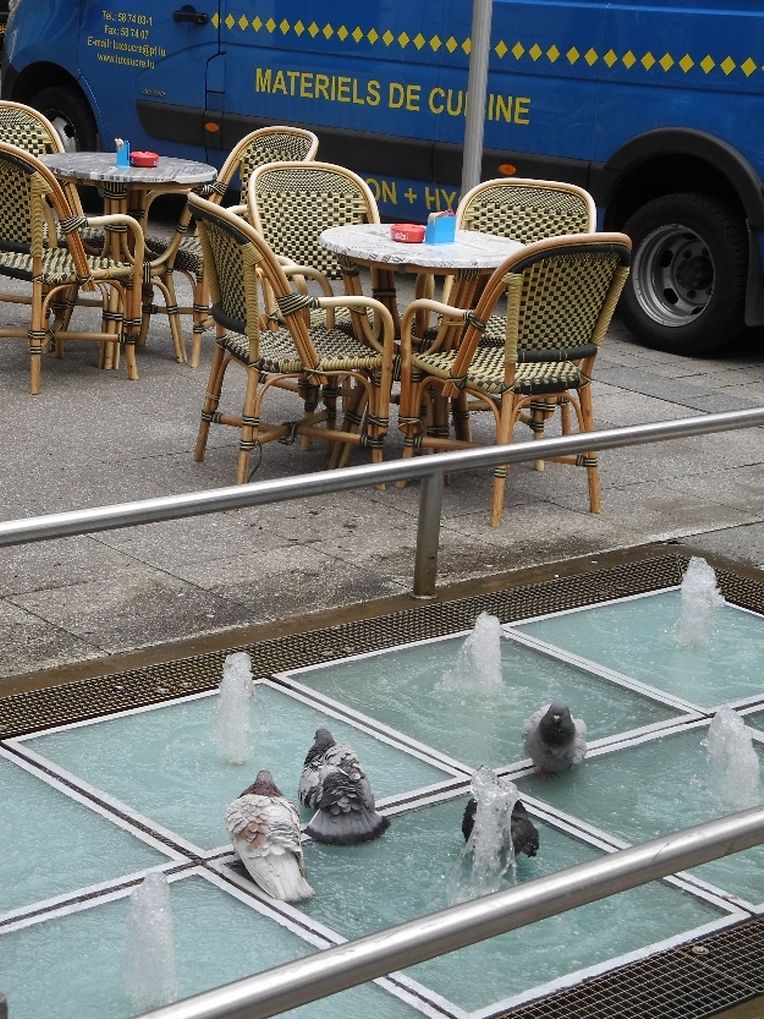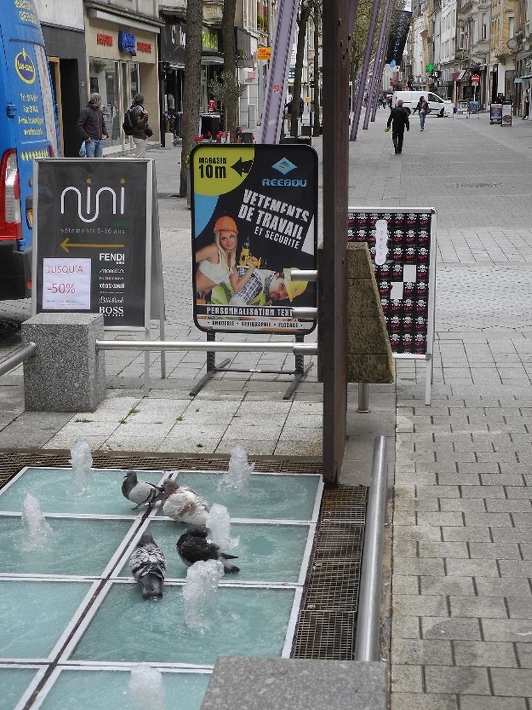 In Luxemburgs längster Fußgängerzone, der Alzettestraße in Esch/Alzette sorgte eine kleine Gruppe Tauben dieser Tage für die Belustigung der Fußgänger, als sie sich über die Wiederinbetriebnahme der Springbrunnenanlage freute und diese auch sogleich zum obligaten Frühjahrsbad nutzte.