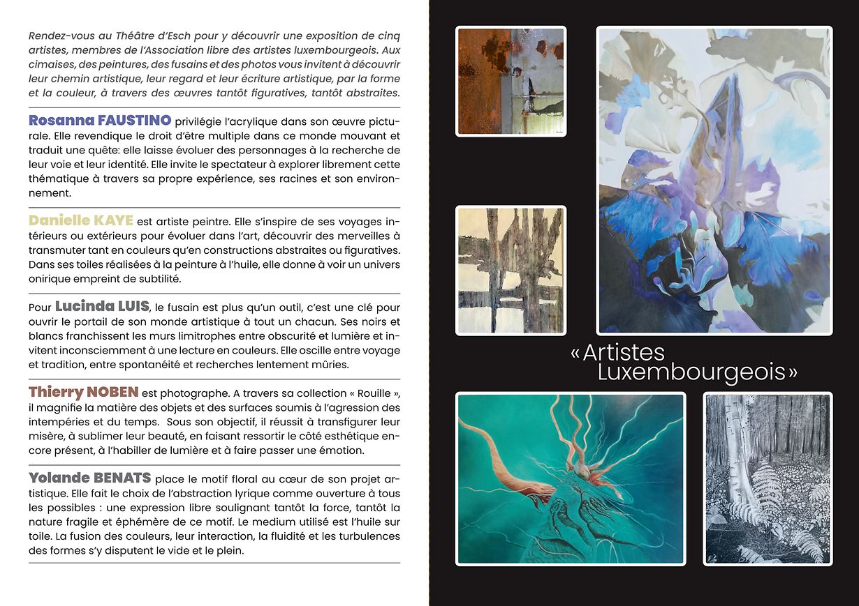Aux cimaises du Théâtre d’Esch-sur-Alzette, des peintures, des fusains, des photos de cinq artistes luxembourgeois. Rosanna Faustino, Danielle Kaye, Lucinda Luis, Thierry Noben et Yolande Benats vous y invitent à découvrir leur regard et leur écriture artistiques par la forme, la matière et la couleur à travers d’œuvres tantôt figuratives, tantôt abstraites. L’exposition est ouverte du 19 avril au 21 mai 2022, du mardi au samedi inclus, de 14 à 18 heures.