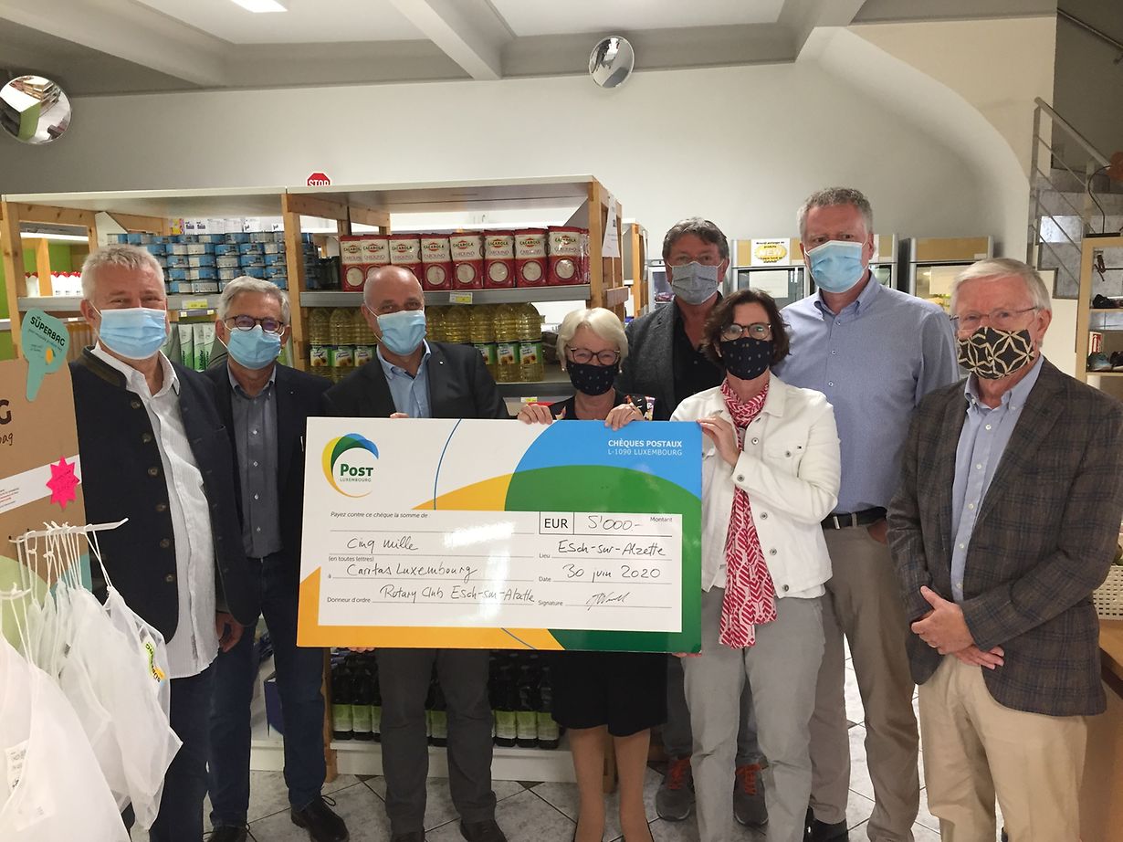 Lors d’une rencontre qui a eu lieu le 30 juin 2020, Monsieur Jean-Paul Wurth, président 2019/20 du « Rotary Club Esch-sur-Alzette », a eu le plaisir de remettre à Caritas Luxembourg, représentée par Madame Marie-Josée Jacobs et Madame Caroline Theves, un chèque de 5.000 euros. Madame Marie-Josée Jacobs a vivement remercié tous les membres du « Rotary Club Esch-sur-Alzette » pour leur geste généreux et leur soutien régulier en faveur des initiatives de Caritas Luxembourg, surtout en ces temps de crise où l’épicerie sociale compte 20% de clients en plus.