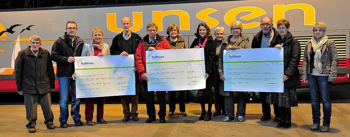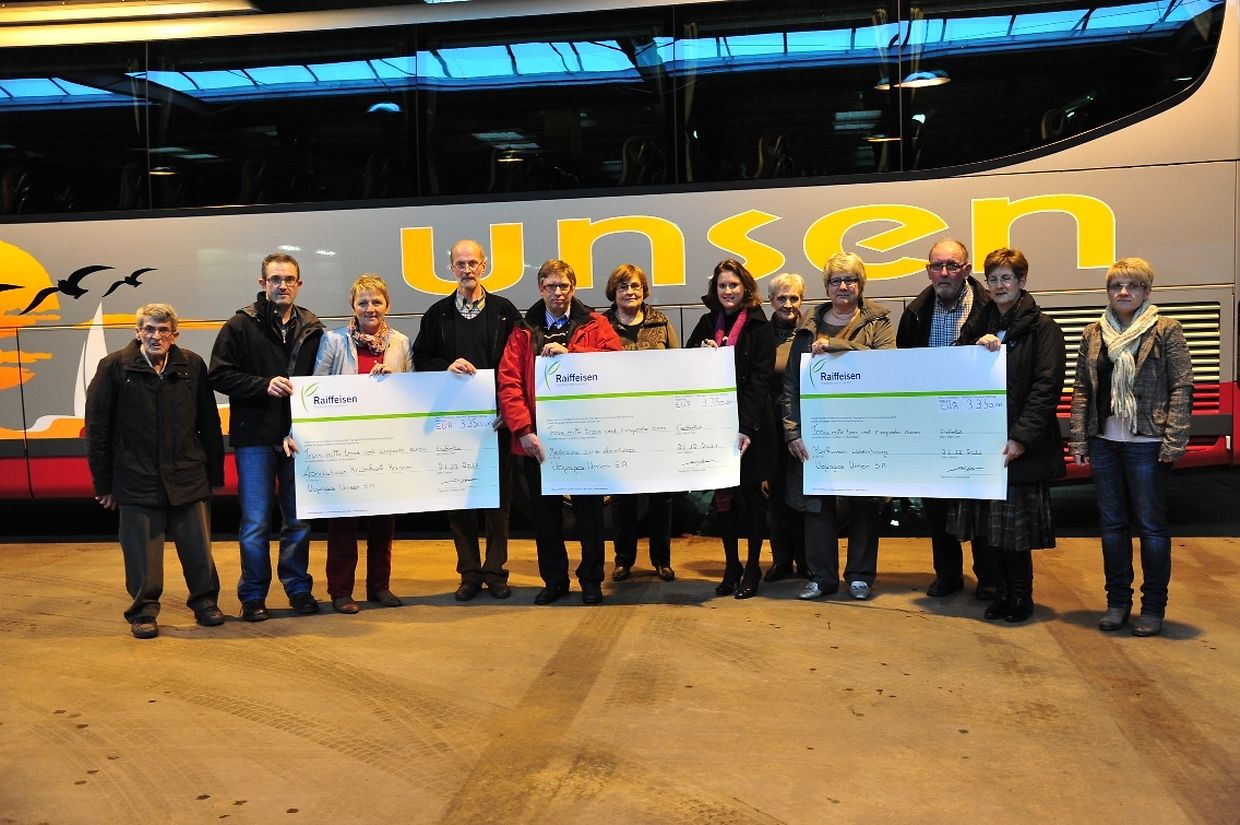Sou wie den Guy Unsen, Junior-Chef vun Voyages Unsen am Kader vun der Scheckiwerreechung dese Mëttwoch, am Sëtz vu Voyages Unsen zu Eischt betount huet , huet d'Firma Unsen dest Joer als renge Familiebetrieb hirt 50 Joer Bestoen gefeiert. De 15 Mee, op der Porte Ouverte waren méi wéi 2 500 Besucher komm, déi vun de Leit vun der Firma, an de Veräiner vun den Nopeschdierfer zervéiert goufen, an sech och spontan bereet erklärt hun, den Erléis vum Dag un Hëllefsorganisatiounen weider ze gin. Esou koumen 6 000 Euro zesummen. Den 28. Oktober, den Dag vun der eigentlicher Geburtstagsfeier vu Voyages Unsen koumen nach ee Mol ronn 4 000 Euro derbéi an déi Zomm gouf dunn duerch ee Geste vun der Firma Voyages Unsen nach no uewen opgeronnt. Esou konnten die Verantwortlech vun den Hëllefsorganisatiounen: Parkinson Lëtzebuerg, Fondatioun kriibskrank Kanner an Médecins sans frontières- Luxembourg je ee Scheck iwert 3 350 Euro entgéinthuelen. No hirem MERCI, hun di verschidden Organsatiounen hirt Aufgabegebiet kurz virgestallt, wou dess bedéitend Spenden och zum Asaatz kommen wärden.