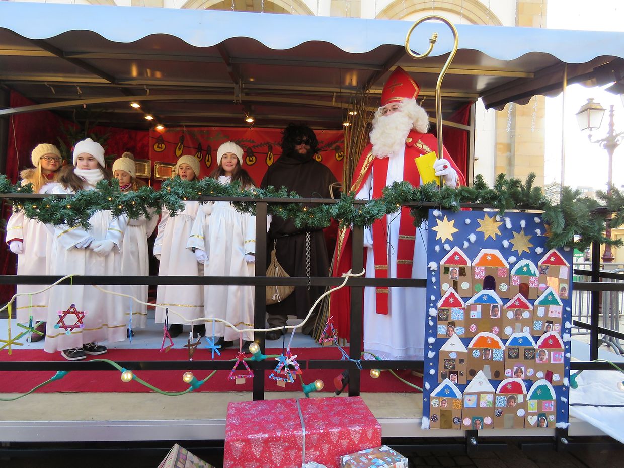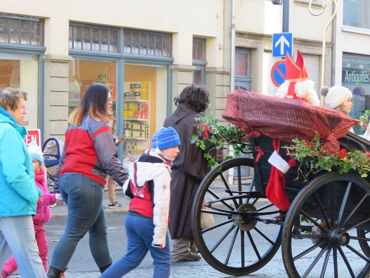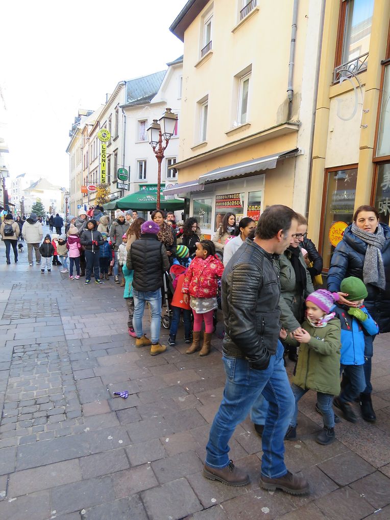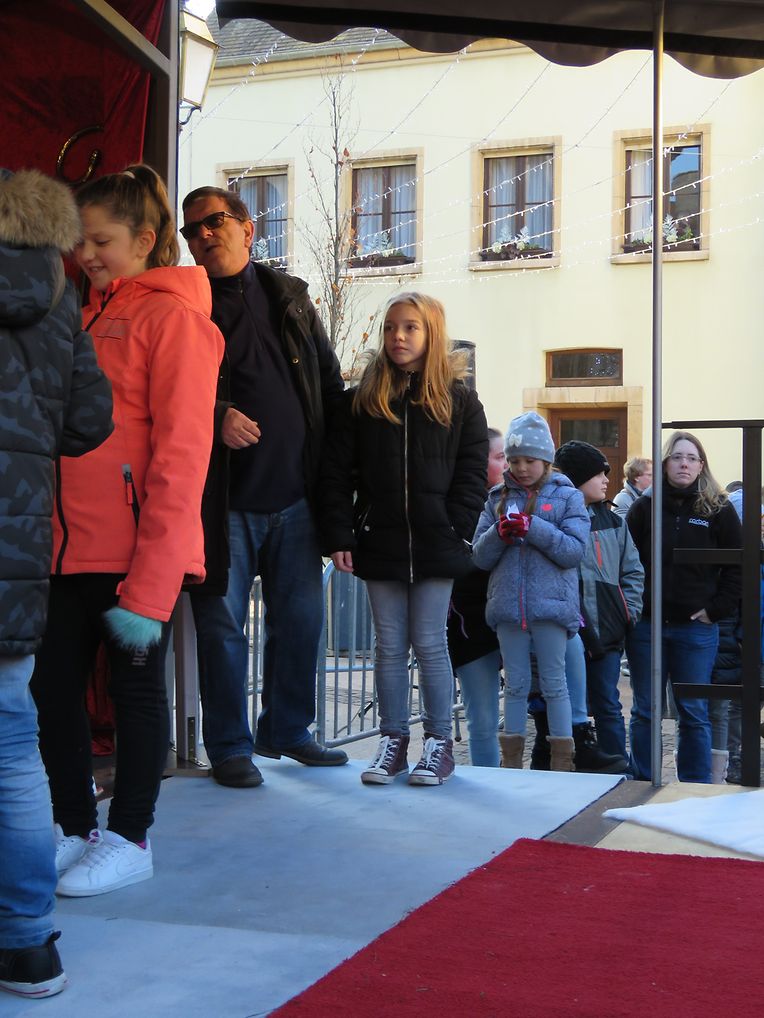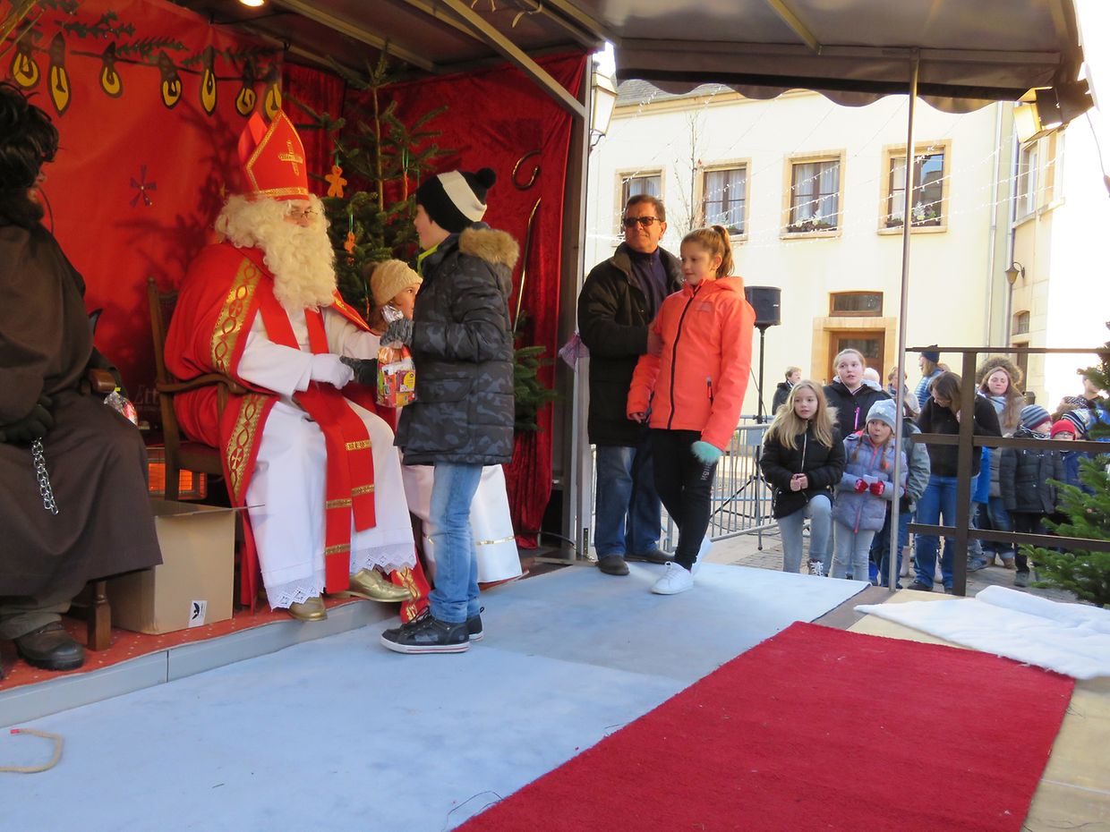 Iwwerdeems wou iwwert Lautsprecheren Nikloslidder gespillt goufen, sinn dunn d’Kanner mat hiren Elteren op d’Tribün gelooss ginn. De Kleeschen huet jidderengem d’Hand gedréckt, en an d’An gekuckt an nogefrot, ob alles déi lèscht Wochen an der Reih wor. Him gouf näischt Schlëmmes gebeicht, well jidderee krut eng gudd gefëllten Tut. Den Houséker, deen derniewent souz, huet kengem eng Rutt brauchen ze ginn. Dat war gudd esou, well d‘ Schlaang ass laanscht de grousse Käschtebam bis bal bei d’Pensionnat gaang, sou datt déi lèscht nit ze laang op hir Tiitchen hu misse waarden. An hirer Begeeschterung wäert nit jidderee gemierkt hunn, dass d’Chrëschtbeliichtung schonns ageschallt war. De Kleeschen hat awer gläich dat schéint LED-Zelt an Uecht geholl, dat och dëst Jor aus der Plaz vrun der Kierch eng gemittlech Stuff zaubert.