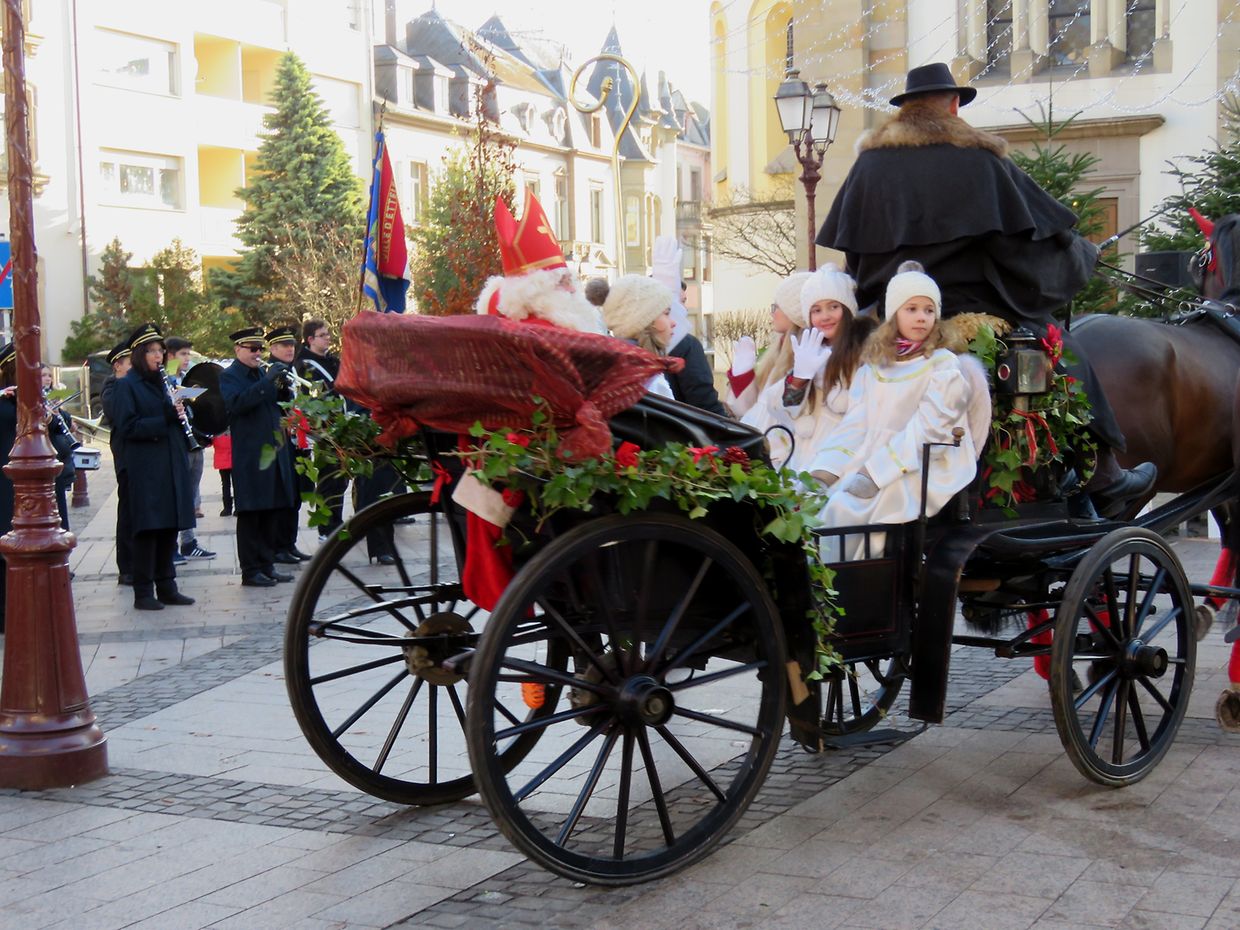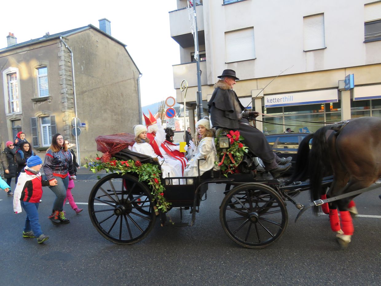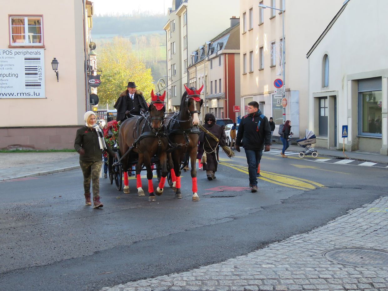 Haut, den 2. Dezember, huet de Kleeschen sech Zäit geholl, fir déi brav Kanner zu Ettelbréck besichen ze kommen. Méih schéin hätt d’Wieder nit kënne sinn. Keng eenzeg Wollék war um Himmel ze gesinn, wéi den hellege Mann mat dem Houséker um halwer dräi op der Gare aus dem Zuch geklomm ass. Du gouf deen héige Besuch vum de Gemengenautoritéiten häerzlech begréisst an d’Ettelbrécker Musék huet ee schmassegt Nikloslidd gespillt. Eng wonnerschéi Kutsch stong do ze waarden. Du huet de Kleeschen mat Engele Plaz geholl. Du gong de Cortége duerch d’Kennedyavenue a d’Foussgängerzone op d’Kiercheplaz. Ënnerwee huet de Kleeschen no riets a lénks déi brav Kanner begréisst, déi sou laang op dësen Dag gewaart haten. D’Musék huet Niklosmärsch gespillt an ët konnt een héieren, wéi äifreg vun de ville Kanner an Erwuessene matgesong gouf. Direkt virun der Kierch war eng breet Tribün, gerëscht mat Chrëschtbeemecher, faarwege Kannerzeechnungen a grousse Cadospäck. Ier de Kleeschen op enger Fotell Plaz geholl huet, huet en nach eemol jidderengem zougewénkt. Do konnt ee gesinn, wéi schéi wäiss séng Händsche waren. Wee virbäi stong, konnt souguer feststellen, datt e gëlle Schong unhat. An enger Hand huet en ee Bichelche gehal, wou sécherlech allerlee Intressantes dra stong.