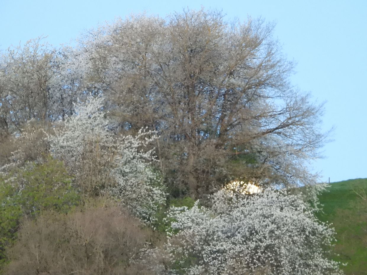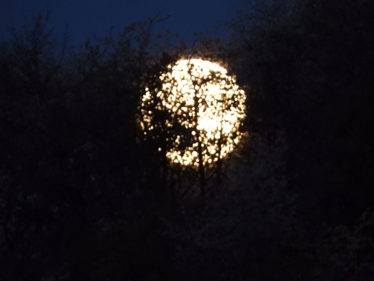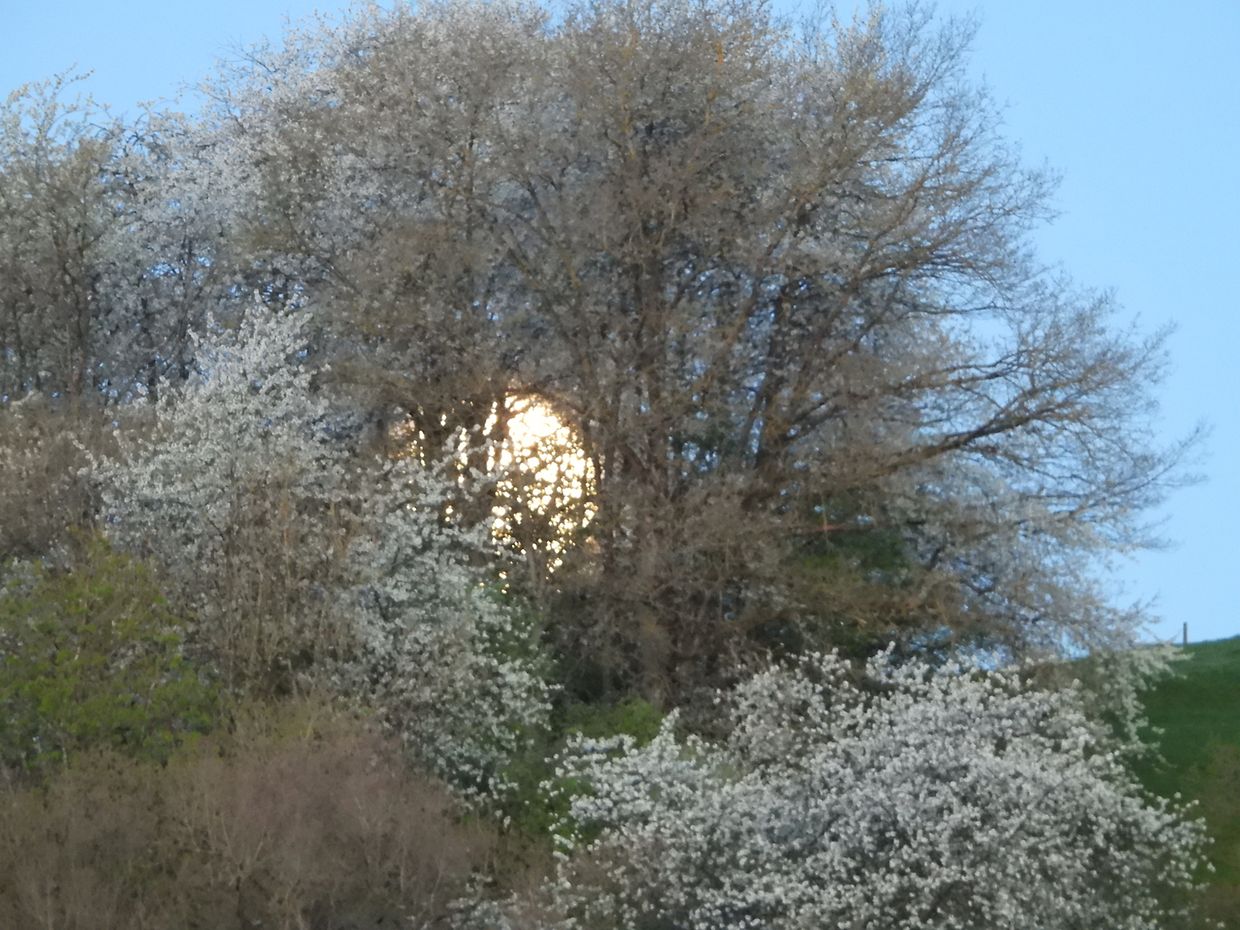 Schonns fréih ass op Ouschtersonndeg de Mound, nach bal Vollmound, iwwert der Ettelbrécker Haardt, verschwonn. Géint haéwer siwen war e ganz verschwonn. Zommleck frësch war ët och, ënm 3,5 °.