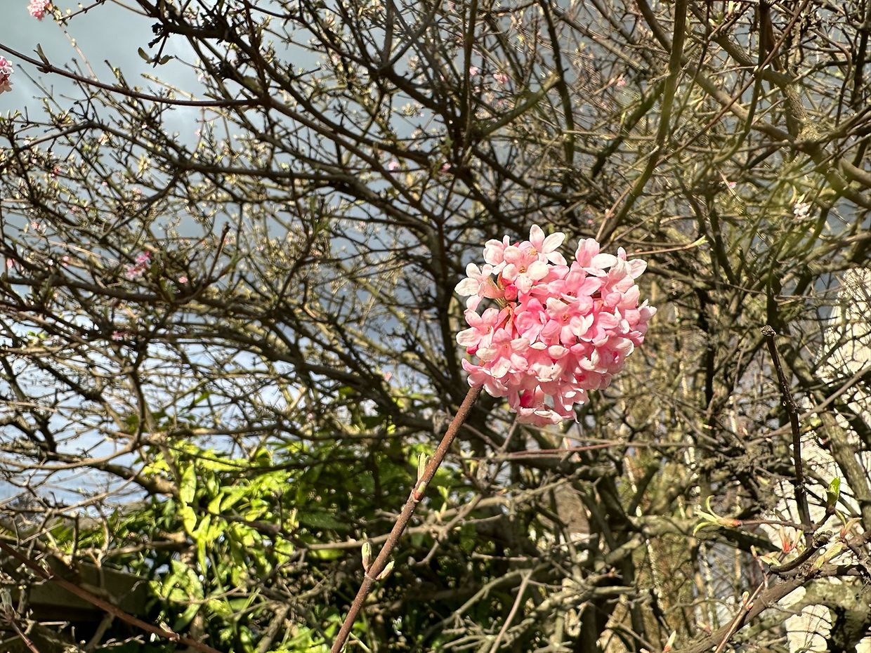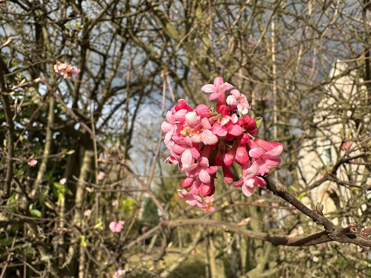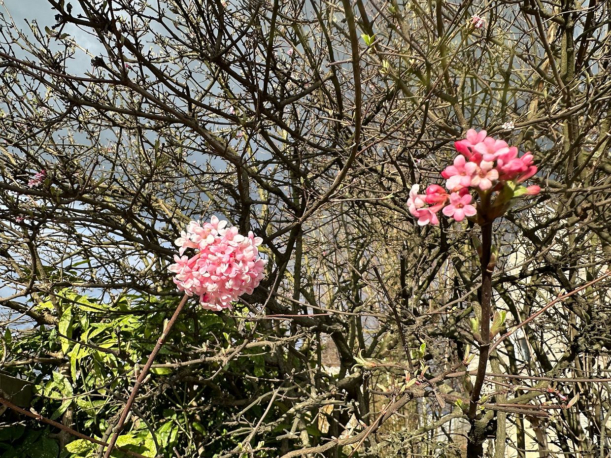 Die süß duftenden, rosa gefärbten weißen Blüten erscheinen im Spätherbst und Vorfrühling.