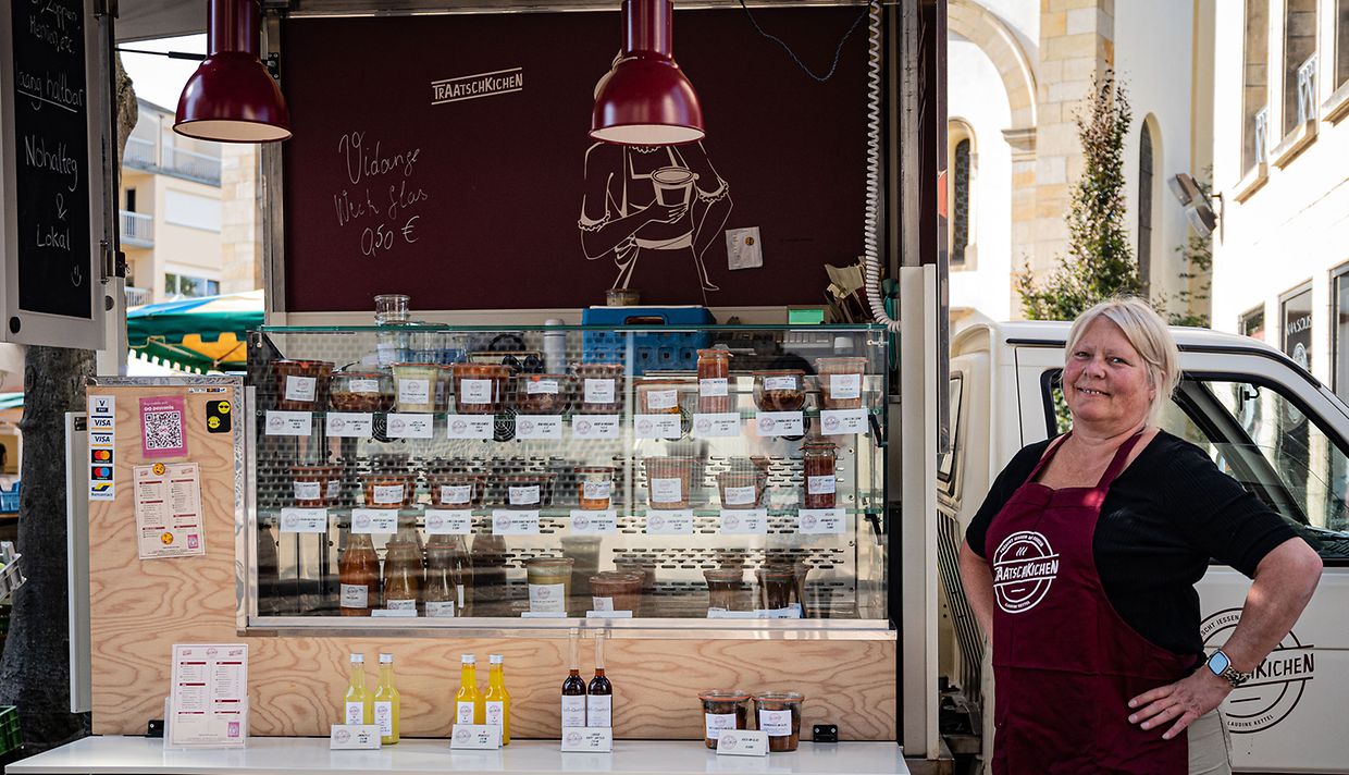„Traatschkichen“: Im schönen, nostalgisch anmutenden Verkaufstruck von Claudine gibt es Suppen, Saucen, Menüs, Gemüse sowie Kuchen in hübschen Pfandgläsern.
