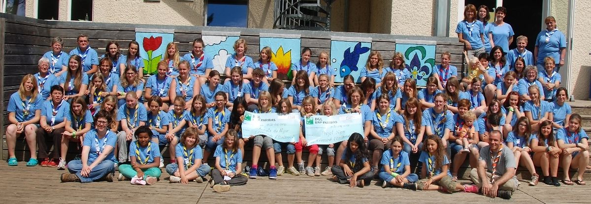Am Joer 2012, war een Deel vum Erléis fir eis ONG "Guiden a Scouten" fir eng Welt fir d'Projeten am Niger. Déi 2 Chèquen hu mir um Summercamp iwwerreecht, kuckt d'Foto.