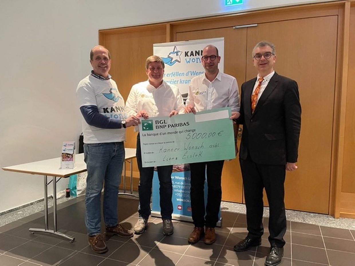 Anlässlich des diesjährigen Benefizkonzertes, organisiert vom "Conservatoire de Musique du Nord" im Ettelbrücker "CAPe", spendete der "Lions Club Éislék", vertreten durch Präsident André Eschbour, den Erlös dieser Veranstaltung in Höhe von 5.000 € an die Vereinigung "Kanner Wonsch asbl". Diese Vereinigung realisiert Wünsche von schwerkranken Kindern. Bei dieser Gelegenheit spendete der "Lions Club Éislék" auch 2.500 € an die Vereinigung "Alain Kabulo asbl", die edukative, soziale und kulturelle Projekte im Kongo unterstützt. Das "Conservatoire de Musique du Nord" war vertreten durch Direktor Adrien Théato.