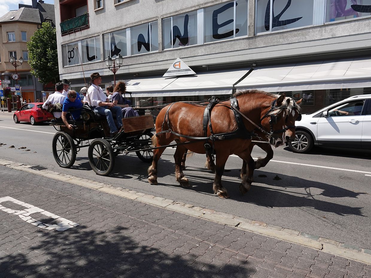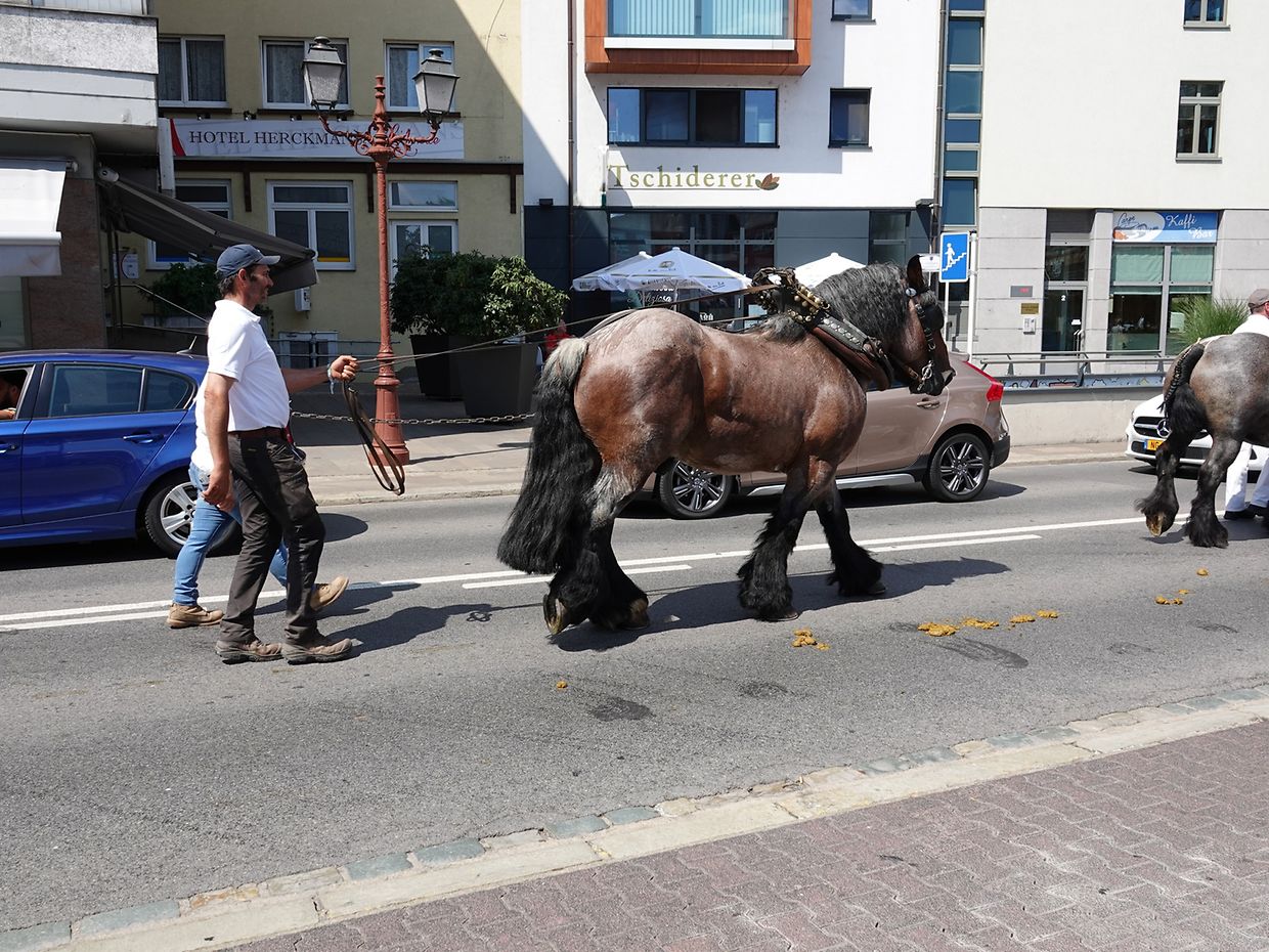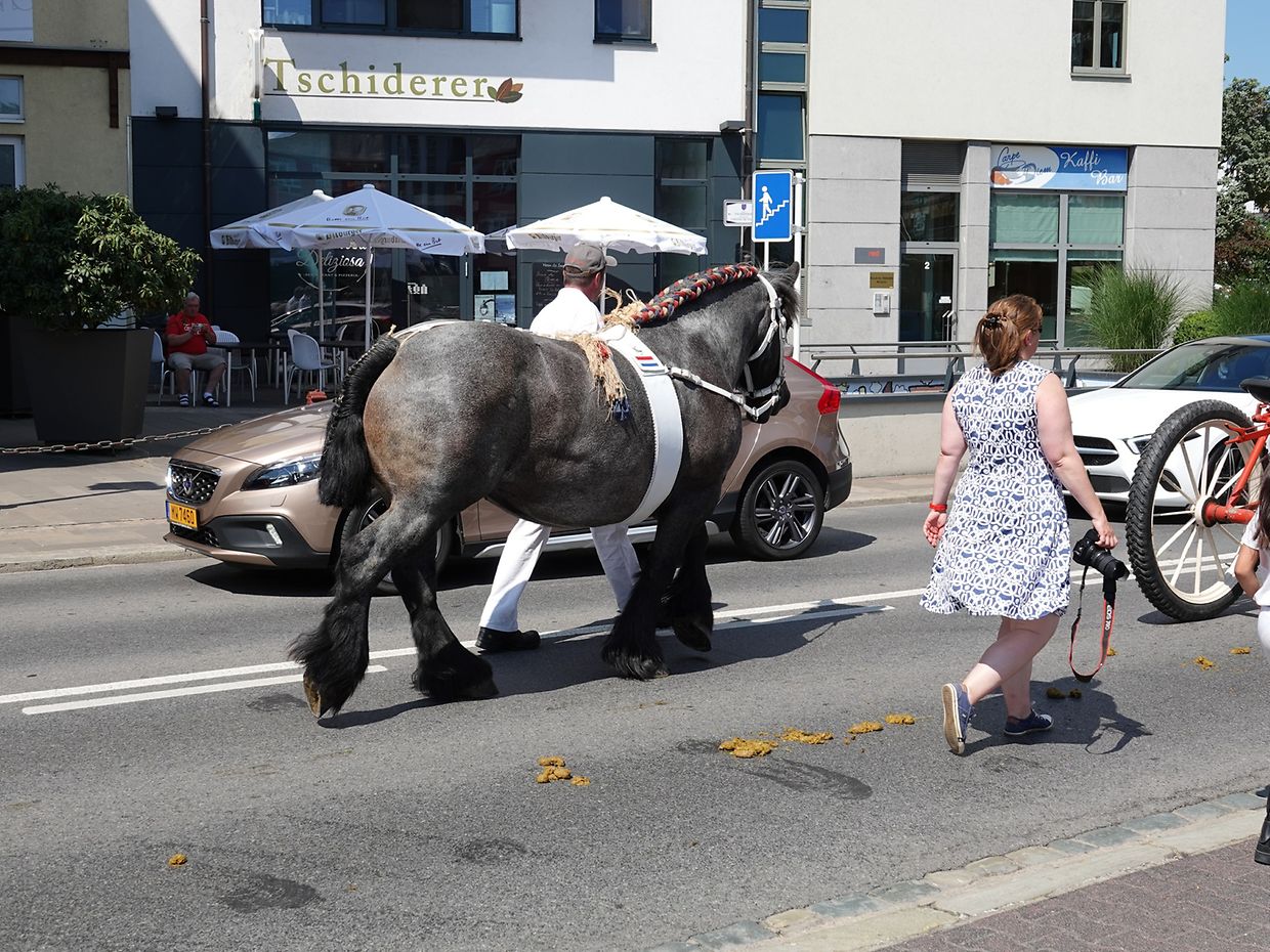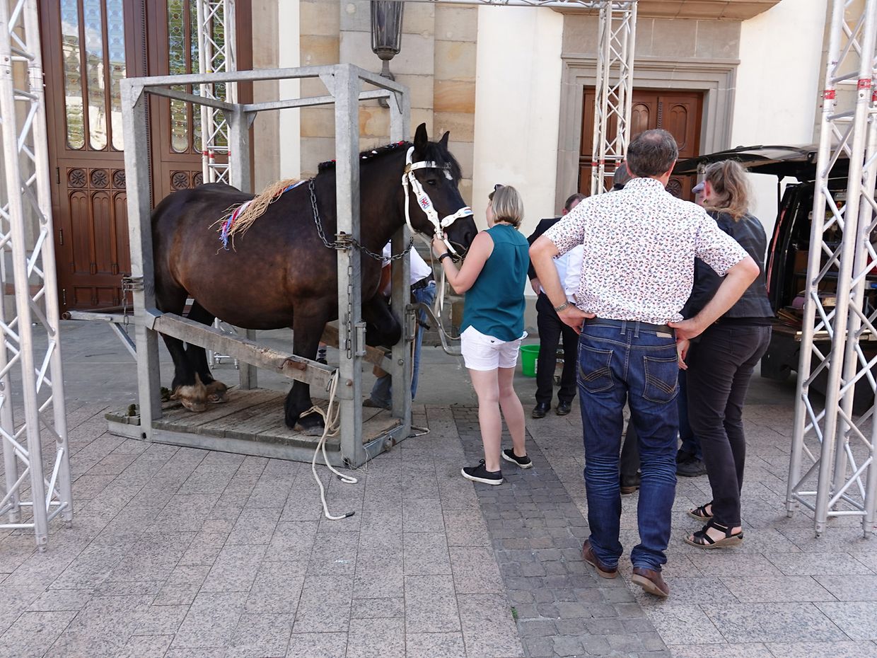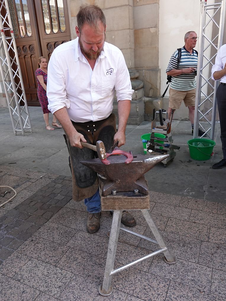 Mit etwas Verspätung setzte sich bei herrlichem Sommerwetter der Korso mit Ardennerpferden und verschiedenen Kutschen vom Gelände der Foire Agricole in Richtung Kirchenplatz in Bewegung. Dort stiegen die Gäste aus. Vor dem Hauptportal der Kirche war ein Pferd in einem robusten Gestell befestigt. Dort wurde unter beißendem Rauch ein Hufeisen geschmiedet und das Pferd fachmännisch beschlagen.