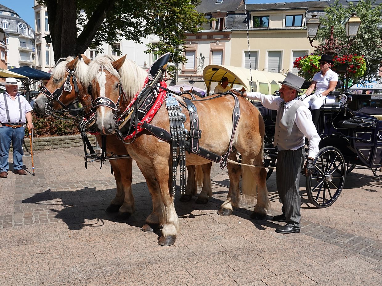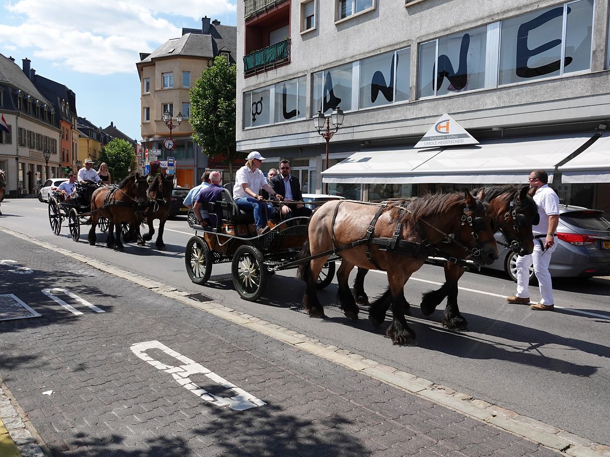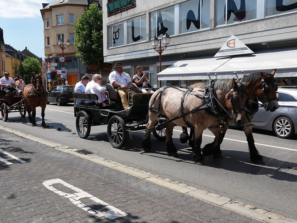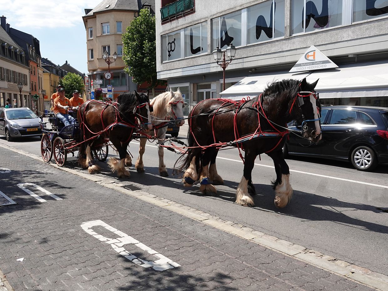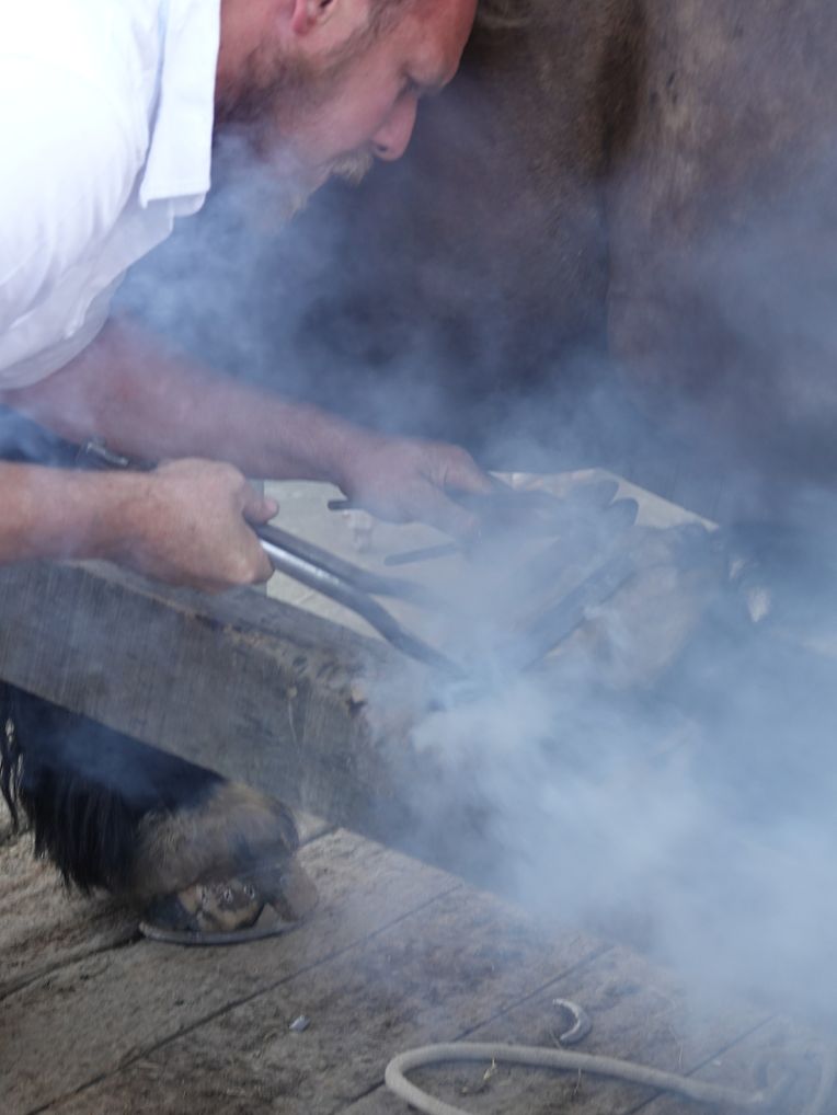 Mit etwas Verspätung setzte sich bei herrlichem Sommerwetter der Korso mit Ardennerpferden und verschiedenen Kutschen vom Gelände der Foire Agricole in Richtung Kirchenplatz in Bewegung. Dort stiegen die Gäste aus. Vor dem Hauptportal der Kirche war ein Pferd in einem robusten Gestell befestigt. Dort wurde unter beißendem Rauch ein Hufeisen geschmiedet und das Pferd fachmännisch beschlagen.