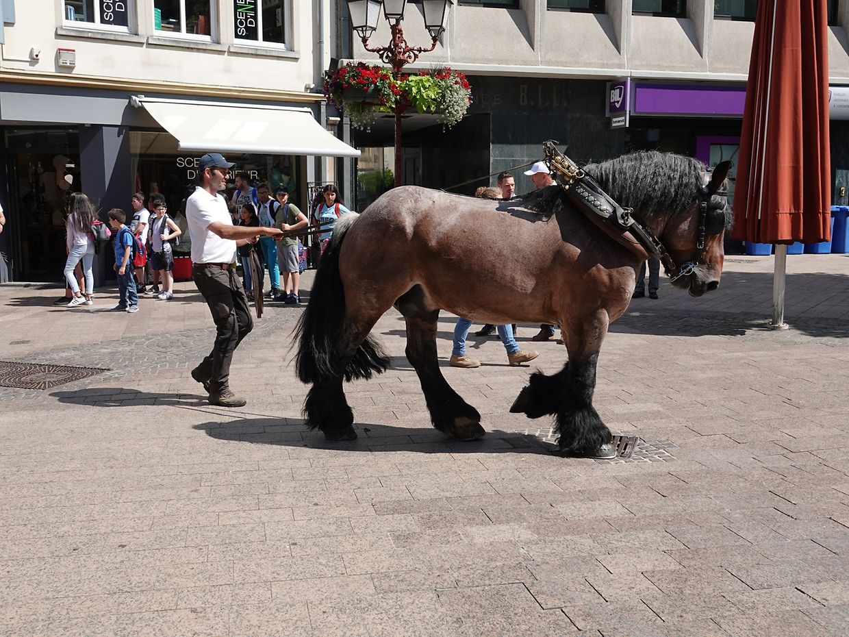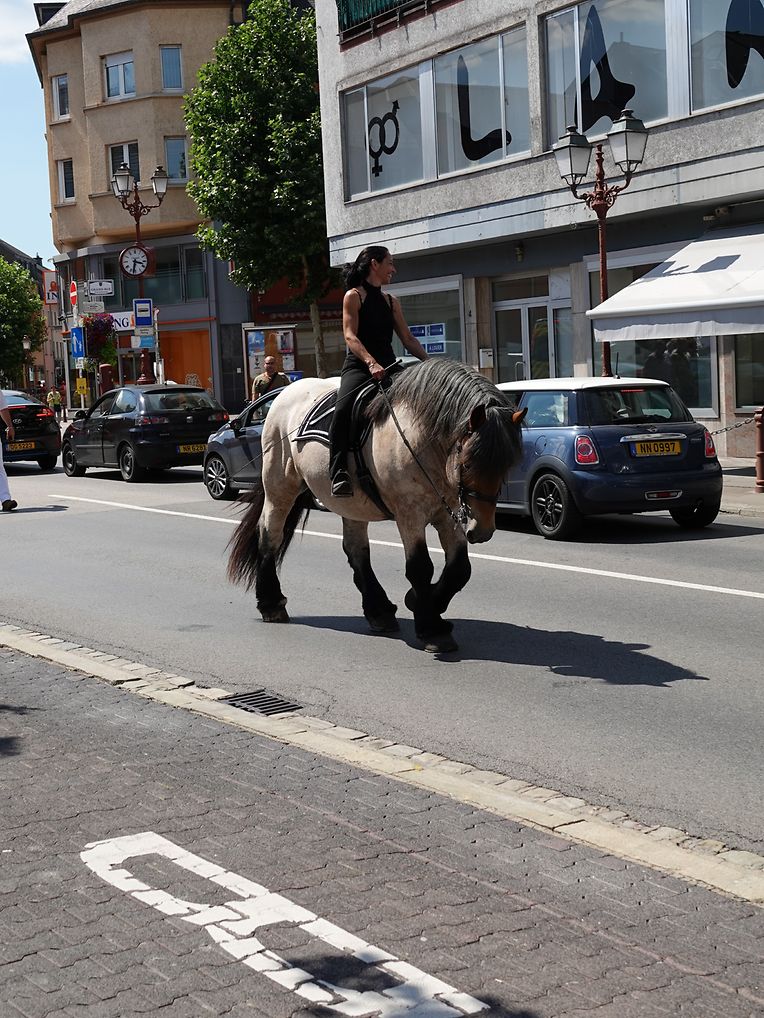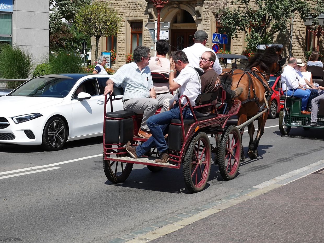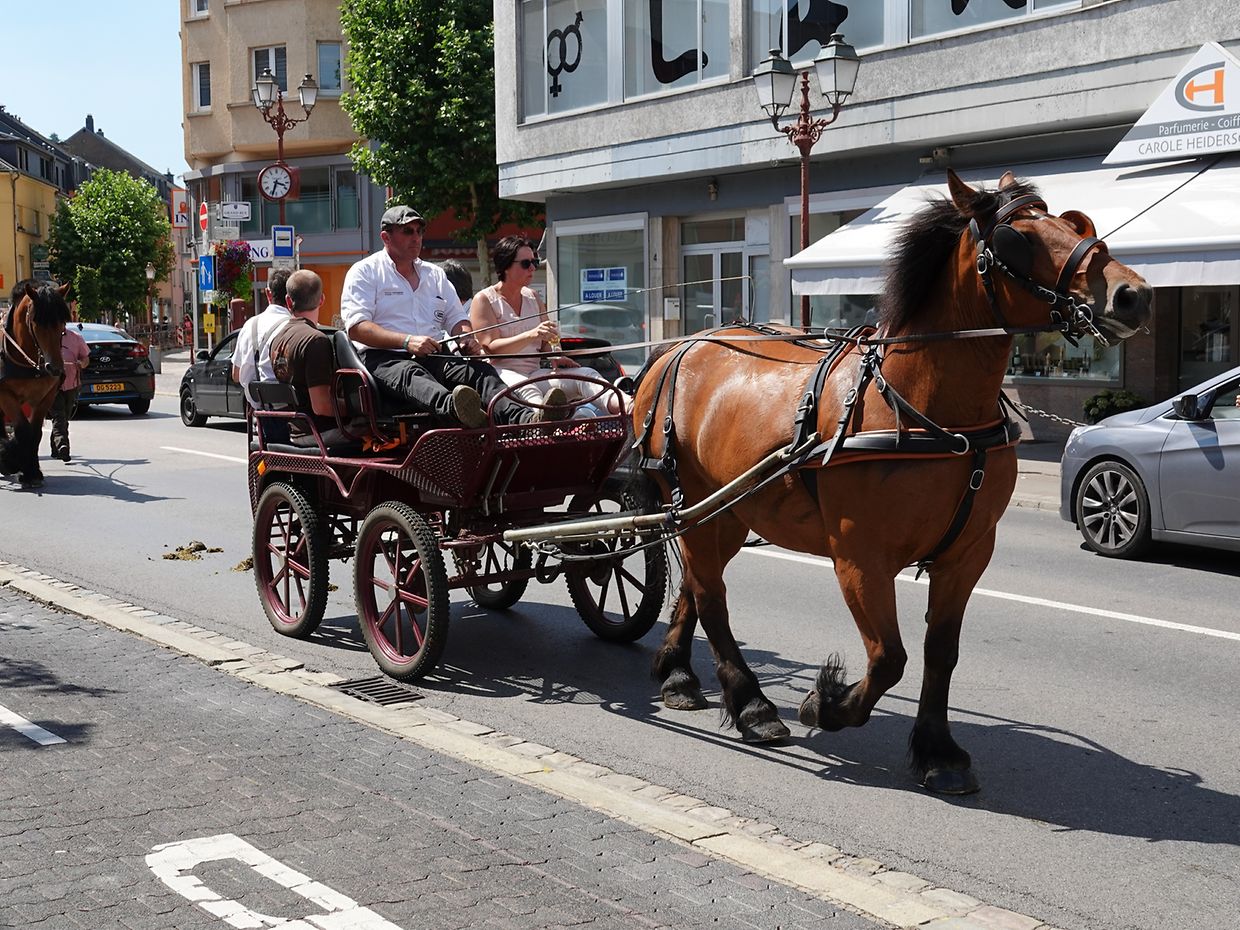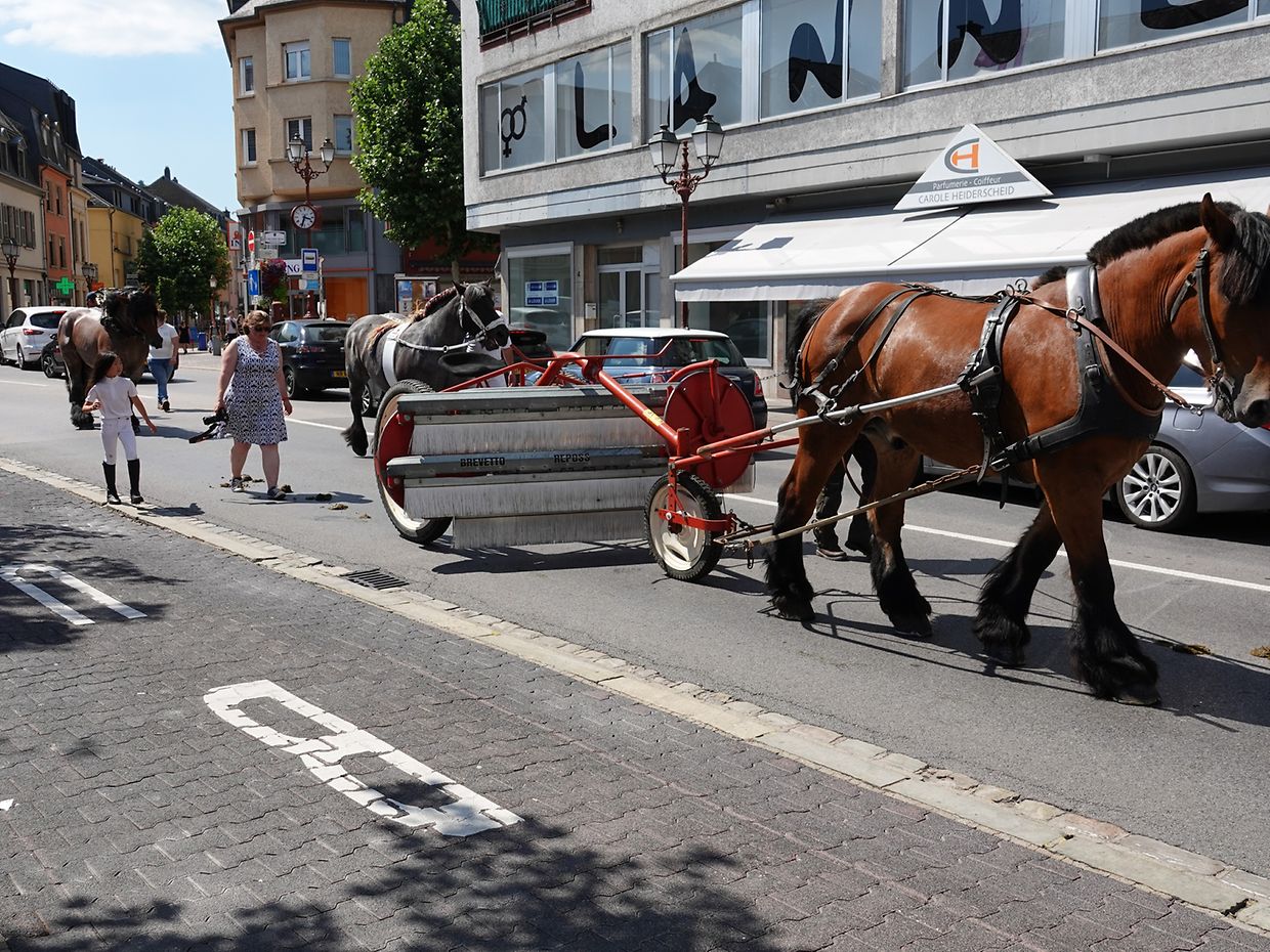 Mit etwas Verspätung setzte sich bei herrlichem Sommerwetter der Korso mit Ardennerpferden und verschiedenen Kutschen vom Gelände der Foire Agricole in Richtung Kirchenplatz in Bewegung. Dort stiegen die Gäste aus. Vor dem Hauptportal der Kirche war ein Pferd in einem robusten Gestell befestigt. Dort wurde unter beißendem Rauch ein Hufeisen geschmiedet und das Pferd fachmännisch beschlagen.