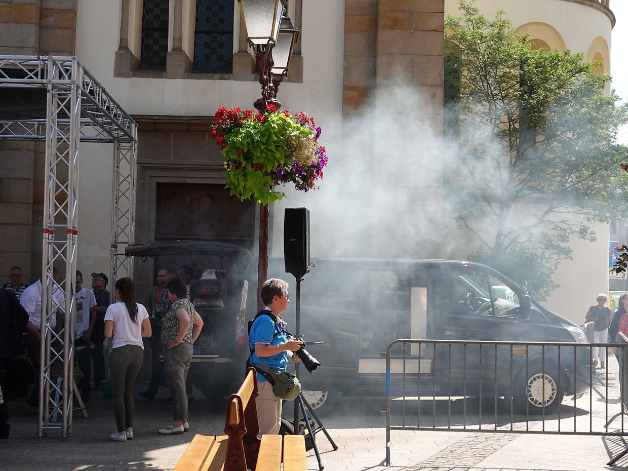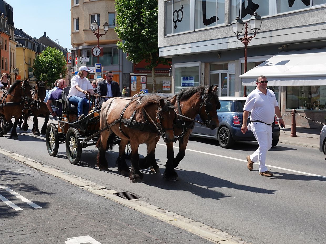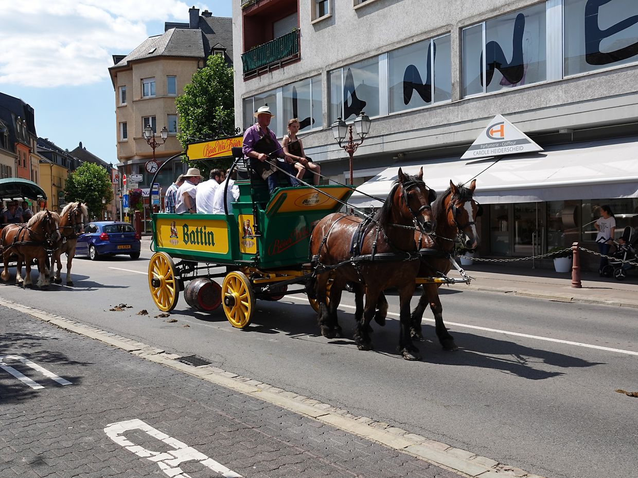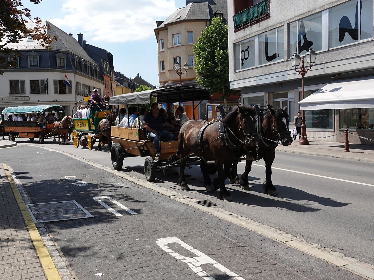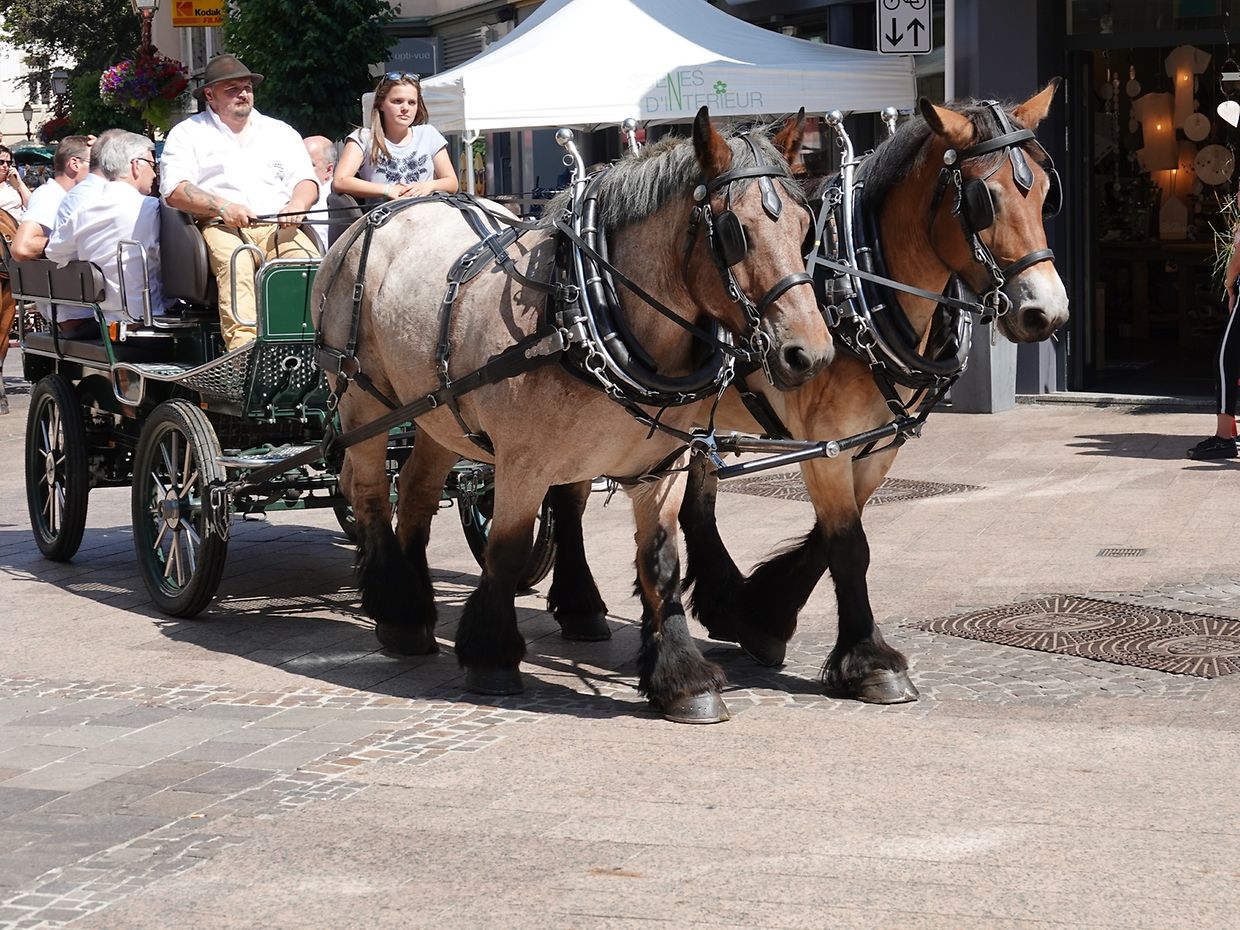 Mit etwas Verspätung setzte sich bei herrlichem Sommerwetter der Korso mit Ardennerpferden und verschiedenen Kutschen vom Gelände der Foire Agricole in Richtung Kirchenplatz in Bewegung. Dort stiegen die Gäste aus. Vor dem Hauptportal der Kirche war ein Pferd in einem robusten Gestell befestigt. Dort wurde unter beißendem Rauch ein Hufeisen geschmiedet und das Pferd fachmännisch beschlagen.