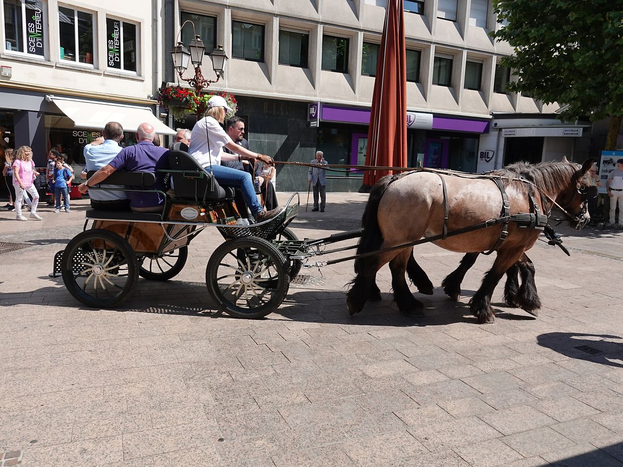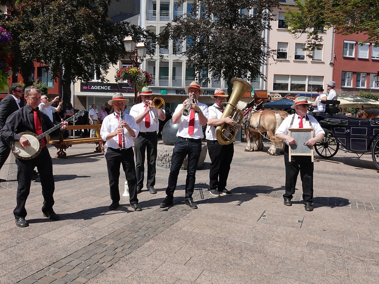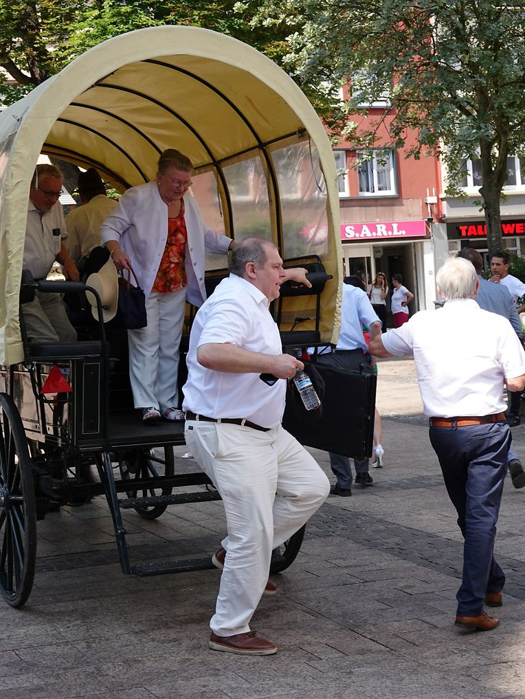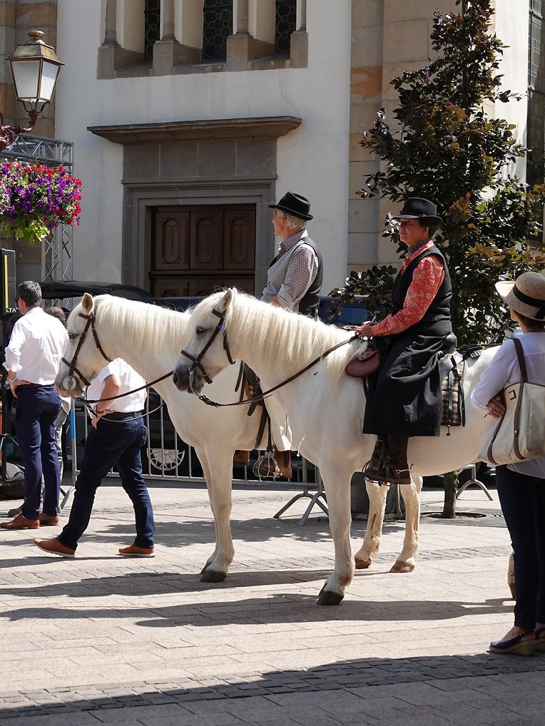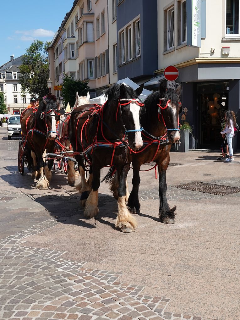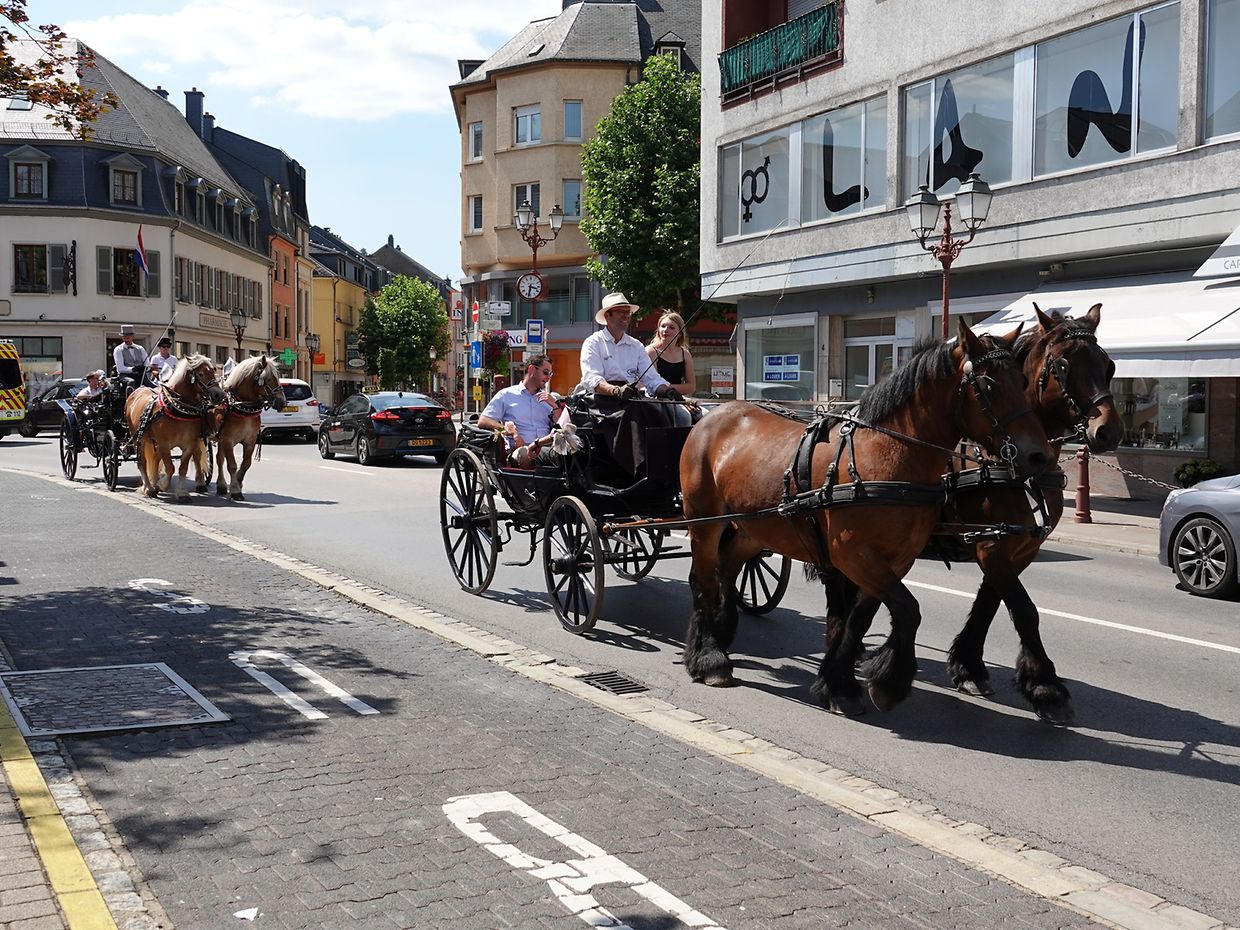 Mit etwas Verspätung setzte sich bei herrlichem Sommerwetter der Korso mit Ardennerpferden und verschiedenen Kutschen vom Gelände der Foire Agricole in Richtung Kirchenplatz in Bewegung. Dort stiegen die Gäste aus. Vor dem Hauptportal der Kirche war ein Pferd in einem robusten Gestell befestigt. Dort wurde unter beißendem Rauch ein Hufeisen geschmiedet und das Pferd fachmännisch beschlagen.