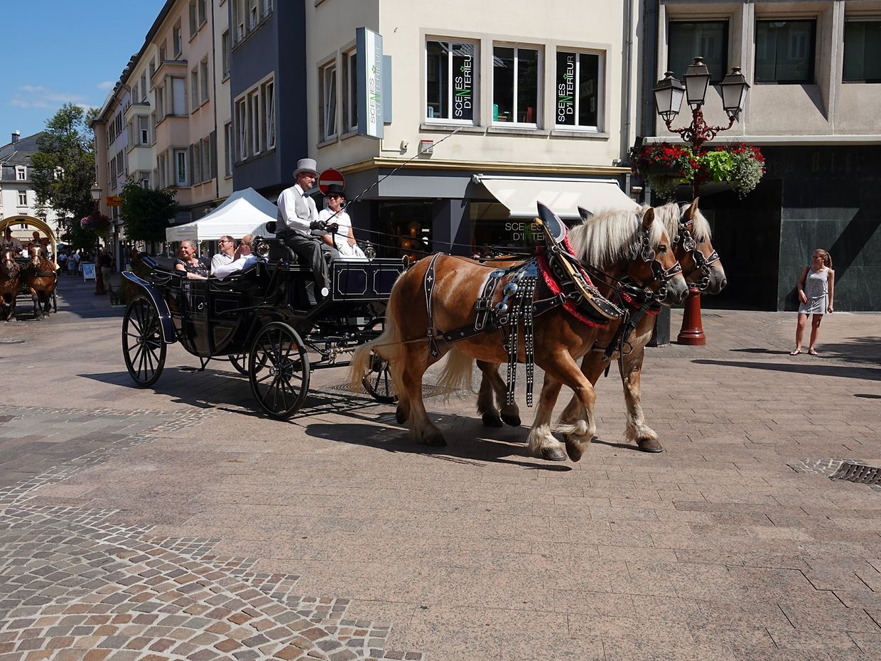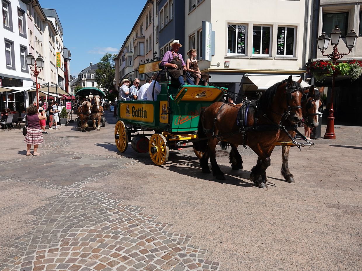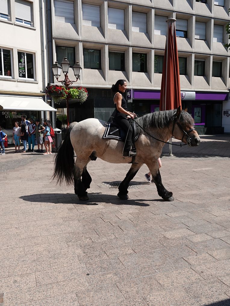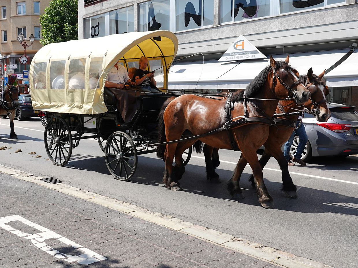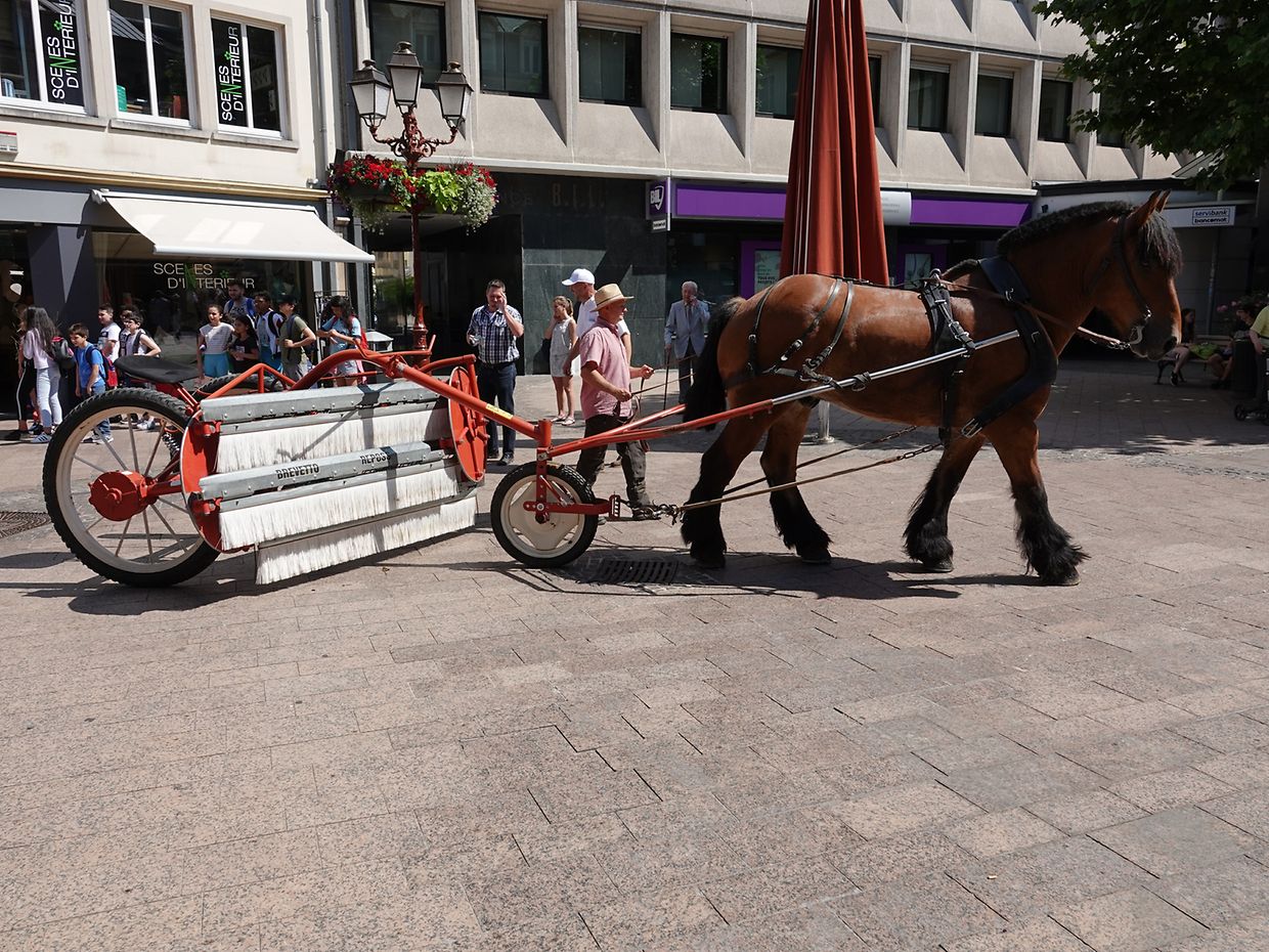 Mit etwas Verspätung setzte sich bei herrlichem Sommerwetter der Korso mit Ardennerpferden und verschiedenen Kutschen vom Gelände der Foire Agricole in Richtung Kirchenplatz in Bewegung. Dort stiegen die Gäste aus. Vor dem Hauptportal der Kirche war ein Pferd in einem robusten Gestell befestigt. Dort wurde unter beißendem Rauch ein Hufeisen geschmiedet und das Pferd fachmännisch beschlagen.