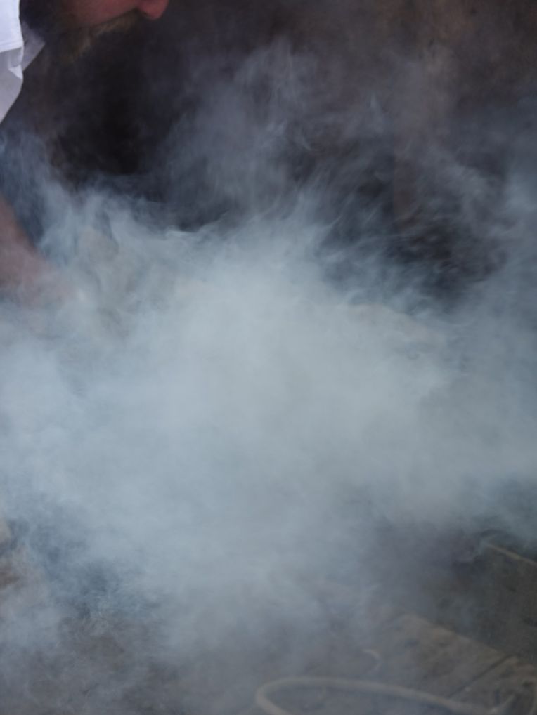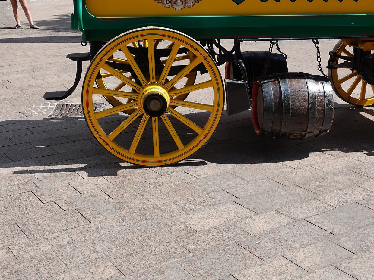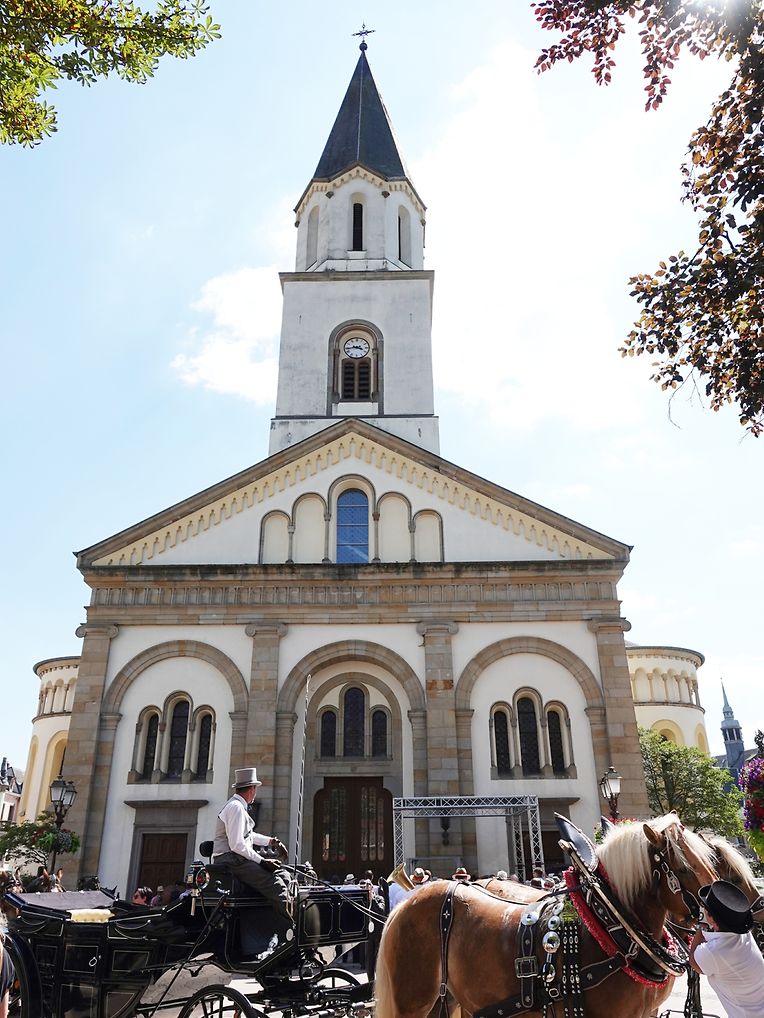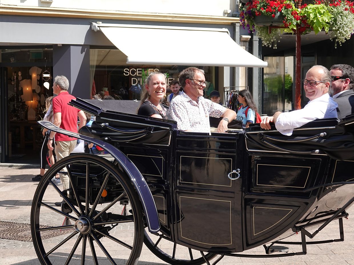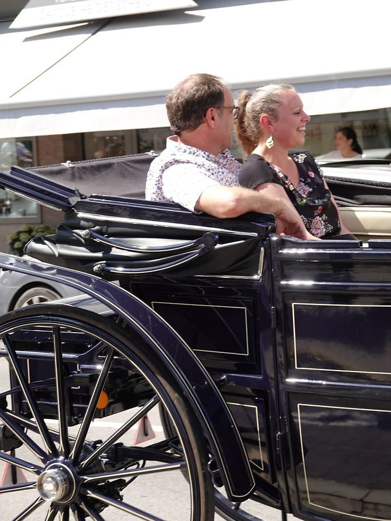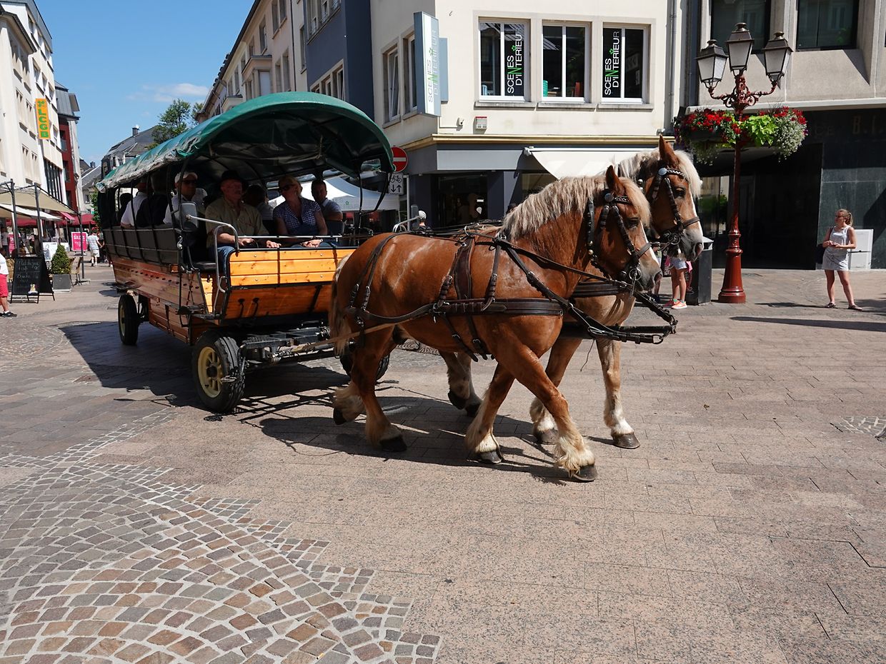 Mit etwas Verspätung setzte sich bei herrlichem Sommerwetter der Korso mit Ardennerpferden und verschiedenen Kutschen vom Gelände der Foire Agricole in Richtung Kirchenplatz in Bewegung. Dort stiegen die Gäste aus. Vor dem Hauptportal der Kirche war ein Pferd in einem robusten Gestell befestigt. Dort wurde unter beißendem Rauch ein Hufeisen geschmiedet und das Pferd fachmännisch beschlagen.