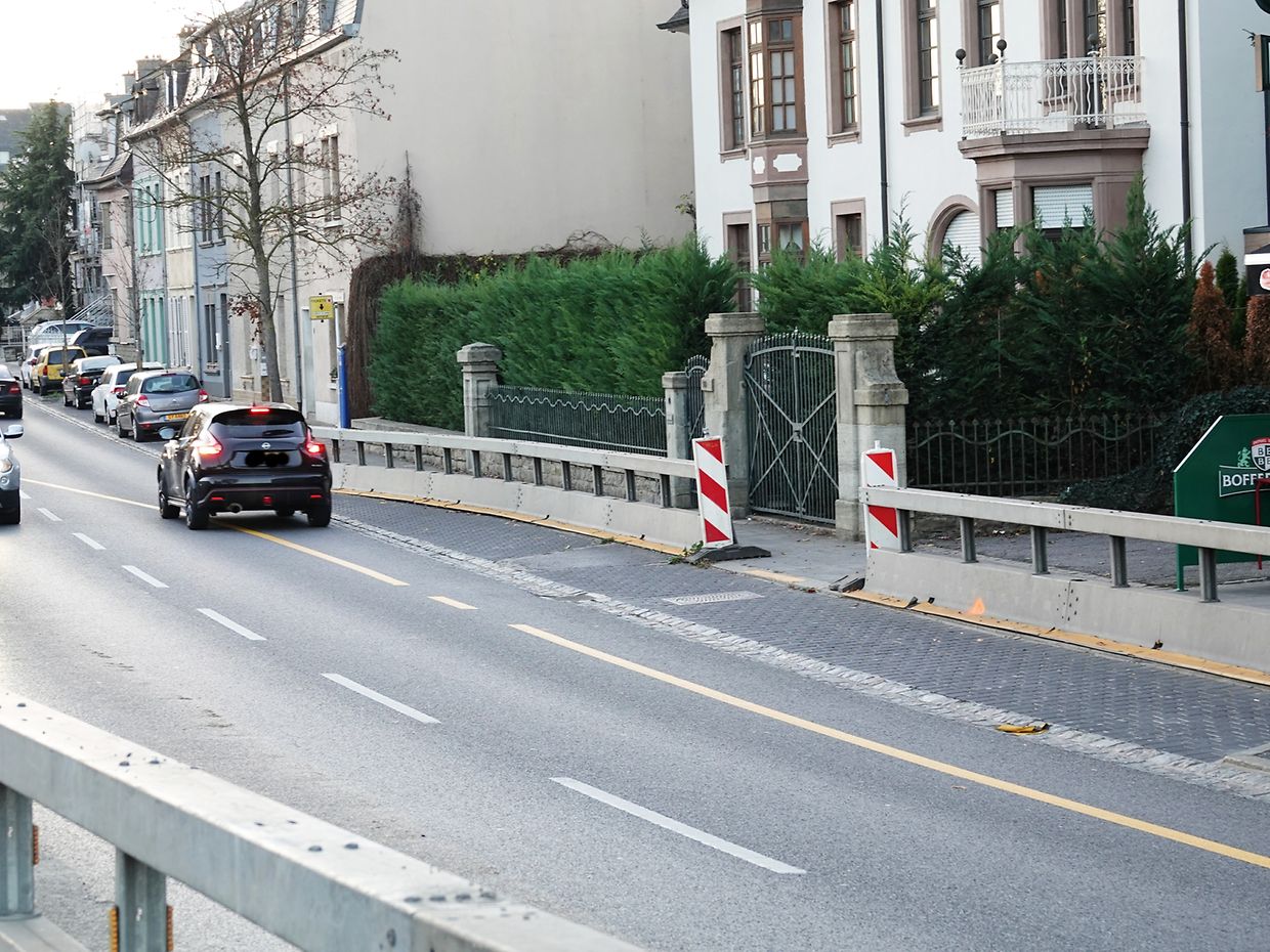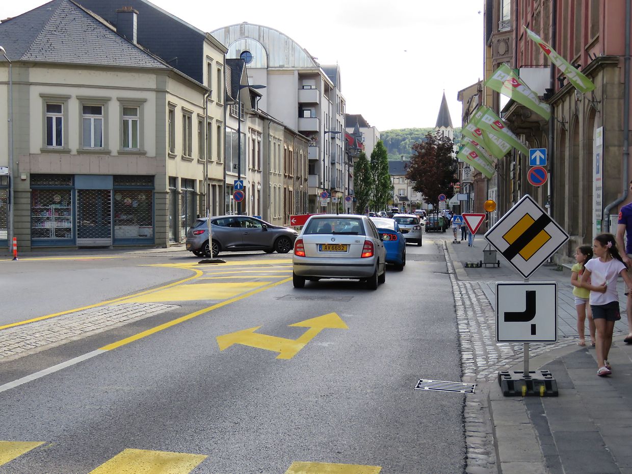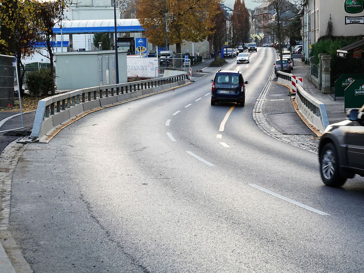 Seit dem Freitag, 16. November hat die Verkehrsführung in Ettelbrück erneut eine Änderung aufzuweisen, nachdem in der Kurve gegenüber der Gaststätte in der Nähe des Patton Denkmals schienenseitig die schweren Metallelemente zwecks Verbreiterung der verfügbaren Straßenbreite verschoben wurden. Hierzu ist zu bemerken, dass die gelben Linien über den Bürgersteig nach wie vor vorhanden sind und dass diese Änderung provisorisch zu sein scheint, was die frisch aufgetragene dicke Asphaltschicht am Straßenrad gegenüber der Gaststätte erahnen läßt.
