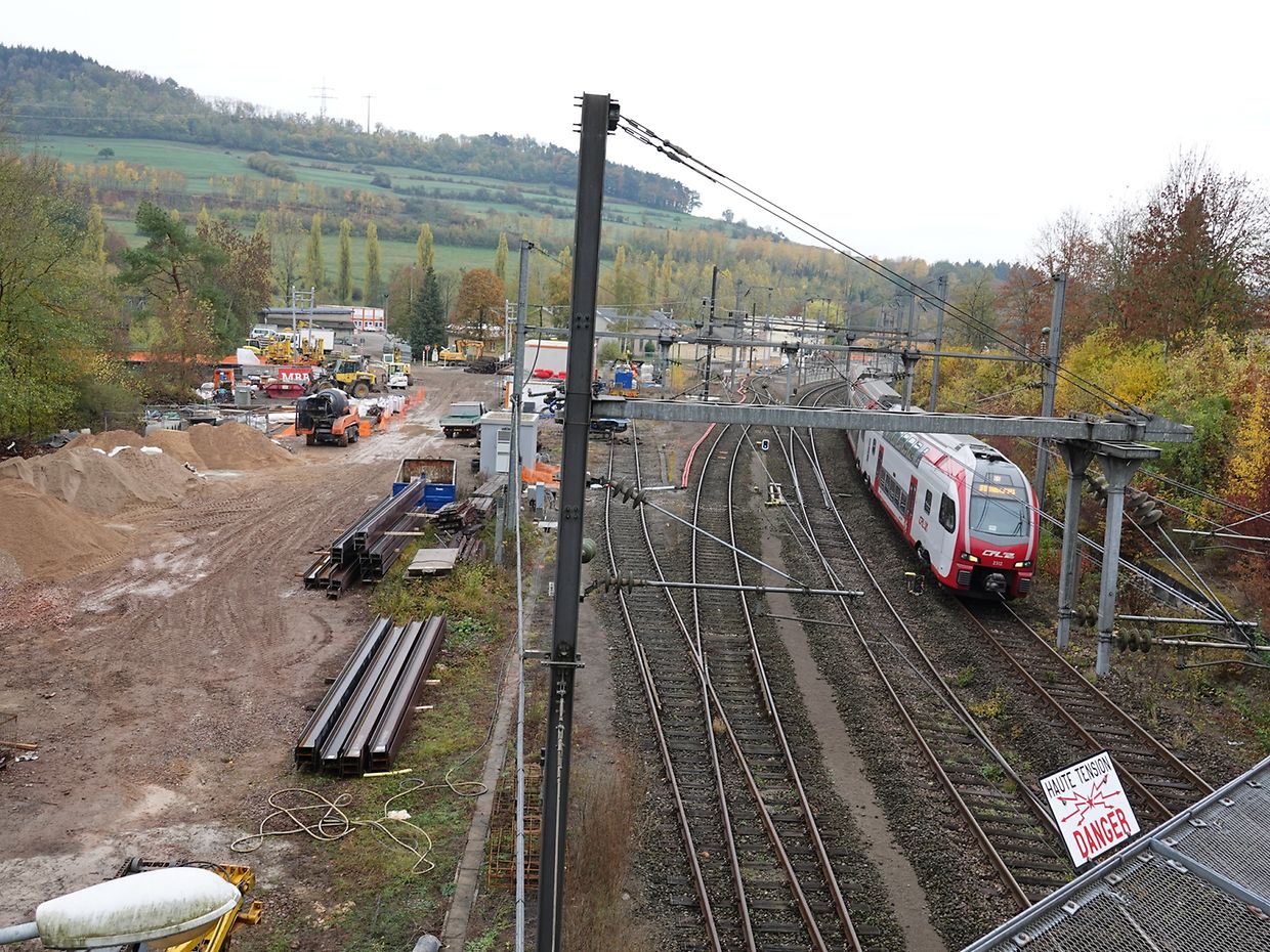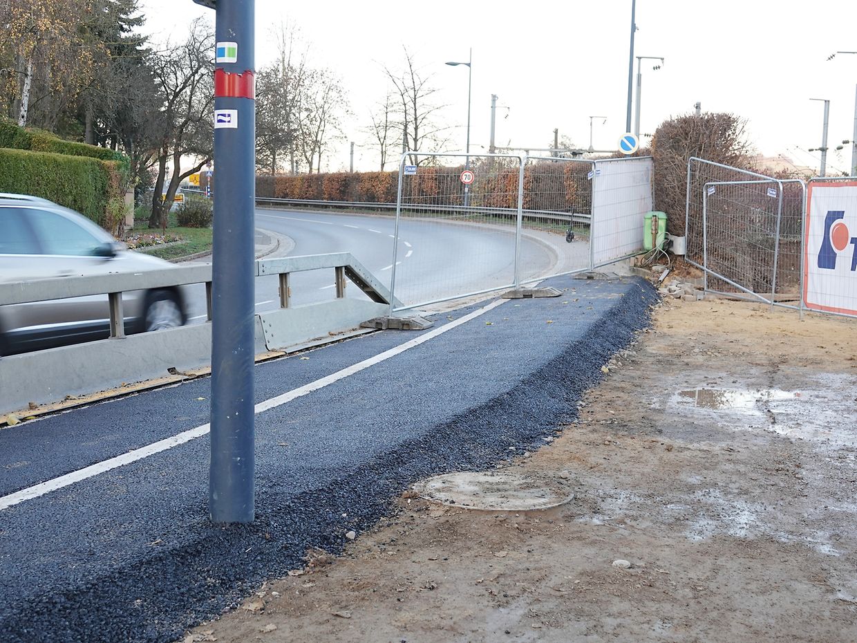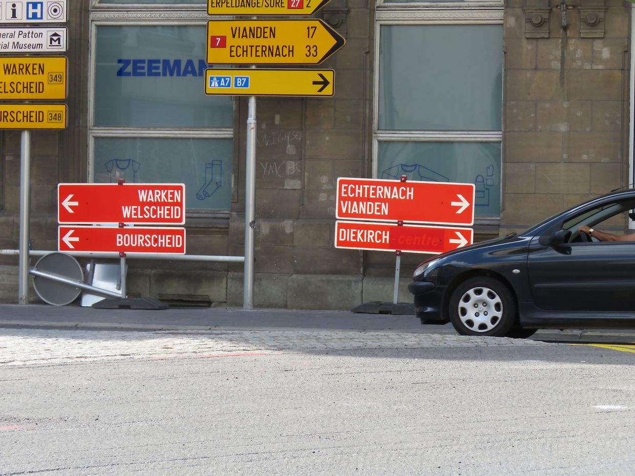 Seit dem Freitag, 16. November hat die Verkehrsführung in Ettelbrück erneut eine Änderung aufzuweisen, nachdem in der Kurve gegenüber der Gaststätte in der Nähe des Patton Denkmals schienenseitig die schweren Metallelemente zwecks Verbreiterung der verfügbaren Straßenbreite verschoben wurden. Hierzu ist zu bemerken, dass die gelben Linien über den Bürgersteig nach wie vor vorhanden sind und dass diese Änderung provisorisch zu sein scheint, was die frisch aufgetragene dicke Asphaltschicht am Straßenrad gegenüber der Gaststätte erahnen läßt.