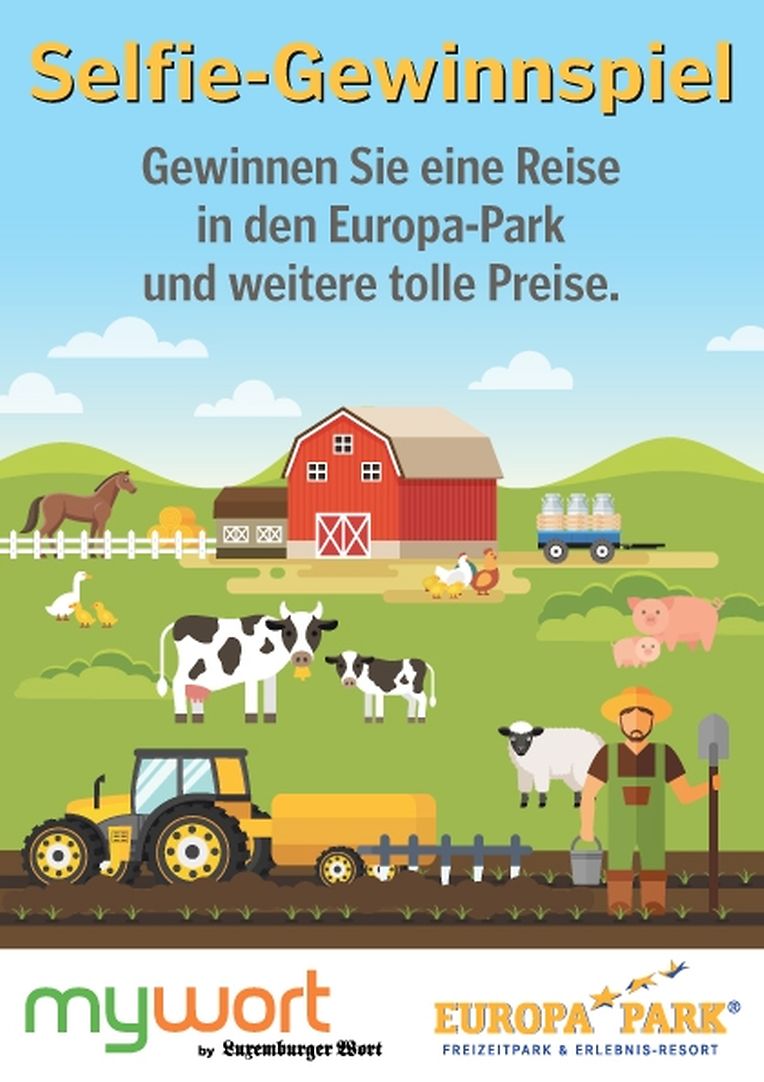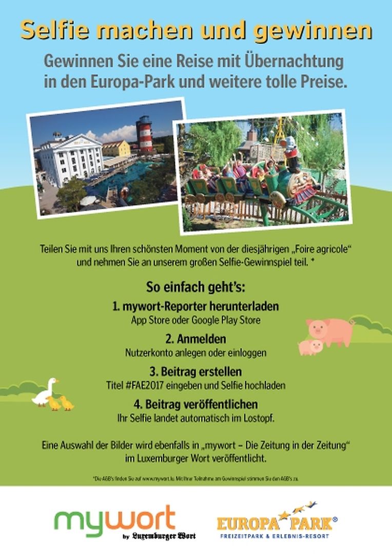 Mitmachen kann jeder! Das Einzige, was benötigt wird, ist die Reporter-App von mywort. Diese kann kostenlos bei iTunes (iPhone) oder google play (Android) heruntergeladen werden. Um am Gewinnspiel teilzunehmen, genügt es, ein Selfie von sich und/oder seiner Familie auf der “Foire agricole” aufzunehmen und mit der Reporter-App hochzuladen. Setzen Sie #FAE2017 ins Textfeld ein oder verwenden Sie #FAE2017 als Titel, damit alle Artikel der Foire agricole gut sichtbar für alle mywort.lu-Nutzer zu finden sind.