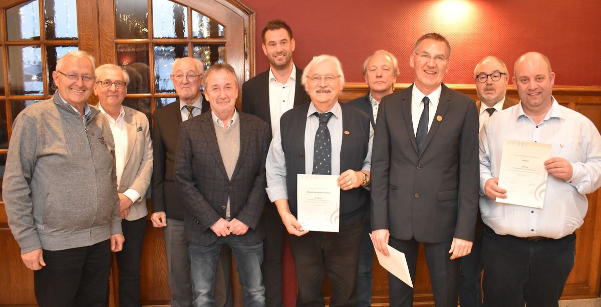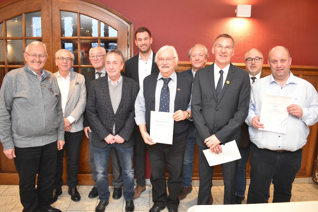 In seiner Ansprache dankte Lyra-Präsident André Nicolay den 33 Sängern des Vereins für ihren Einsatz, insgesamt wurden im abgelaufenen Jahr 45 Proben abgehalten, fünf Konzerte gegeben und drei Totenmessen gesungen. Zudem wirkte die Lyra im großen Ensemble bei der 150-Jahr Feier der Luxemburger Verfassung und - zusammen mit dem Ettelbrücker Kirchenchor - bei einer Gedenkfeier beim Patton-Denkmal mit. Dankesworte gingen auch an den seit 1997 dem Chor verpflichteten Dirigenten Marion Michels, an den Pianisten Claude Huss und an die Musiker der Combo. Zudem bedankte Nicolay sich beim Schöffenkollegium für die Unterstützung seitens der Gemeinde im nun abgelaufenen Musikjahr und hob auch die gute Zusammenarbeit mit dem nationalen Musikverband hervor. Im Namen der Stadt Ettelbrück überbrachte Bürgermeister Bob Steichen die besten Glückwünsche und Dankesworte. Joé Heintzen übermittelte die Gratulationen der UGDA und überreichte anschließend an Paul Lion das Verdienstabzeichen des Musikverbandes für fünf Jahre Mitgliedschaft. Die Bronzemedaille für zehn Jahre Mitgliedschaft erhielt Romain Ries. Jos Lucas nahm die Goldmedaille (30 Jahre) in Empfang. John Düsseldorf und André Nicolay wurden mit der Goldmedaille mit Palmette (40 Jahre) ausgezeichnet.