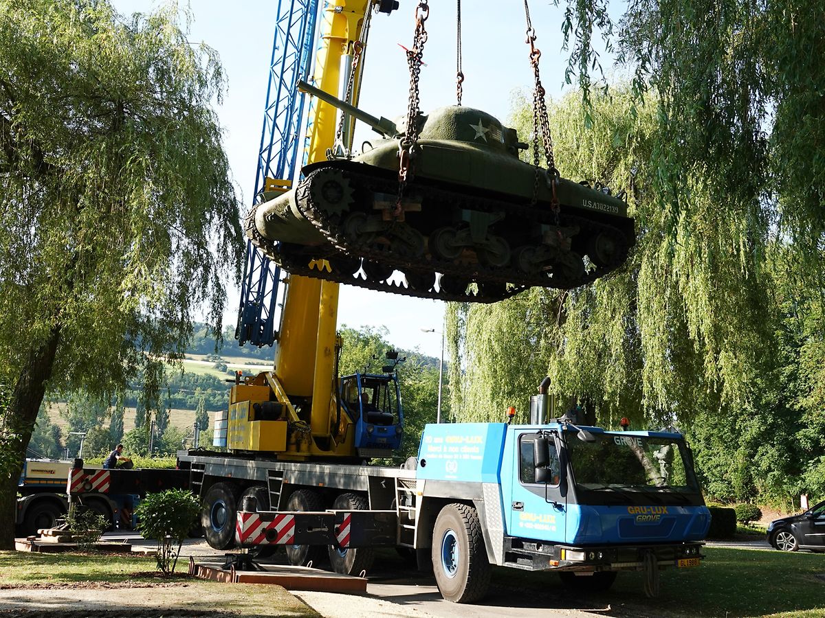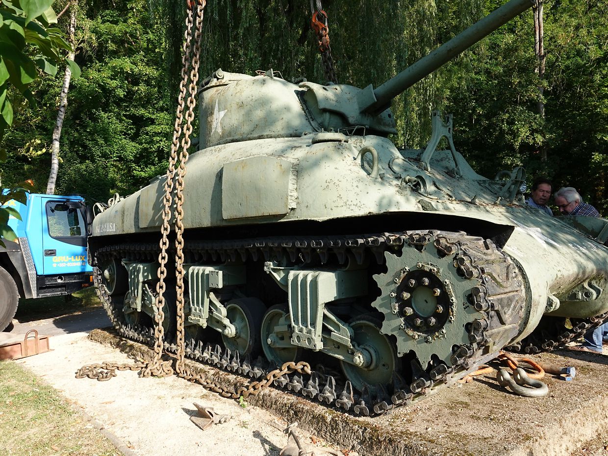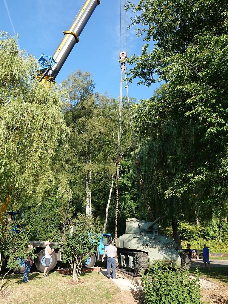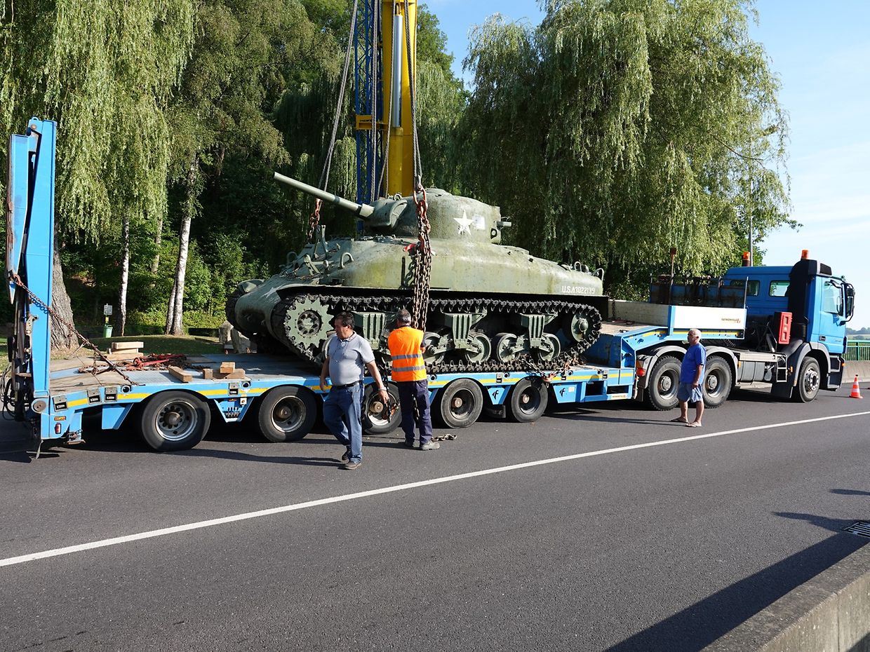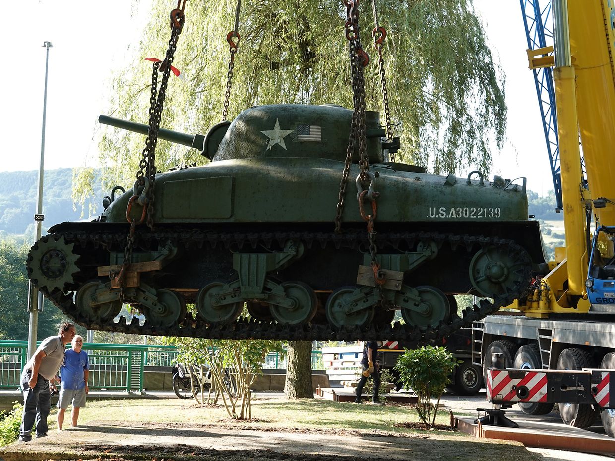 Einmaliges Schauspiel am frühen Morgen des 27.7.2018 beim Pattondenkmal. Der 36 Tonnen wiegende Sherman-Panzer wurde von seinem Sockel gehievt und auf einen Tieflader gestellt, um von dort in die Garage Leweck transportiert zu werden. Dort soll die dicke Farbschicht per Sandstrahl entfernt werden und erneuert werden. Alles erfolgte auf Initiative der Verantwortlichen des Musée Patton.