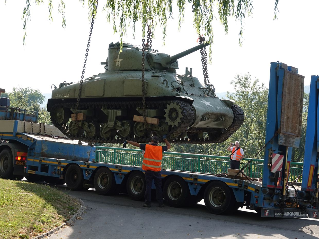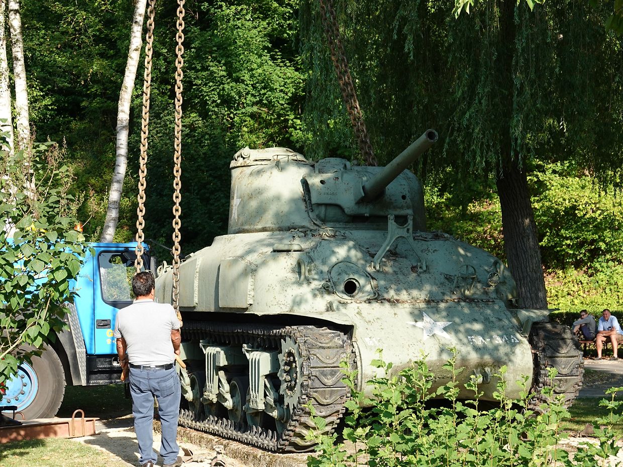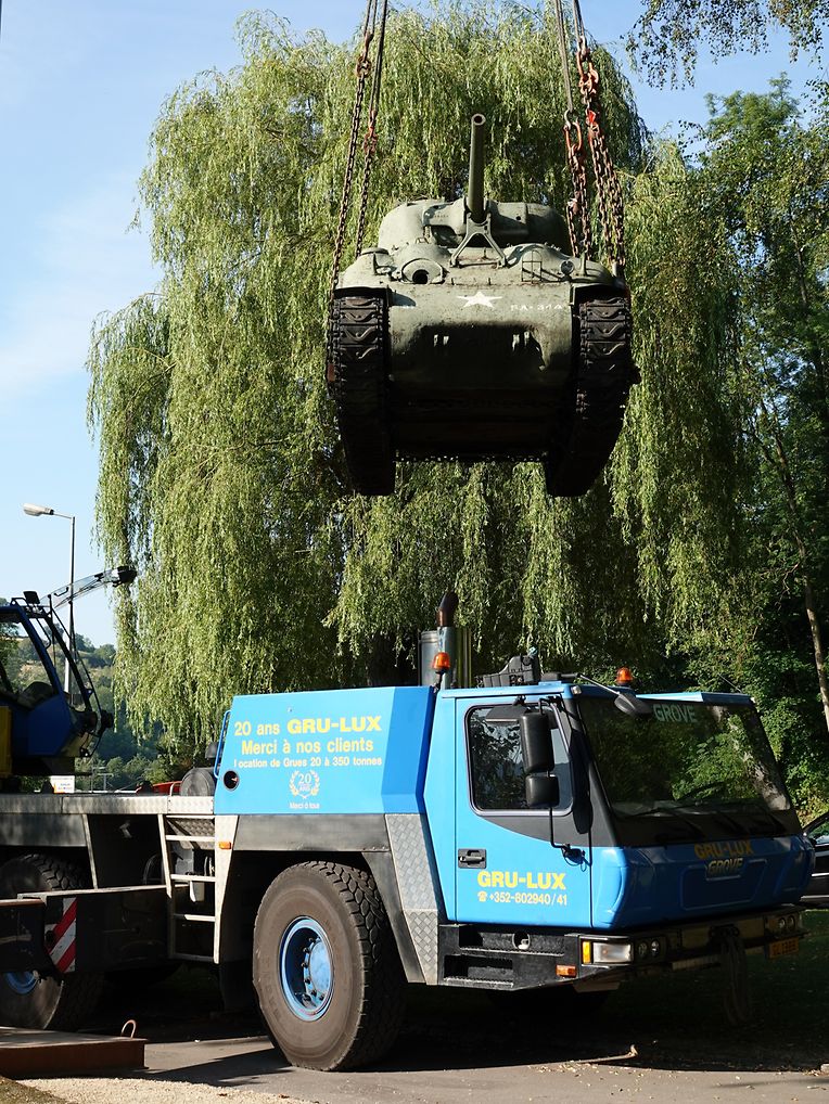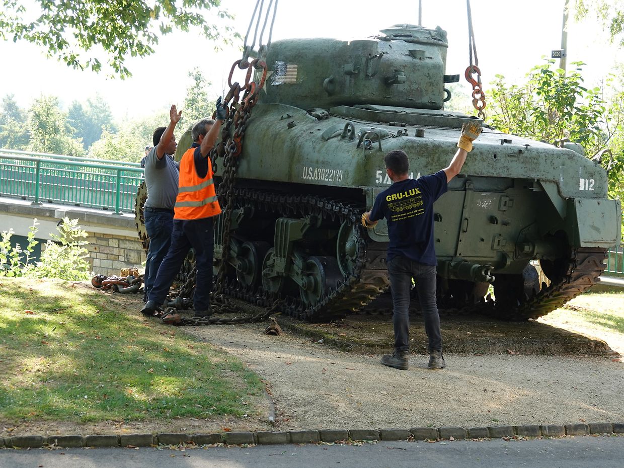 Einmaliges Schauspiel am frühen Morgen des 27.7.2018 beim Pattondenkmal. Der 36 Tonnen wiegende Sherman-Panzer wurde von seinem Sockel gehievt und auf einen Tieflader gestellt, um von dort in die Garage Leweck transportiert zu werden. Dort soll die dicke Farbschicht per Sandstrahl entfernt werden und erneuert werden. Alles erfolgte auf Initiative der Verantwortlichen des Musée Patton.