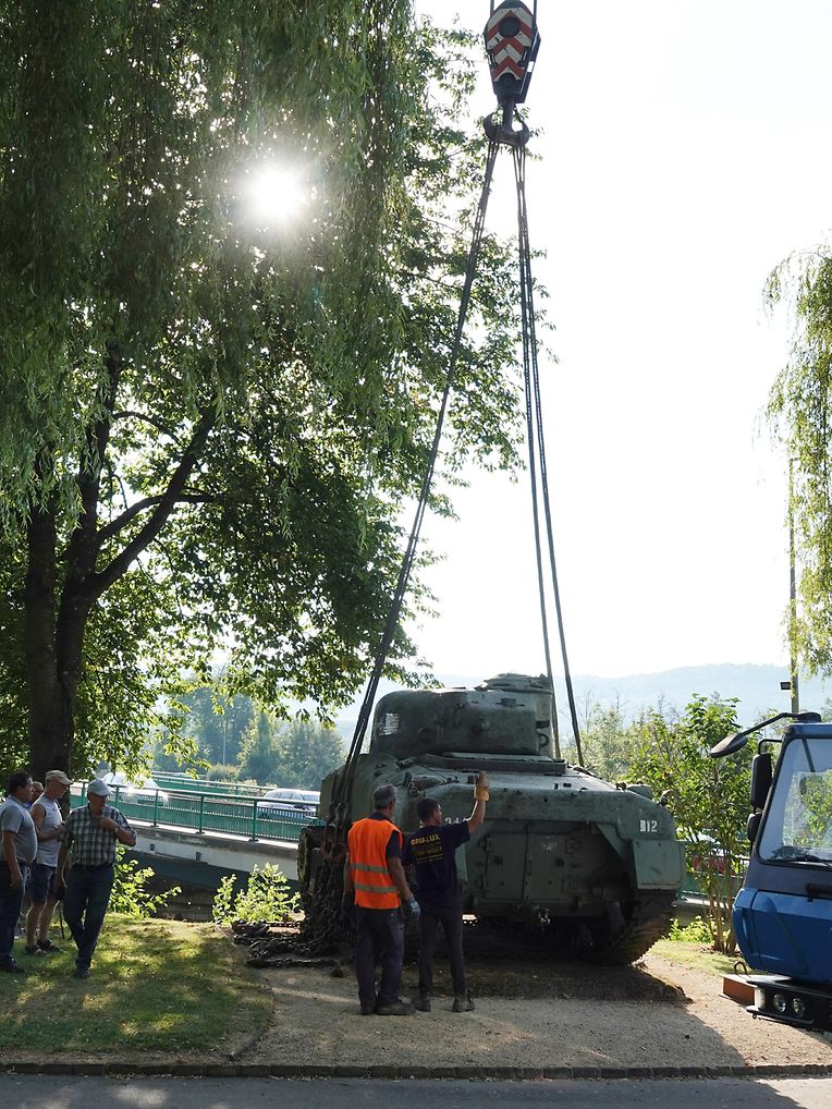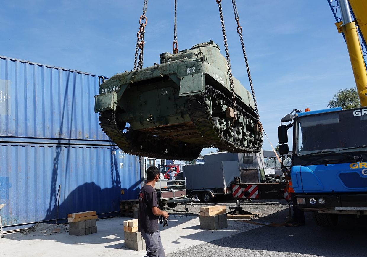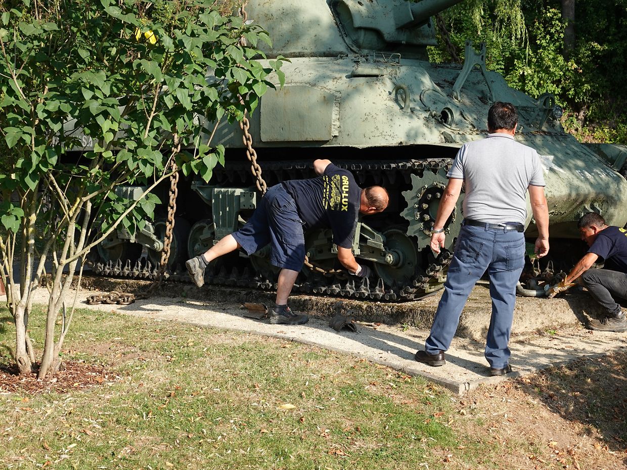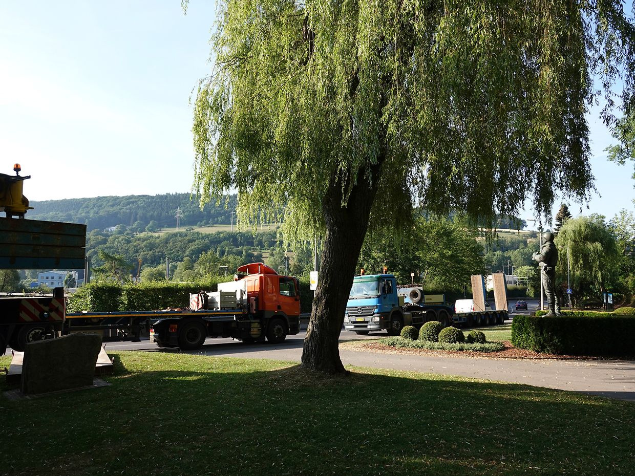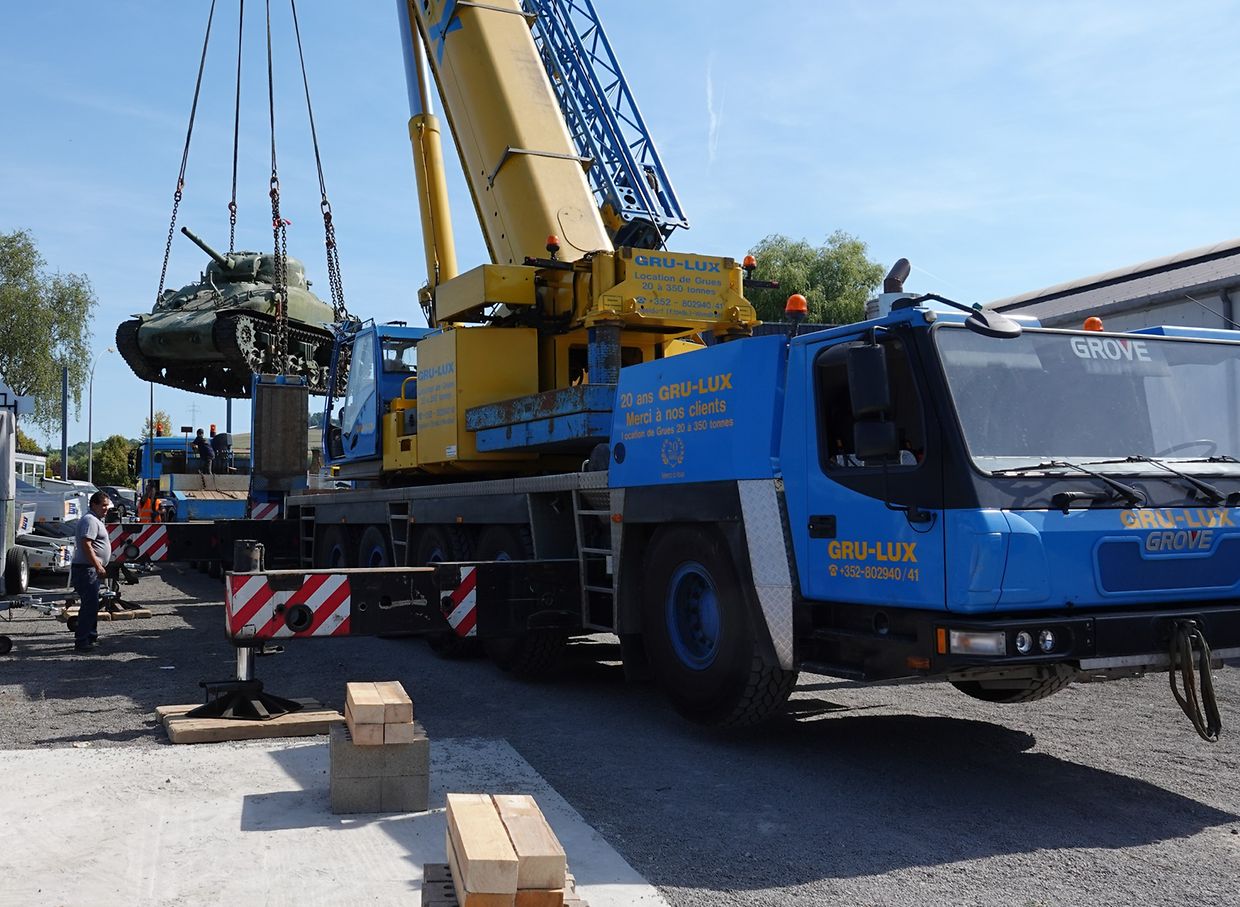 Einmaliges Schauspiel am frühen Morgen des 27.7.2018 beim Pattondenkmal. Der 36 Tonnen wiegende Sherman-Panzer wurde von seinem Sockel gehievt und auf einen Tieflader gestellt, um von dort in die Garage Leweck transportiert zu werden. Dort soll die dicke Farbschicht per Sandstrahl entfernt werden und erneuert werden. Alles erfolgte auf Initiative der Verantwortlichen des Musée Patton.