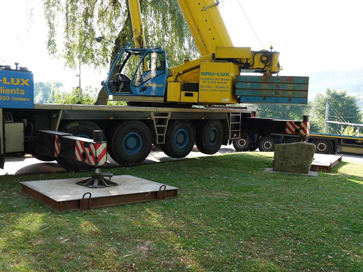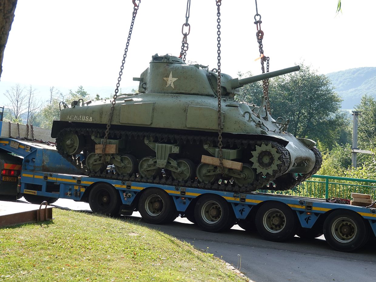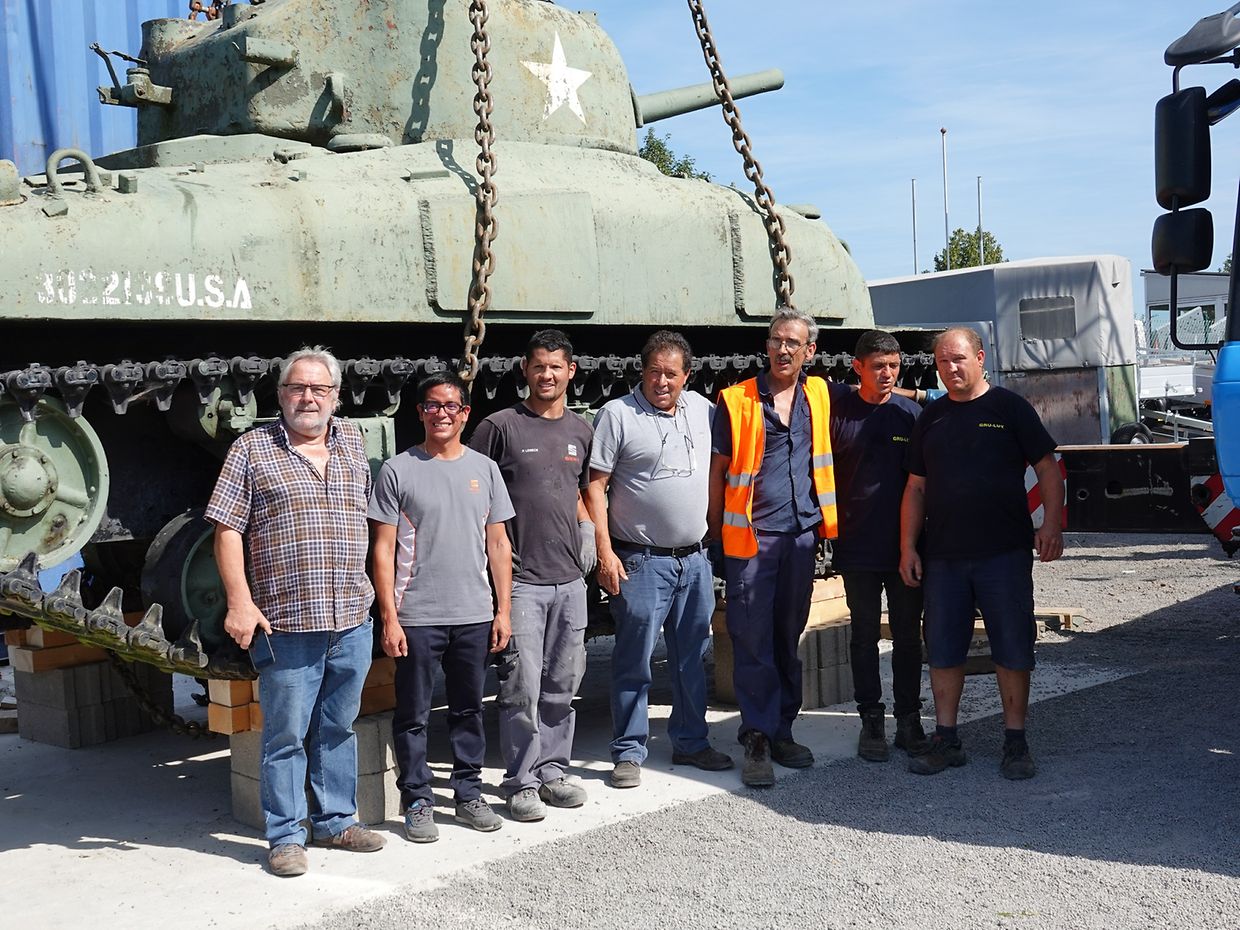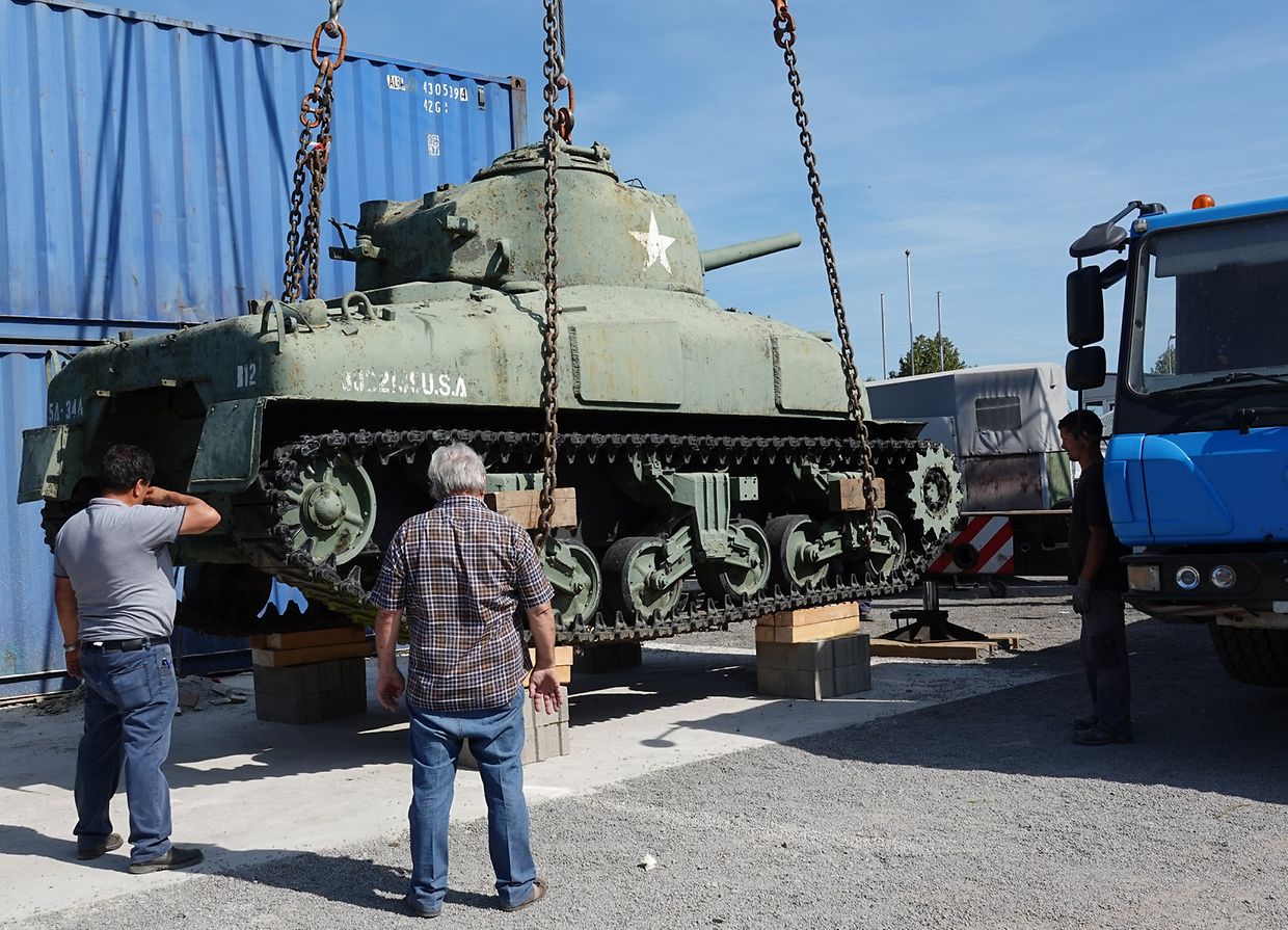 Einmaliges Schauspiel am frühen Morgen des 27.7.2018 beim Pattondenkmal. Der 36 Tonnen wiegende Sherman-Panzer wurde von seinem Sockel gehievt und auf einen Tieflader gestellt, um von dort in die Garage Leweck transportiert zu werden. Dort soll die dicke Farbschicht per Sandstrahl entfernt werden und erneuert werden. Alles erfolgte auf Initiative der Verantwortlichen des Musée Patton.