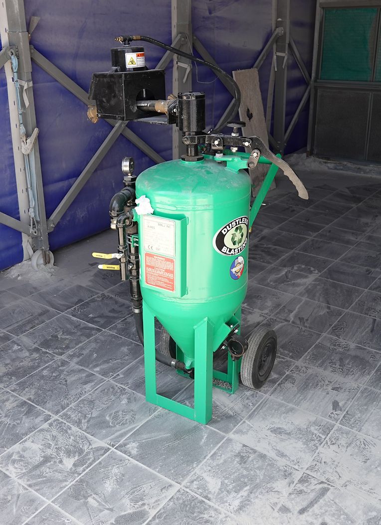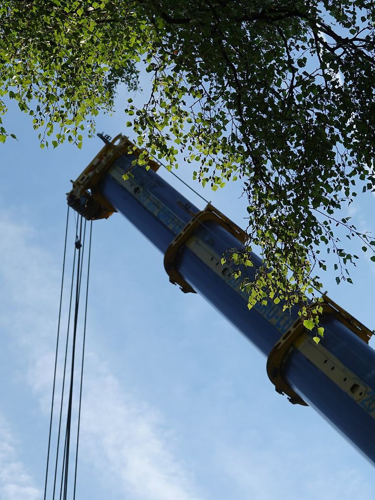 Der Kran musste seine Arbeitsstätte verlassen und vor der Sandstrahlkabine der Firma Leweck auf 4 Sockeln von etwa 60 Zentimetern Höhe zur Behandlung abgestellt werden.