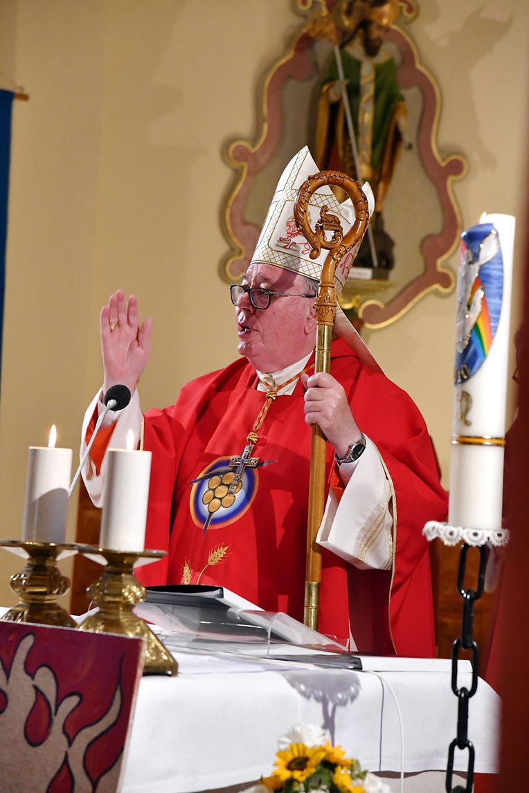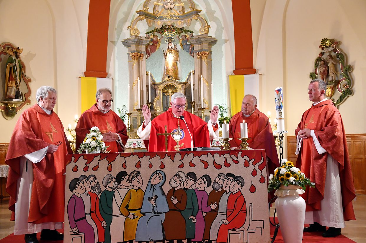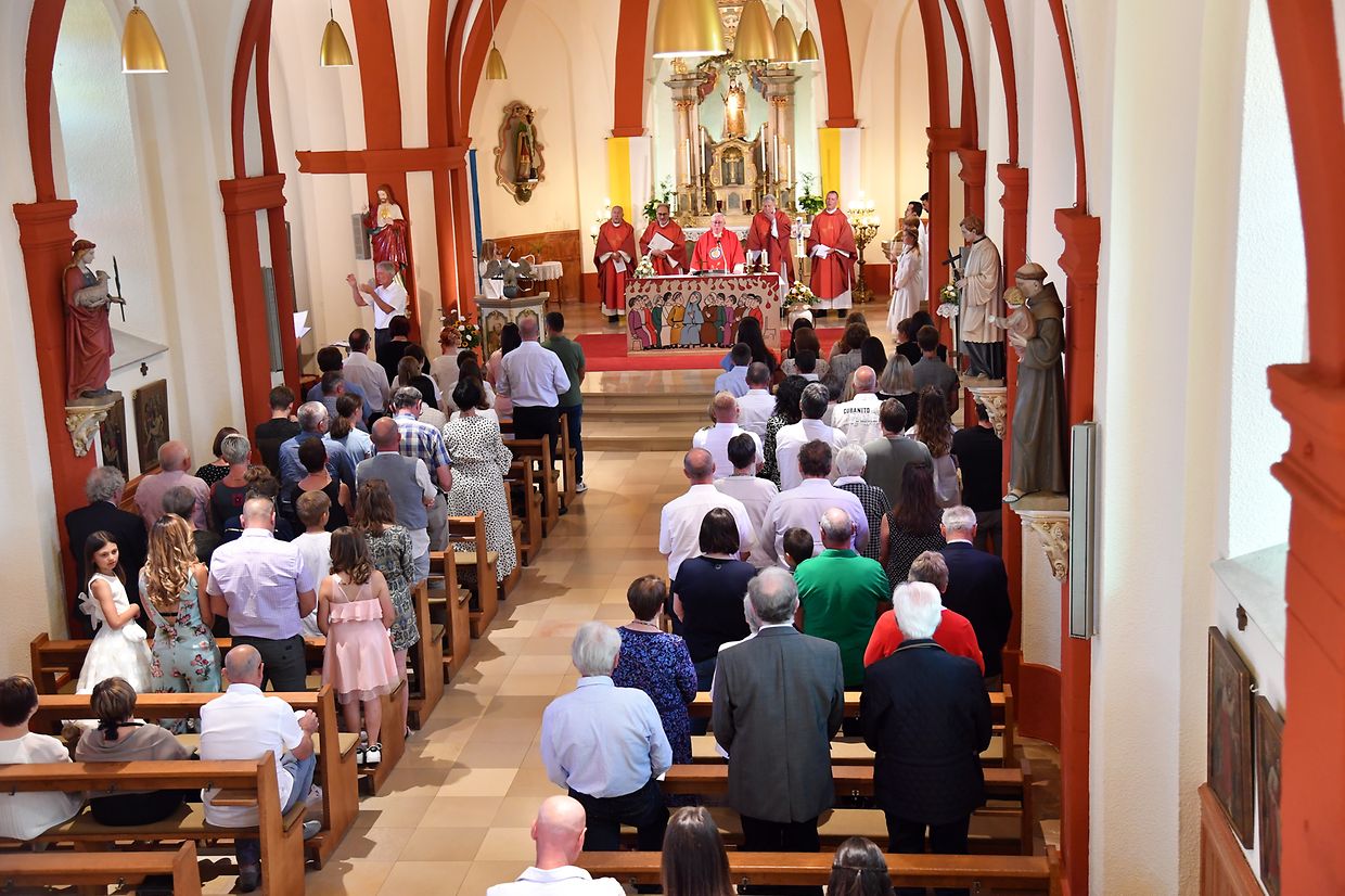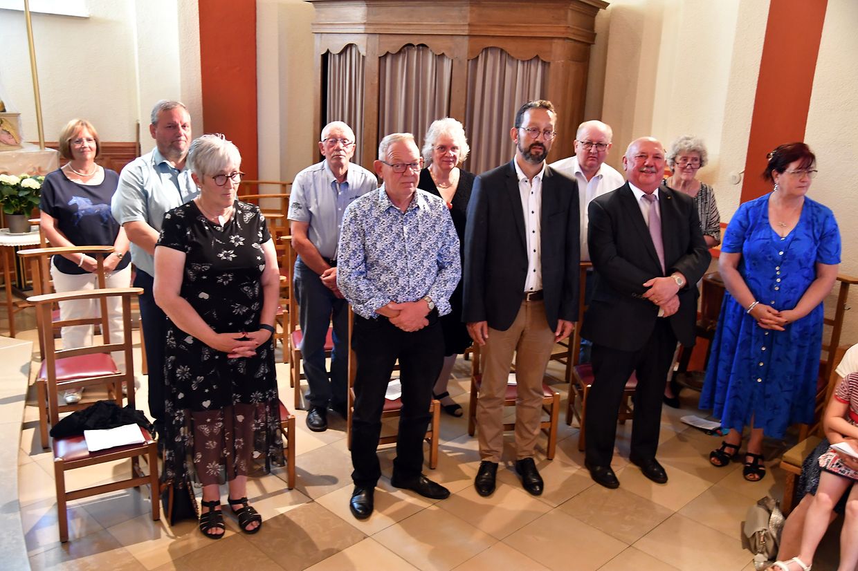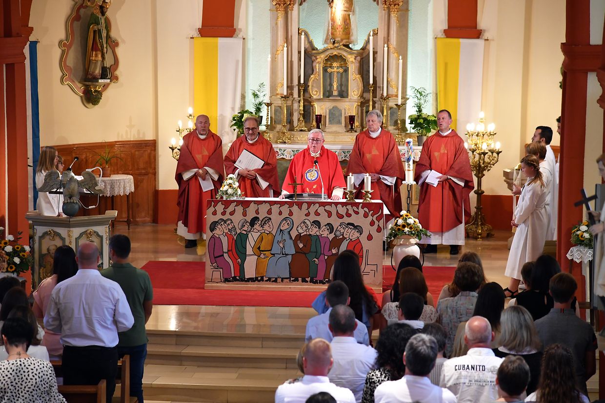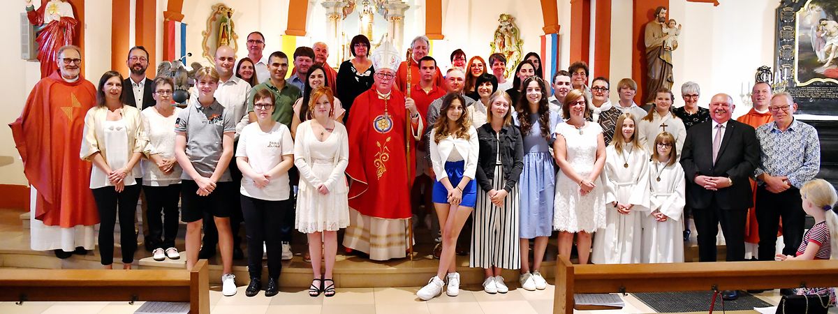Ieverléng: Viru Kuurzem huet de Kardinol Jean- Claude Hollerich, 12 Jugendlicher aus der Par Atertdall Sainte- Claire an der schéi gerëschter Kierch vun Ieverléng, d’Sakrament vun der Firmung gespend. Gläich bei sengem Ukommen ass den héiche Gaascht ganz haerzlich virun der Kierch empfaange gin. Am Verlaaf vum Gottesdëngst zelebréiert vum Kardinol Jean- Claude Hollerich mam Pater Jean- Jacques Flammang an de Geeschtlichen Mathieu Janssen, René Reuter an Vincent Billot op senger Säit, hun di 12 Jugendlicher no der Erneierung vum Daafverspriechen d’Sakrament vun der Firmung empfaangen. Die feierlich Mass gouf vum Gesangveräin aus der Gemeng Useldéng ënnert der Leedung vum Fernand Even mam Carlo Philippe op der Uergel gesanglich a musikalisch verschéinert. Duerno huet d’Gemengeverwaltung Useldéng op den Empfank an de Festsaal agelueden, wou de Buergermeeschter Pollo Bodem an treffenden Wieder d’Wichtigkeet vun der Kierch an de Mëttelpunkt gestallt huet. (CR ) (Fotoen Charel Reiser)