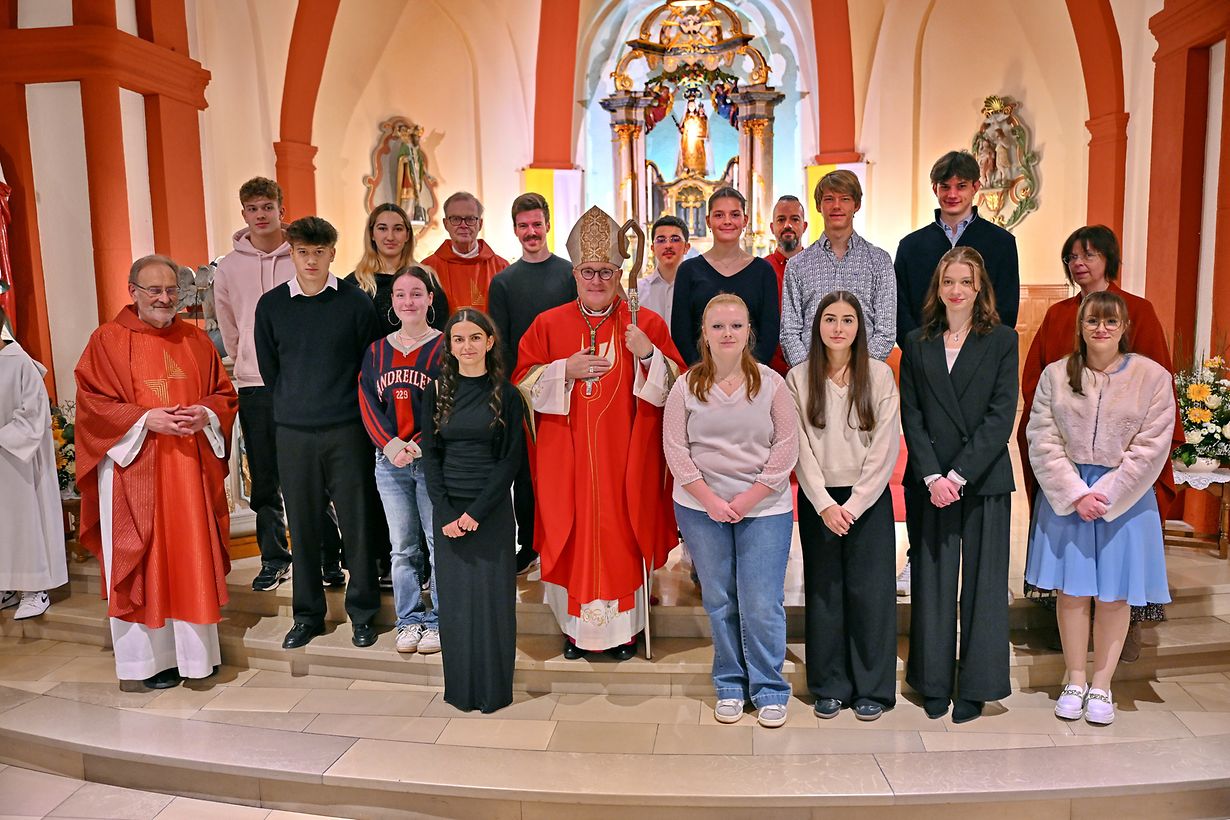 Ieverléng: An der festlich gerëschter Kierch vun Ieverléng hun e Freiden, den 22. November, 15 Jugendlicher aus der Paren Äischdall an Atertdall, d’Sakrament vun der Firmung empfangen. De feierlichen Gottesdëngst gouf vum Weibëschof Léo Wagener zesummen mam Pater Jean- Jacques Flammang a Pater Nico Turmes konzelebréiert. Den Gesanglichen Deel haat d’Chorale aus der Gemeng Useldeng mat hirem Dirigent Fernand Even an Organist Carlo Phillippe iwerholl. Wärend der Mass huet d’Presidentin vum Pastoralrot Betty Heimermann- Wio d’Wuert ergraff an ass kuurz op Bedeitung vun der Firmung agaangen. Weider Mercien gongen un d’Memberen vum CGP fir hir Presenz, un d‘Arbechtsgruppen, an de Massendinger an natirlich och un d’Firmlingen, den Yves Peters den Pater Nico Turmes, déi d’Firmlichen virbereet hun an och zesummen och eng schéi Mass matgestallt hun. Och all de Leit, Joncker a Kanner, déi present waren gouf Merci gesoot. Gottes Geescht soll duerch dess schéi Firmung an der Par nach besser wierken. Beim Empfank am Festsall huet de Buergermeeschter Pollo Bodem mam Schëffen Raoul Schaaf a senger Ried um Numm vun der Gemeng Useldéng di vill Gäscht mam Weibëschof Léo Wagener, de Pateren Jean- Jacques Flammang an Nico Turmes och häerzlich Wëllkomm geheescht, an zesummen op den traditionellen Éierepatt invitéiert. (CR) (Fotoen: Charles Reiser)