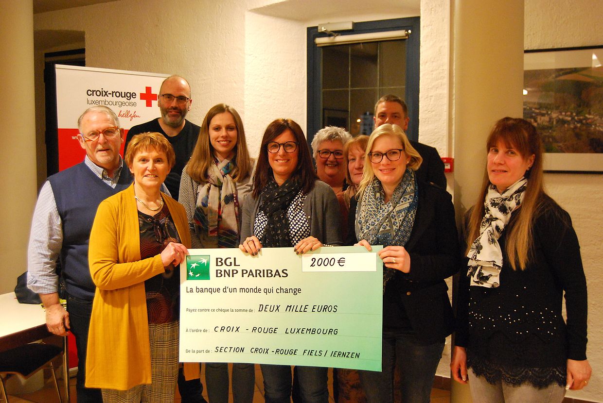 Die Sektion Fiels-Iernzen konnte einen Scheck in Höhe von 2.000 Euro an Frau Michèle Bressanutti übergeben, und zwar für «ihr» Service «Kanner-, Jugend- a Familljenhëllef bei der Croix-Rouge Luxembourgeoise».