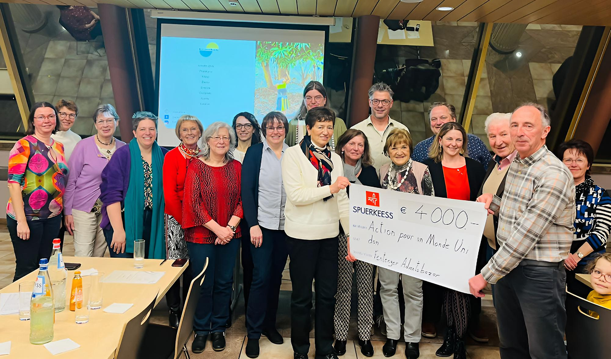 Viru kuerzem hunn d' Fentenger Gesangsveräiner ,Cantabile’ an d’,Fentenger Alouetten‘ déi schéin Zomm vun 4000 un d'Action pour un Monde Uni iwwerreecht.Dës Suen kommen aus dem Erléis vum Adventsbazar, deen traditionell um éischten Adventsweekend vun deenen 2 Veräiner an enger fläisseger Equipe vu weidere Fentenger Leit organiséiert gëtt.Vertrieder vun der A.M.U hunn de Projet erkläert, mat deem Wunnméiglechkeeten fir medezinescht Personal am ländleche Raum an Tansania geschaf ginn.