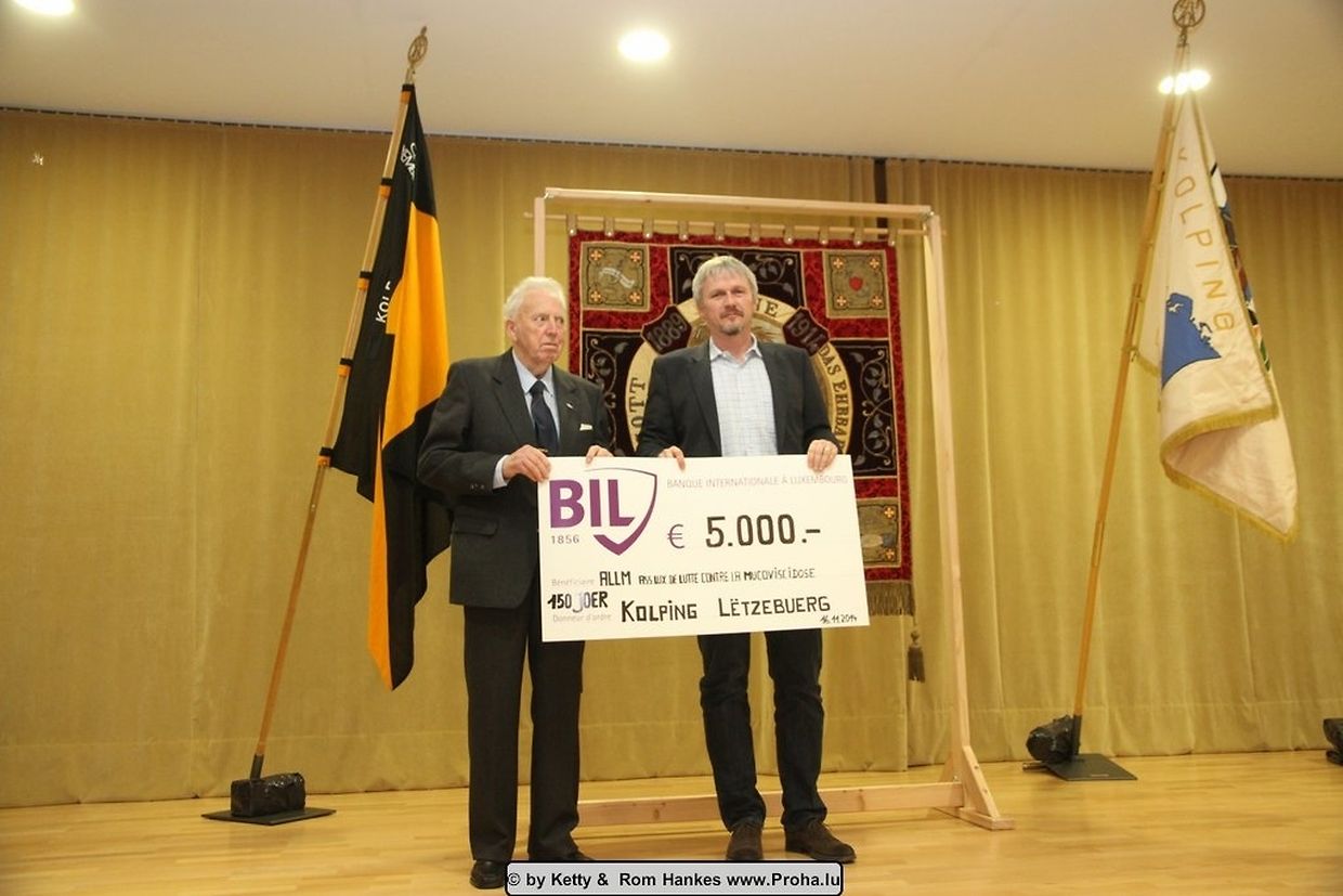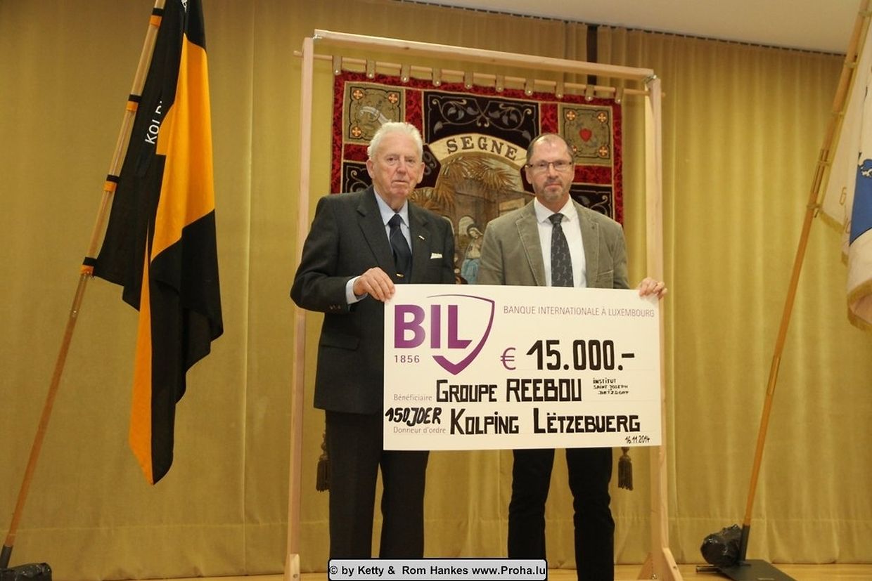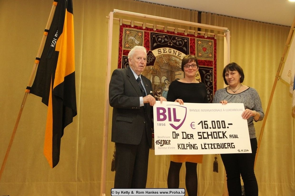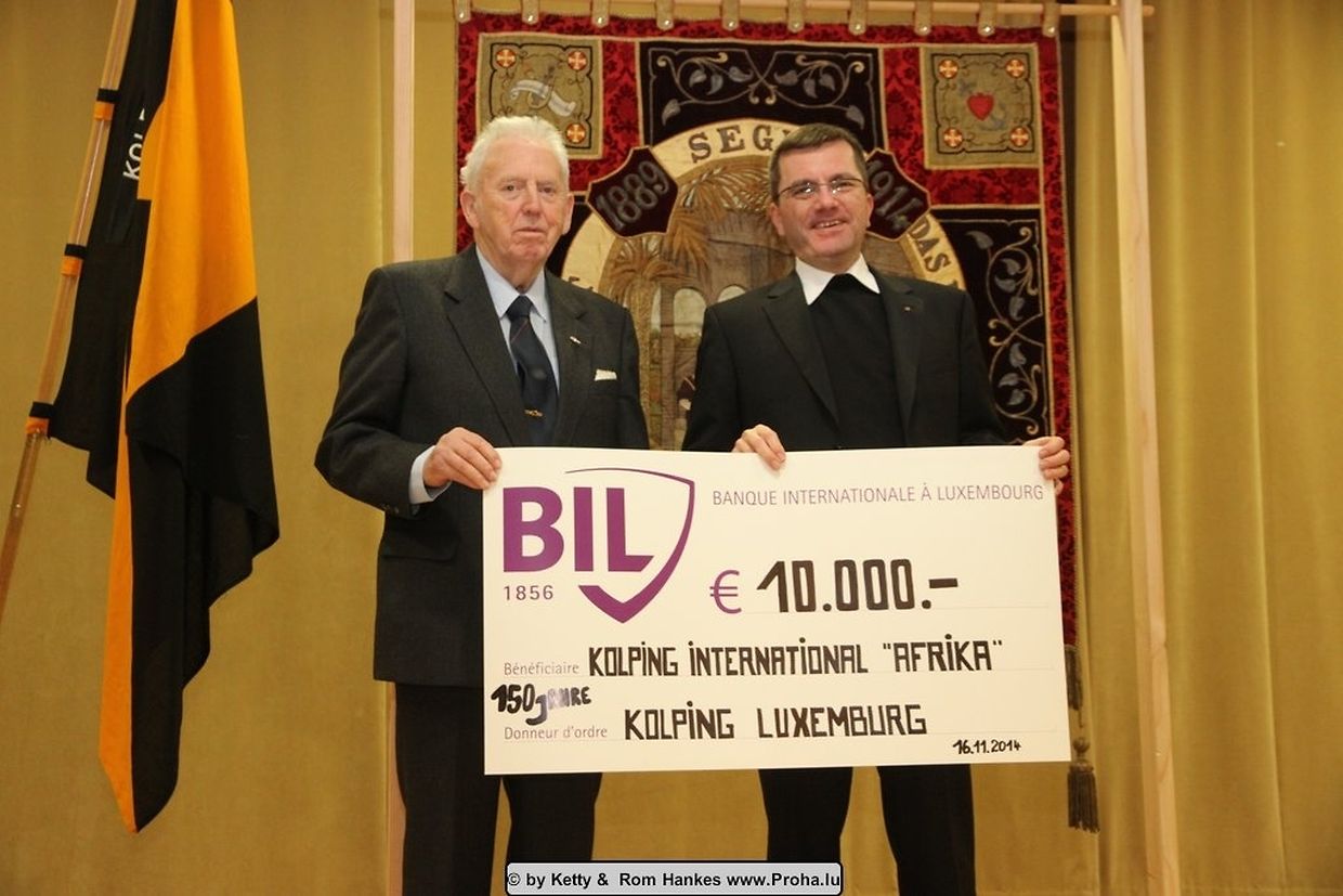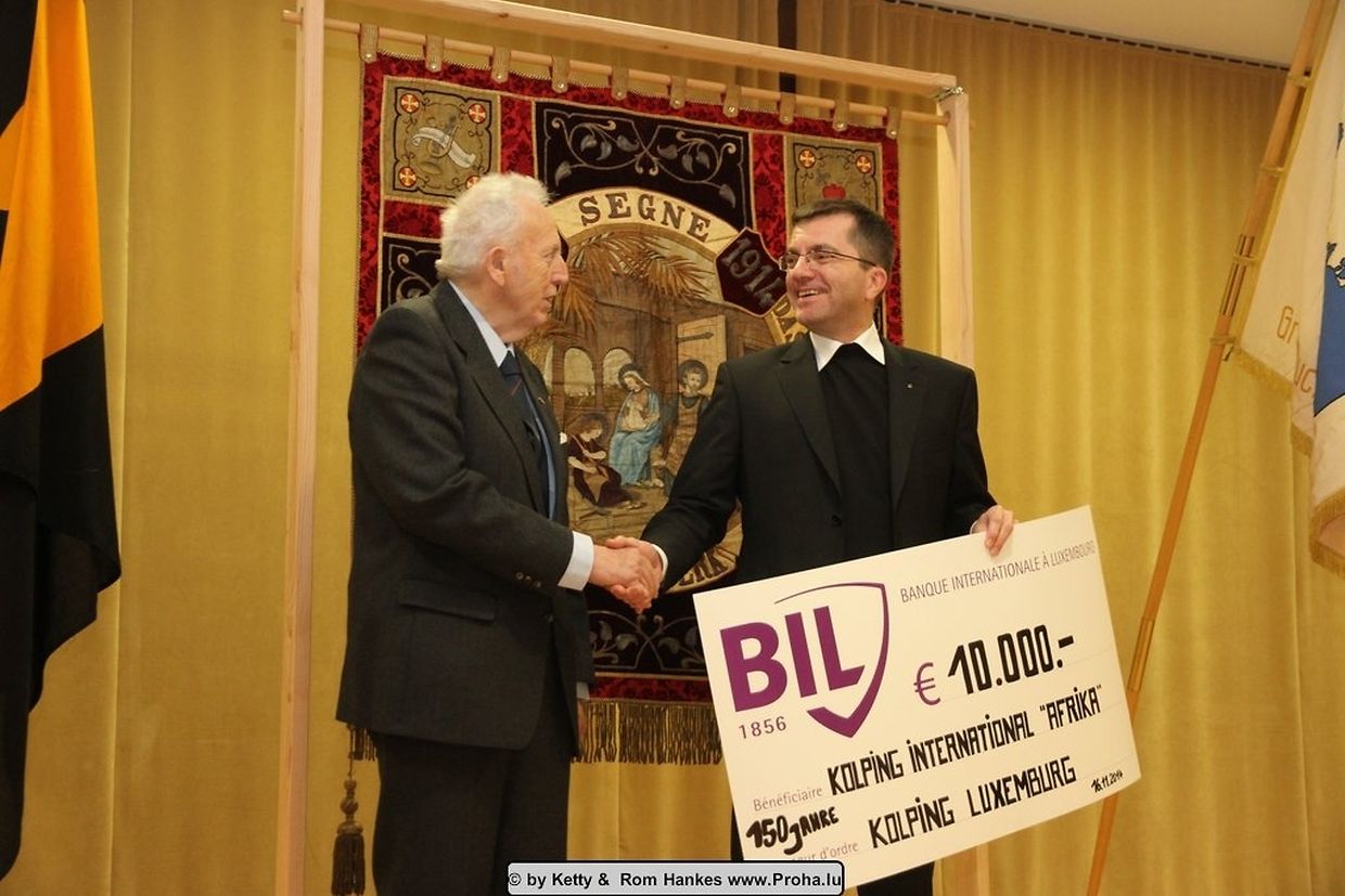 Uschléissend huet de Kolping Lëtzebuerg net manner wéi 12 Schecke verdeelt am Géigewäert vun 150.000 €. 11 Schecken si fir sozial Wierker hei am Land an een fir Kolping International fir hire Projet an Afrika. De Schwäizer Vertrieder vun Dietikon huet fir de Gebuertsdag gratuléiert an dem Pool Schroeder ee grousse Merci gesot fir déi jorelaang gutt Relatiounen.