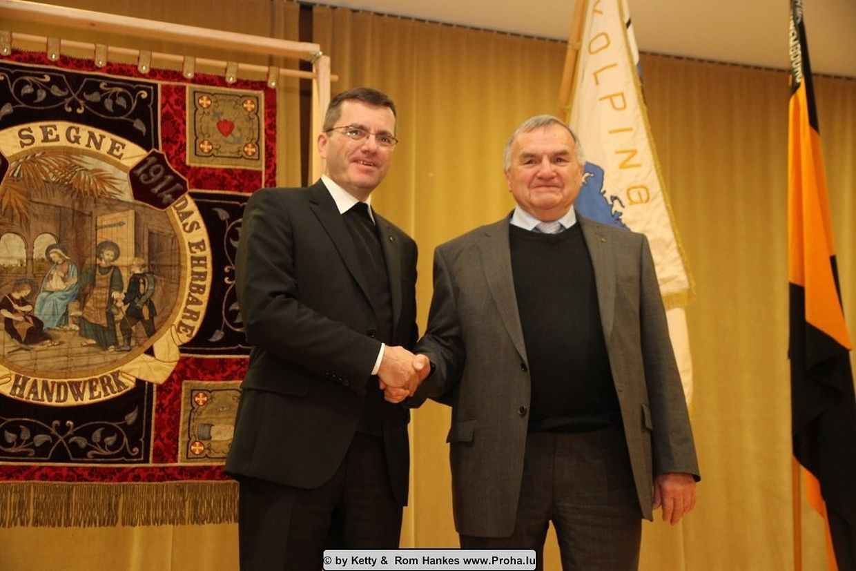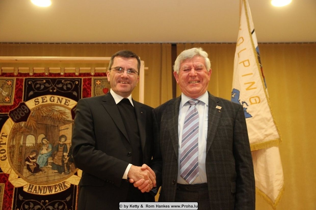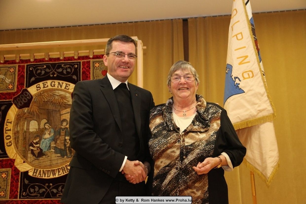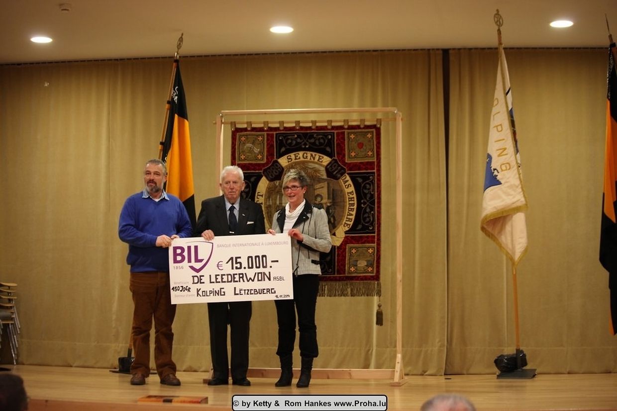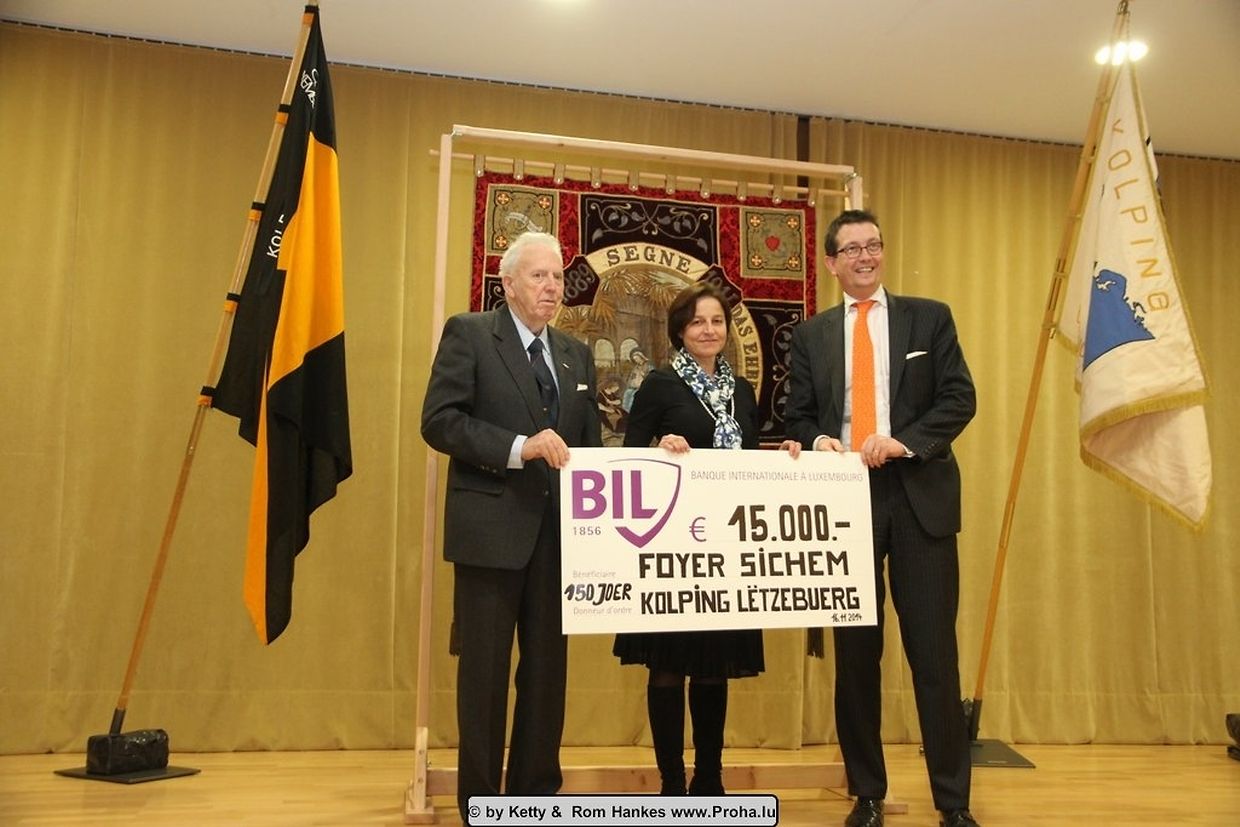 Uschléissend huet de Kolping Lëtzebuerg net manner wéi 12 Schecke verdeelt am Géigewäert vun 150.000 €. 11 Schecken si fir sozial Wierker hei am Land an een fir Kolping International fir hire Projet an Afrika. De Schwäizer Vertrieder vun Dietikon huet fir de Gebuertsdag gratuléiert an dem Pool Schroeder ee grousse Merci gesot fir déi jorelaang gutt Relatiounen.