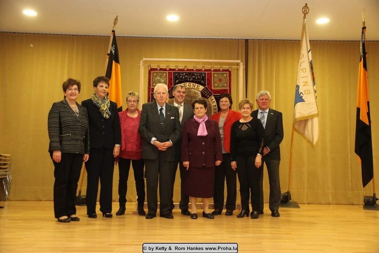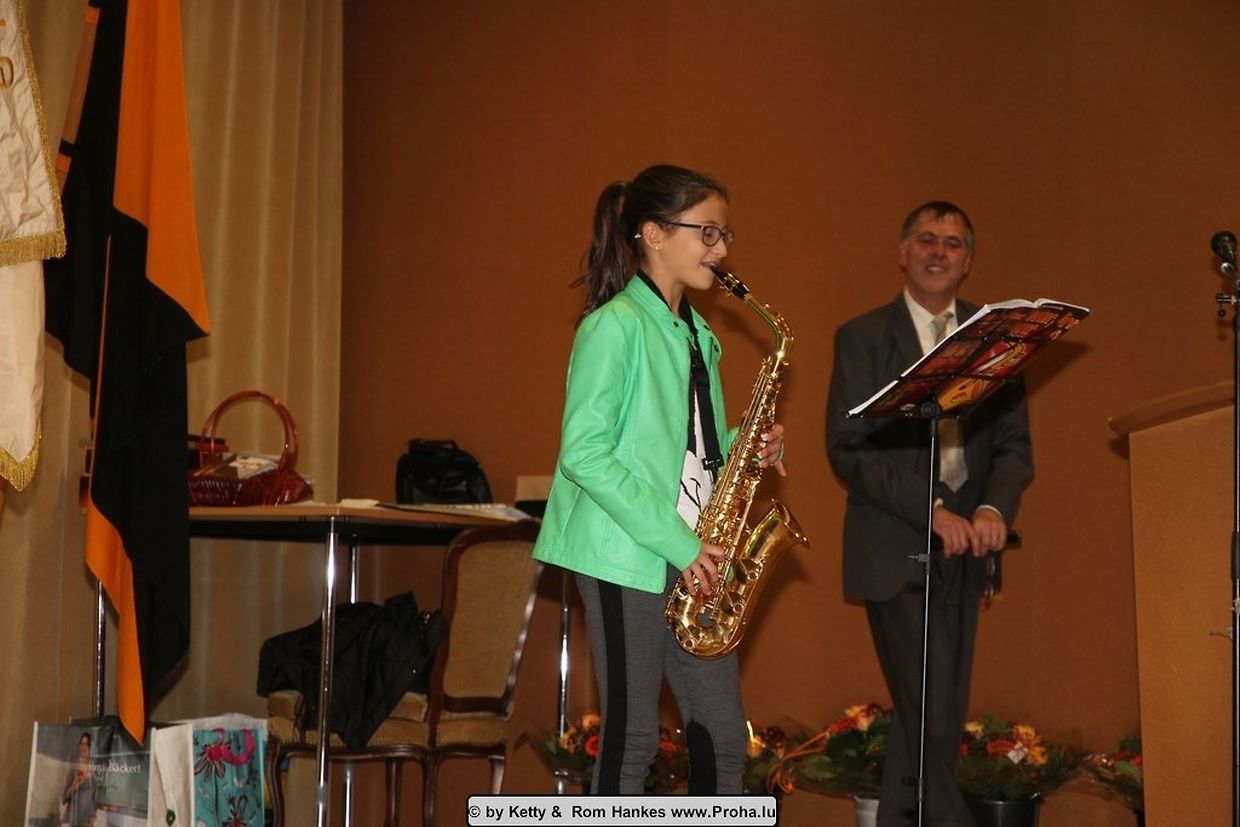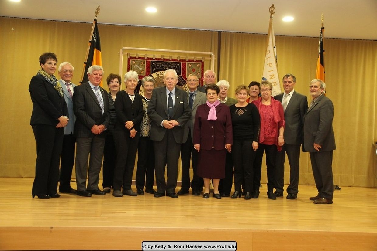 Folgend Membere kruten d’Kolpingspéngel fir 50 Joer Memberschaft iwwerreecht: Pool an Henriette Schroeder-Schmit, Ed. Wagner, Gast a Josette Koch-Putz, Jeng an Lotti Funck-Schumacher, Bormann Théophile, Jo an Odile Weiser-Dumont. Daat klengt Melina huet deene Geéierten ee Stännchen um Saxophon gespillt.