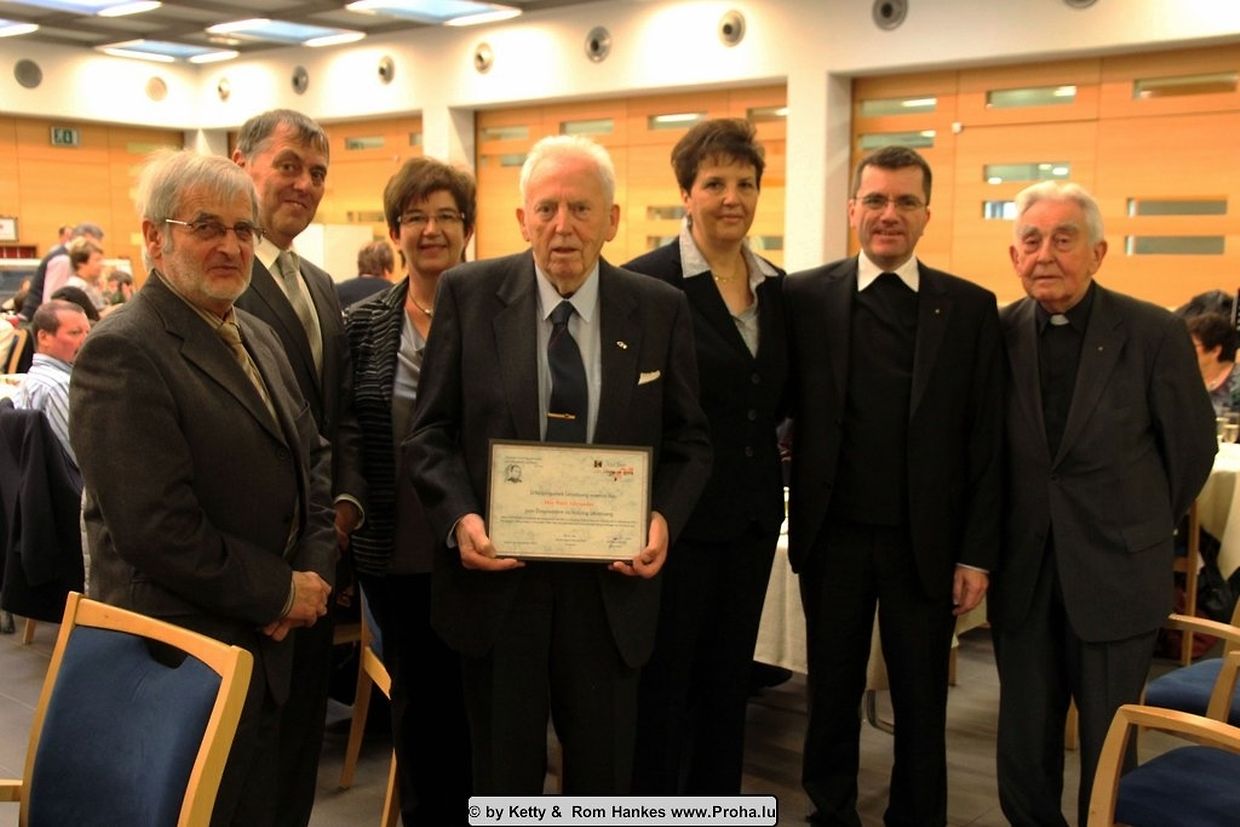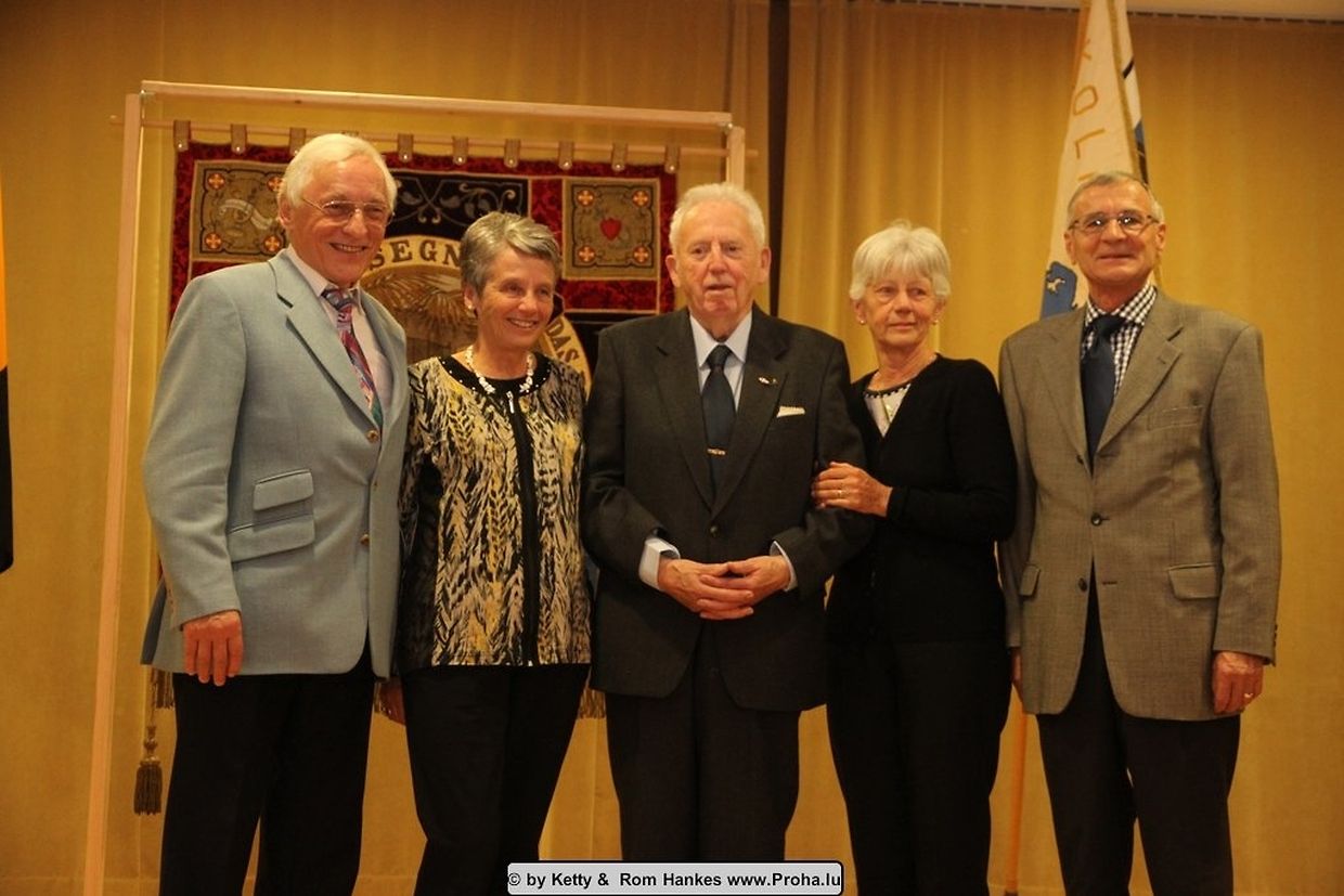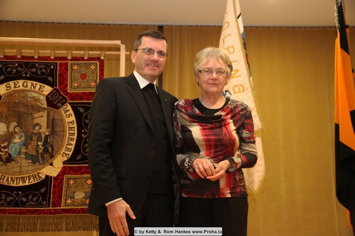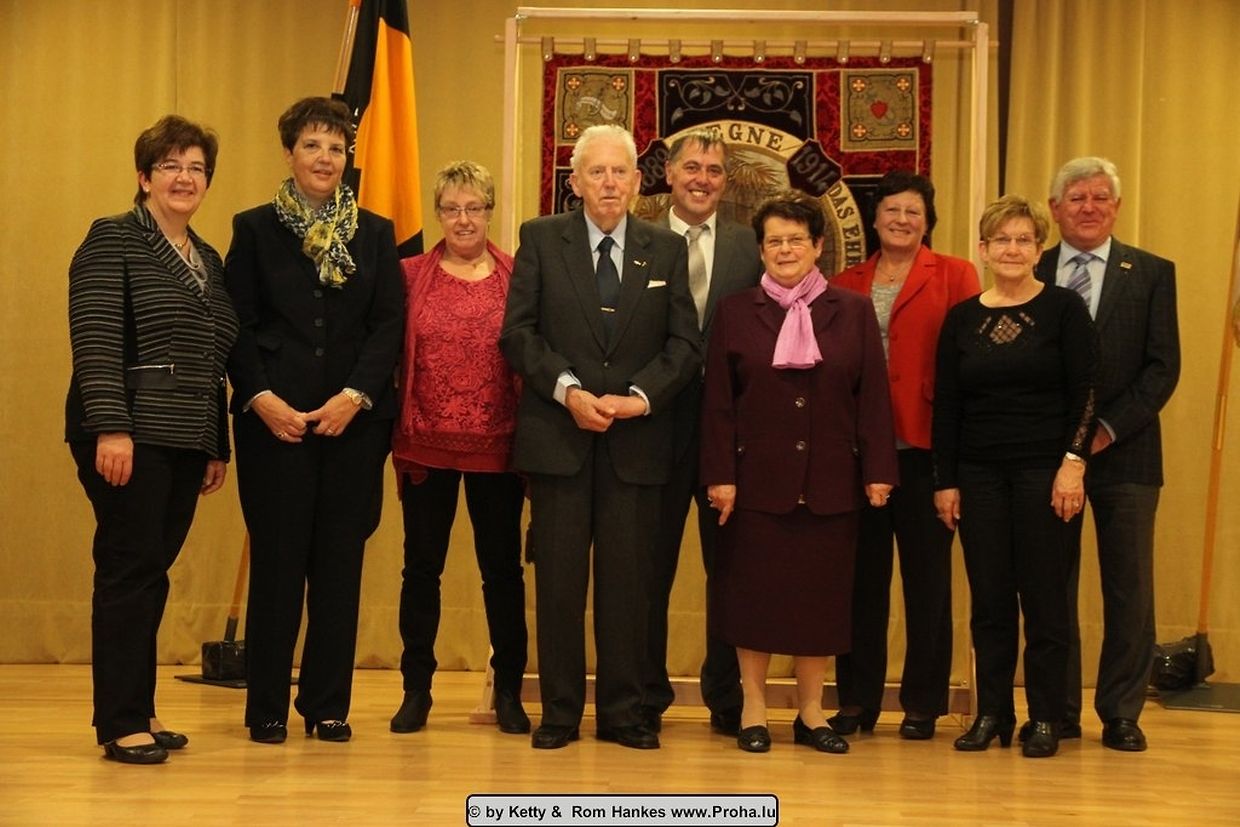 Folgend Membere kruten d’Kolpingspéngel fir 50 Joer Memberschaft iwwerreecht: Pool an Henriette Schroeder-Schmit, Ed. Wagner, Gast a Josette Koch-Putz, Jeng an Lotti Funck-Schumacher, Bormann Théophile, Jo an Odile Weiser-Dumont. Daat klengt Melina huet deene Geéierten ee Stännchen um Saxophon gespillt.