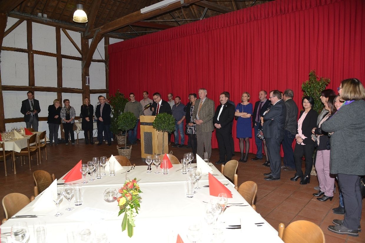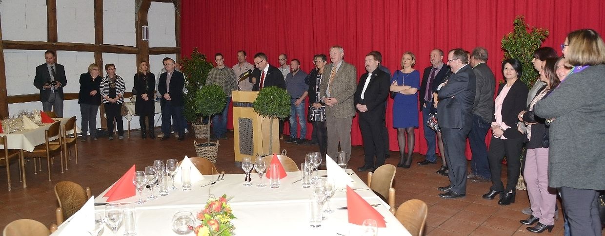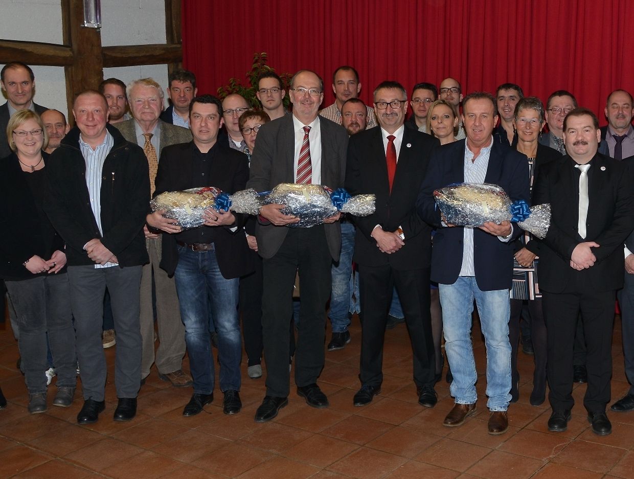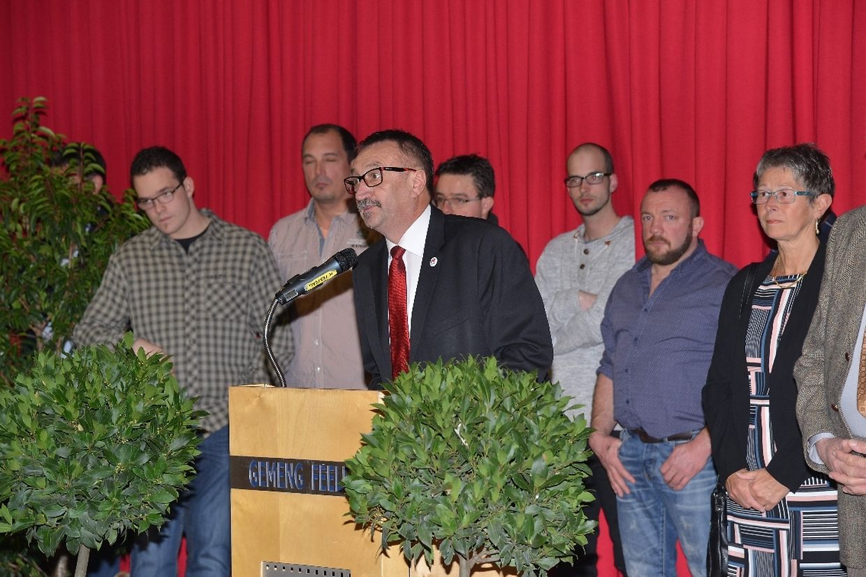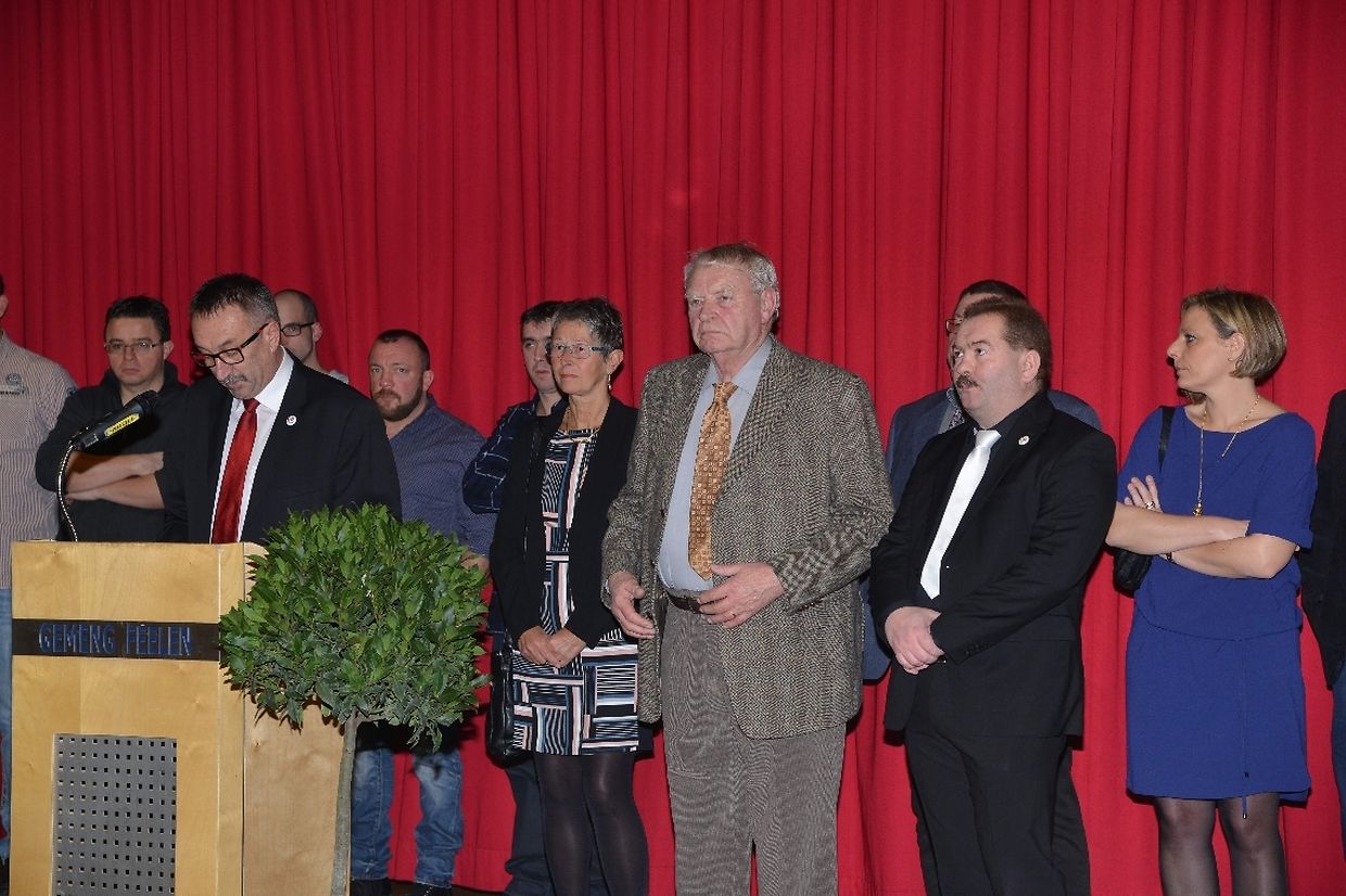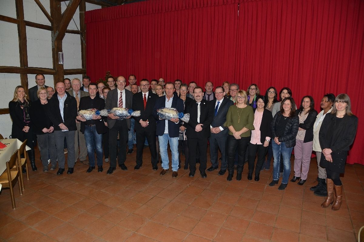 Feulen: Im Kulturzentrum Hennesbau in Feulen fand neulich im Beisein zahlreicher Mitbürger und Ehrengäste die Jahresabschlussfeier der Gemeinde Feulen statt. Im Anschluss an seine Neujahrswünsche und Dankesworte an alle Mitarbeiter wo in einer konstruktiven Zusammenarbeit verschiedene Projekte in einem arbeitsreichen Jahr in die Wirklichkeit umgesetzt werden konnten, ging Bürgermeister Fernand Mergen kurz auf die bevorstehenden geplanten Infrastrukturen ein die während des Jahres 2017 in Angriff genommen werden. Besonders stolz zeigte sich das Gemeindeoberhaupt auf den Neuzugang von 48 Anwohnern womit die Population in Gemeinde Feulen auf insgesamt 2015 Einheiten heranwuchs. Bei der anschließenden Personalehrung ging sein spezieller Dank an Fränk Wies und Myriam Glodt die mit viel Einsatz in der lokalen maison relais und in der Kinderbetreuung während langer Jahre tätig waren. Ein Geschenk zum Abschied war der Dank für ihre geleistete Arbeit. Gast Kuffer, langjähriger Angestellter im Technischen Dienst, musste nach zehn Jahren Tätigkeit aus Gesundheitsgründen seinen Posten als Gemeindearbeiter aufgeben. Mit einem passenden Präsent wurde Gast Kuffer mit aufrichtigem Dank in den Ruhestand verabschiedet. Roland Philippe , langjähriger „ Préposé“ bei der Straßenbau Verwaltung Diekirch sowie Jang Scheepers während vieler Jahre als „ Cantonnier“ bei der Brigade Feulen im Einsatz. Beide wurden für ihre stete gute Zusammenarbeit als Anerkennung mit einem Geschenk eine erholsame Pension gewünscht. Nach der Vorstellung des neu eingestellten Gemeindepersonals wurde das vergangene Jahr mit einem deftigen Abendessen verabschiedet. (TEXT/FOTOS: CHARLES REISER)