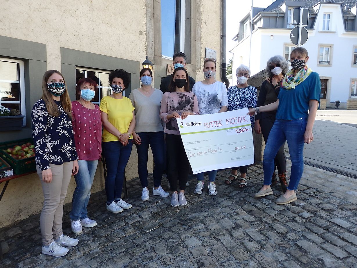Enn Mäerz huet de Buttek Mosaïk offiziell e Chèque vun 12.664 € un d’ONG « Action pour un Monde Uni » iwwerreecht.
