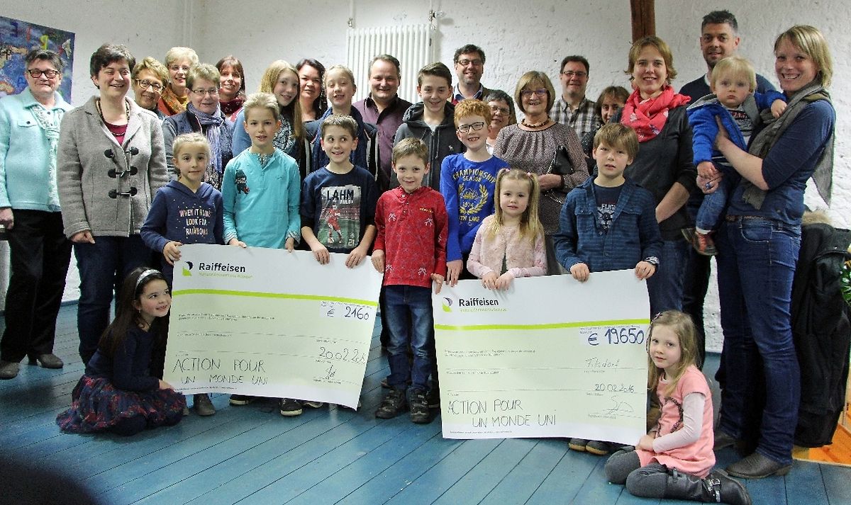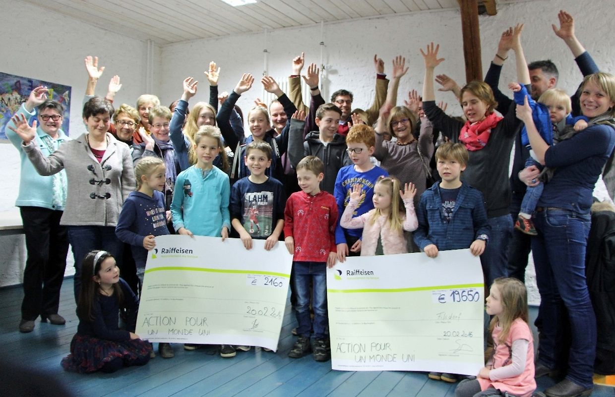 Vor einigen Tagen überreichte der „Butték Mosaik“, 11 Kiirchestross in Filsdorf eine Spende in Höhe von 21.810 Euro an die Nichtregierungsorganisation „Action pour un Monde Uni“. „Butték Mosaïk“ ist eine Initiative der « Wirtschaft in Gemeinschaft », nach deren Kriterien sich weltweit über 700 Betriebe richten. Originelle und originale Artikel aus der Schweiz, Italien, Slowakei, Mexiko, Kenia, und Argentinien eignen sich als Geschenke für jedes Fest und bei jeder Gelegenheit. Der Erlös der Jahre 2014 und 2015, stammt von vielen Aktionen sowie dem alljährlichen „Tag der Offen Tür“ am ersten Advent. „Buttek Mosaïk“ spendet seinen Gewinn integral für die Linderung der Armut und für die Verbreitung der Kultur des Gebens und des miteinander Teilens. Das Geld wird von der „Action pour un Monde Uni“ für den Bau einer Entbindungsstation in Kinshasa (Demokratische Republik Kongo) und für ein Weiterbildungsprojekt von 21 Organisation in Südamerika verwendet. (G.L.) www.cercle.lu