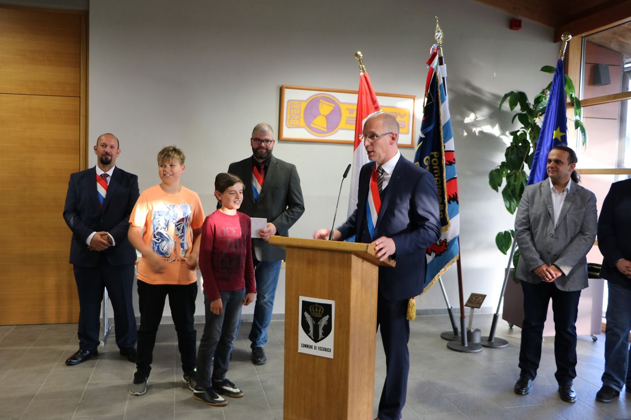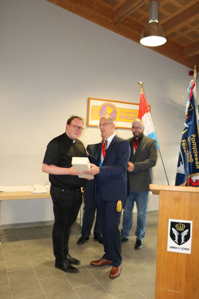 Nationalfeierdag gëtt an der Gemeng Fëschbech ëmmer ganz traditionell um Virowend gefeiert. De Cortège ugefouert vun de lokale Pompjeeën ass erop an Kierch gaangen, wou den TeDeum mam Paschtouer Tristan Häcker gefeiert gouf. Duerno ass d'Heemecht, no der Gedenkminutt beim Monument, gesonge ginn. Uschléissend war all Bierger an Veräinshaus op Schous invitéiert, wou de Buergermeeschter Fränk Daems, eng Ried gehalen huet an déi verdéngschtvoll Matbierger geéiert huet. Ugefaangen bei de Pompjeeën fir 15 Joer de Luss Brosius, fir 25 Joer de Pol Daems, fir 30 Joer de Paul Brosius an de René Jacobsen an 4 Jugendpompjeeën kruten hiert Bronzen Ofzeechen am Wëssenstest. D'Jofferen Mireille Garson an Jacquie Wagener goufen fir 20 Joer an der Angsber Schoul geéiert, esou wéi den Edmond Haas fir seng Joren als President vum Schoulcomité. Dem Paschtouer Tristan Häcker huet de Buergermeeschter fir seng rezent Wei gratuléiert. 4 Sportlech Matbierger konnten fir hire Merite geéiert ginn an de Schäfferot huet dem Patrick Dennessen säi "Biketrip to Rome" mat zwou Scheckiwwerreechungen ënnerstëtzen. Zum Ofschloss huet Chorale nach emol d'Heemecht ugestëmmt an den Owend ass mat engem Patt an engem gudde Maufel op der Héicht ausklénge gelooss ginn.