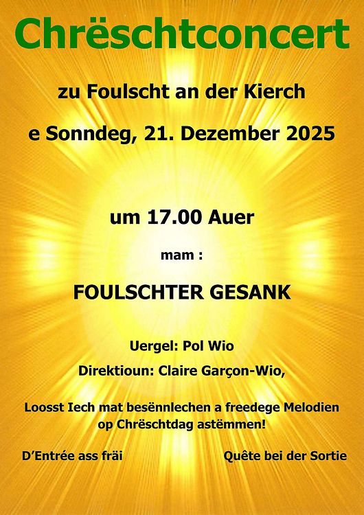 De Foulschter Gesank invitéiert Iech ganz häerzlechst op säin traditionelle Chrëschtconcert de 21.12.2025 um 17.00 Auer zu Foulscht an der Kierch. Loosst Iech mat besënnlechen a freedege Melodien op Chrëschtdag astëmmen! Wéi all Joer invitéiere mir Iech nom Concert op eng Zopp mat engem gudde Patt an de Centre Culturel