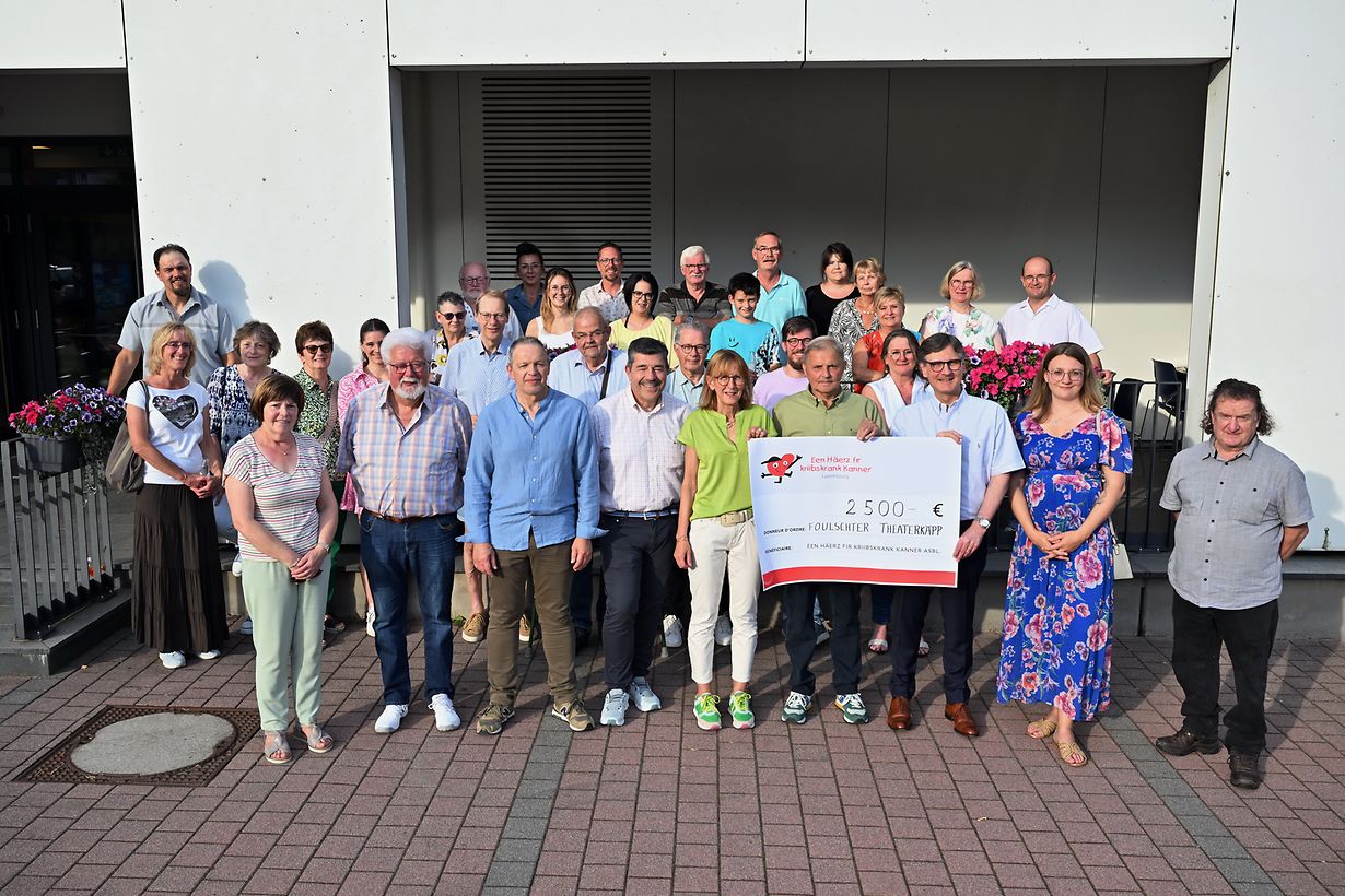 Foulscht: Ganz solidarisch mat de kriibskranke Kanner hun sech d’Foulschter Theaterkäpp“ den 19. Juli bei hirer Scheckiwerreechung beim Centre Culturel zu Fouscht, gewiesen. Wie den President Armand Klein agaangs erklärt huet, stellt dese Beitrag den Deel vum Erléis vun den Theateropféierungen vun 2023- E Faulschen Mexikaner an vun 2024- En Diva kënnt seelen eleng, duerstellt. Och huet de President drop gehaalen, fir allen Akteuren, Benevolen a Sponsoren fir hirt Engagement an hir Ënnerstëtzung villmols Merci ze soen, sou dat béid Opféierungen och e vollen Erfolleg waren. Mat sengem oprichtigem Merci, huet den Dr. Marc Diederich, de Scheck vun 2 500 Euro entgéint geholl, den der Fondatioun Een Häerz fir kriibskrank Kanner zugut könnt. Hien huet weider och erklärt, wéi di Suen och wirkungsvoll agesaat gin an dovunner jeweils 10 Prozent an d’Fuerschung géint de Kriibs hir Verwendung fanne waerten. (CR) (Foto: Charles Reiser)