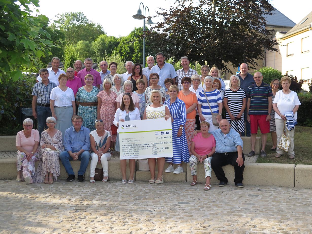 Trotzdeem sinn « Fraen a Mammen Helleng/Fréiseng » awer enorm houfreg, endlech e Chèque an der Héicht vu 29 500 €, deen duerch den Erléis vun der Kaffisstuff, déi am Advent 2019 organiséiert gouf, wéi och duerch Theaterspillen am Mäerz 2020, u 6 verschidde sozial Wierker kënnen z’iwwerreechen.