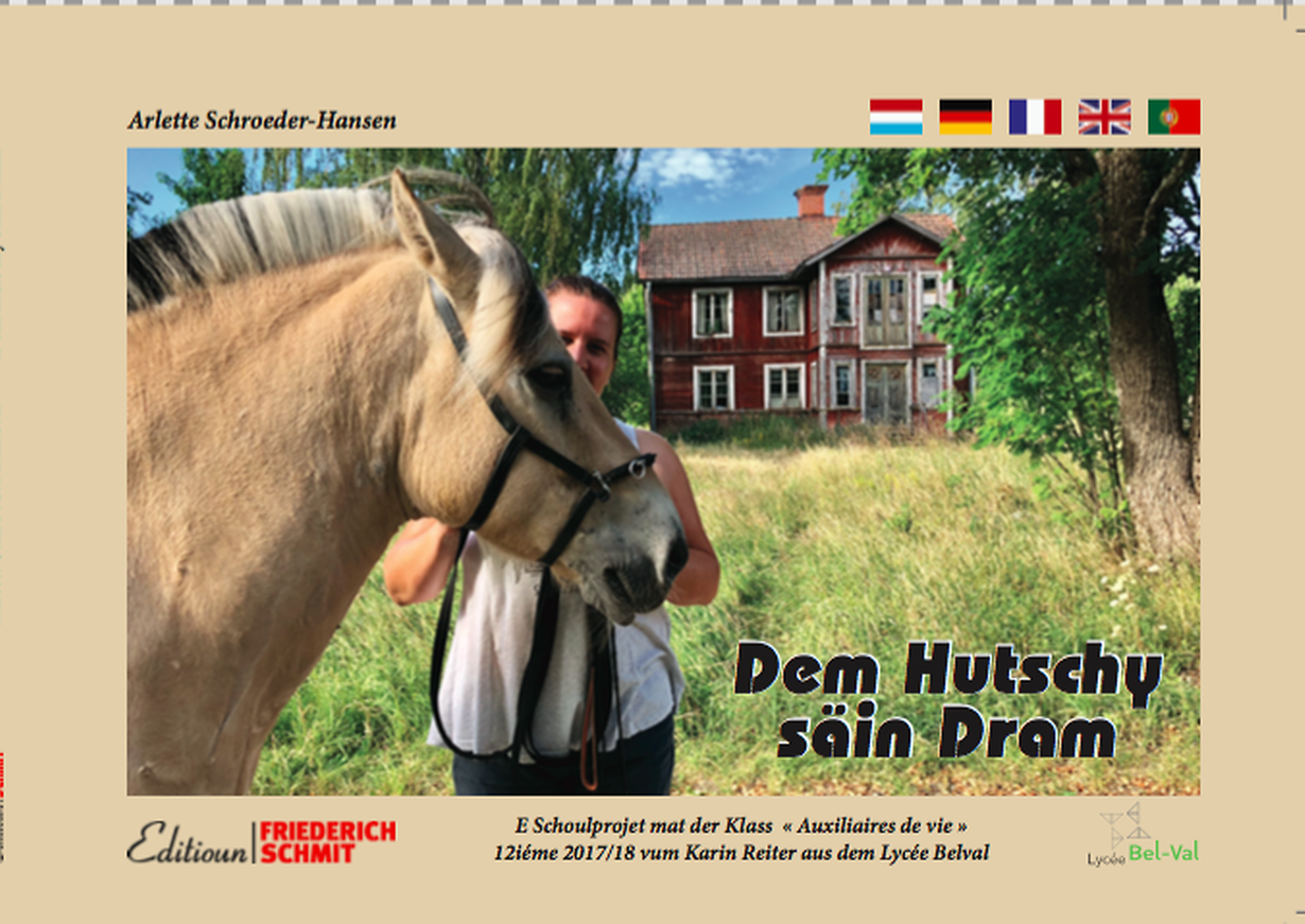 Die 12ième "Auxiliaires de vie" 2017/18 aus dem Lycée Belval hat im vergangenen Schuljahr mit großer Begeisterung und Einsatz, das neue Kinderbuch von Arlette Schroeder- Hansen gestaltet. Die Schülerinnen zeichnen verantwortlich für die Illustrationen und haben auch bei den verschiedenen Übersetzungen tatkräftig mitgeholfen. So entstand die Geschichte des Fjordpferdes Hutschy und der Kraniche auf luxemburgisch, deutsch, französisch, englisch und portugiesisch. Das Buch, welches bei Edition Friederich- Schmit herauskam, ist für 20 € im Handel zu erwerben und eignet sich für Kinder ab 5 Jahren.