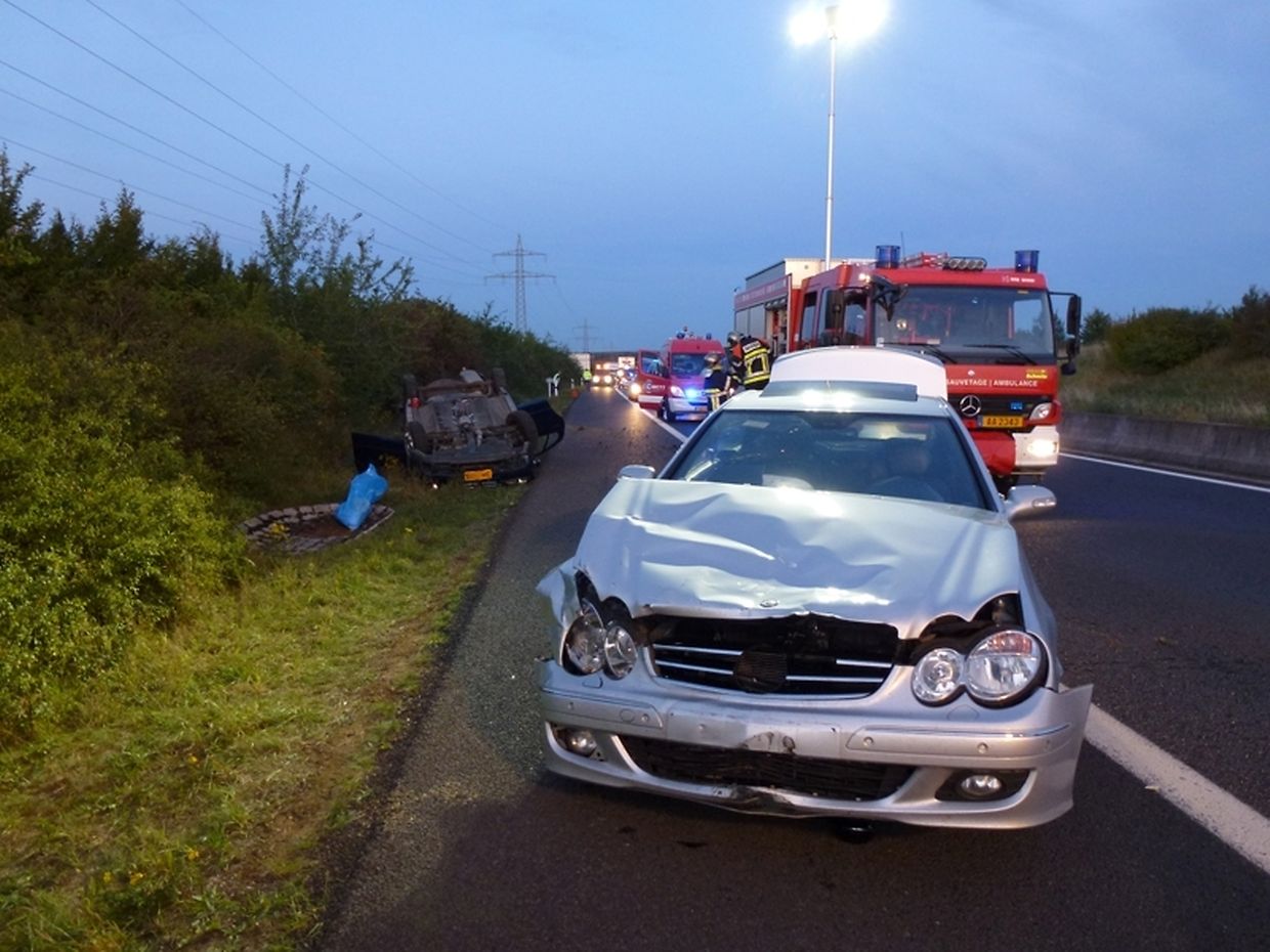 Am Abend des 10.September ereignete sich gegen 19:17 Uhr ein schwerer Verkehrsunfall auf der A13 in Richtung Luxemburg. Bei hoher Geschwindigkeit fuhr ein PKW auf ein weitere Fahrzeug auf. Dieses schleuderte durch die Wucht des Aufpralls in den Graben und überschlug sich. In beiden Fahrzeugen erlitt die Insassen mehr oder weniger schwere Verletzungen. Ein Hund, welcher ebenfalls im Fahrzeug war, blieb unverletzt und wurde von den Rettungseinheiten im Einsatzzentrum versorgt bis er durch Verwandte abgeholt wurde. Bereits vor Eintreffen der Rettungseinheiten hatten alle Personen ihre Fahrzeuge mit Hilfe von Ersthelfern verlassen. Im Einsatz waren neben dem Einsatzzentrum Bettemburg mit HTLF, VRW/ELW, RTW1 und RTW2 auch die Feuerwehren aus Frisingen und Aspelt, ein Rettungswagen aus Remich, der SAMU Luxemburg mit dem Rettungshubschrauber sowie der SAMU aus Esch und die Polizei. Die Autobahn musste für die Rettungs- und Bergungsarbeiten komplett in Richtung Hellingen gesperrt werden, wodurch es zu erheblichen Verkehrsproblemen kam.