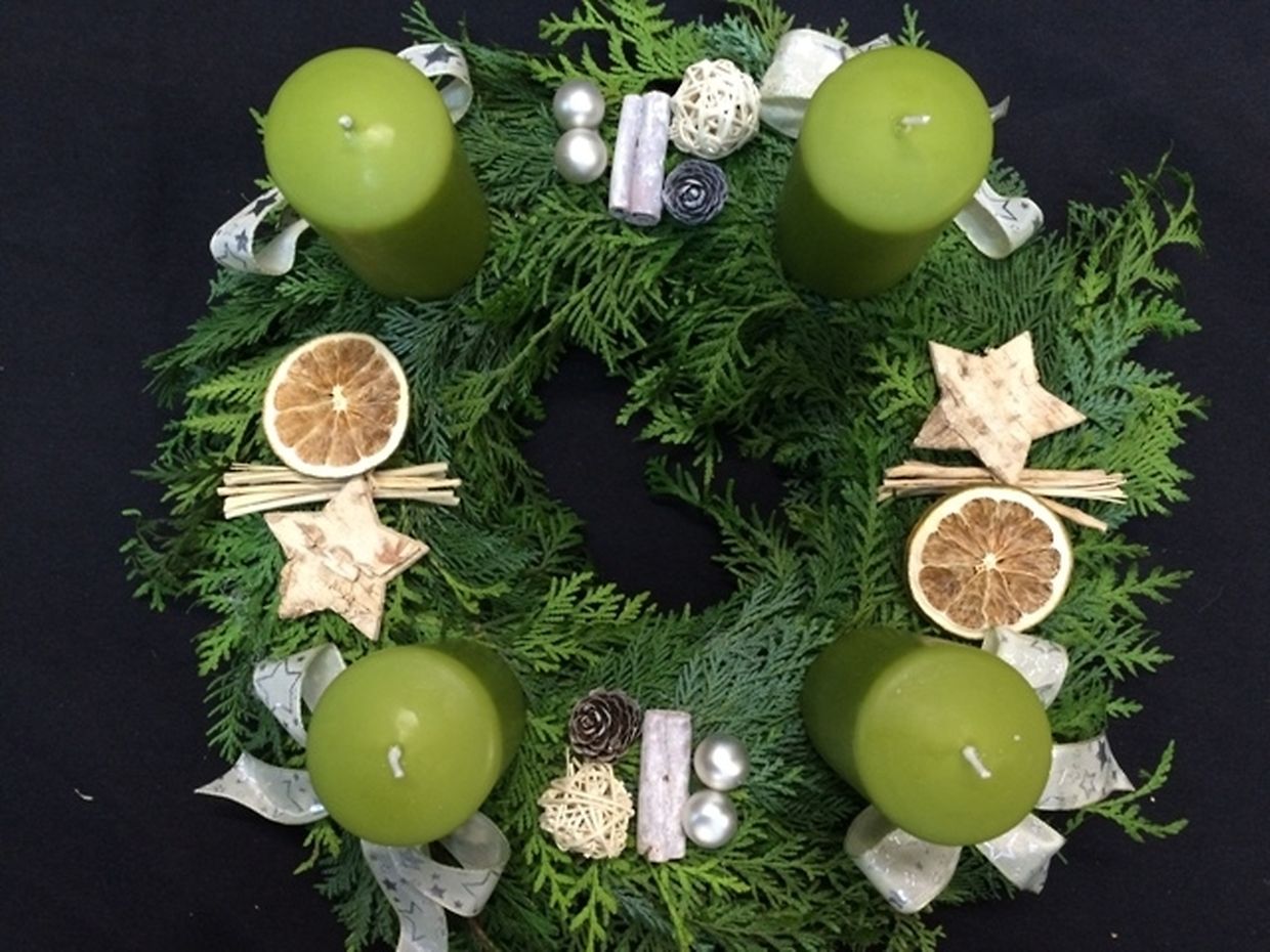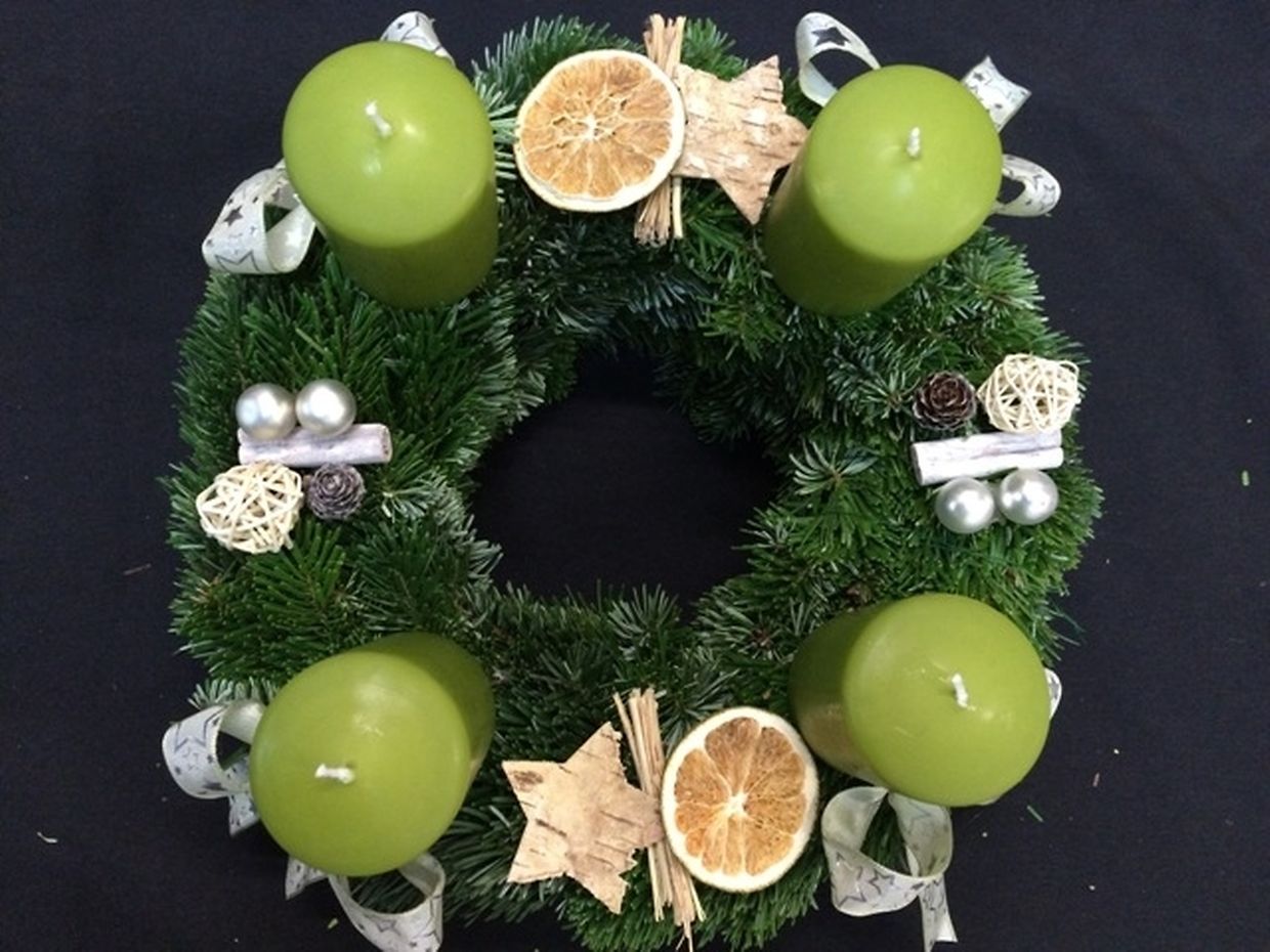 Zur Auswiel stinn verschidden Faarwen Käerzen an zwou Zorte Gréngs (Thuja an Dänn).